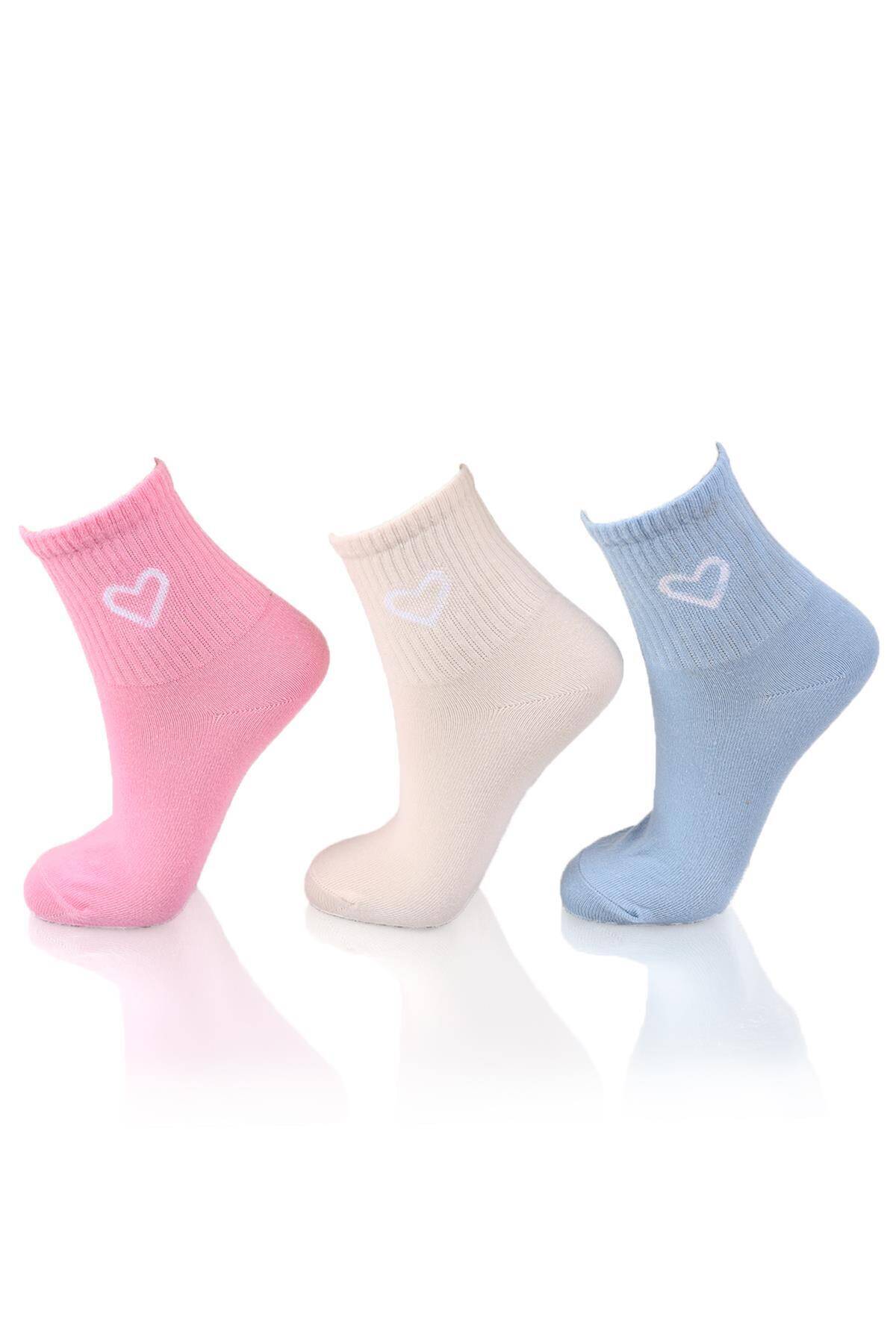1100 3'lü Kalp Detay Tenis Yarım Konç Çorap Pembe-Mavi-Bej
