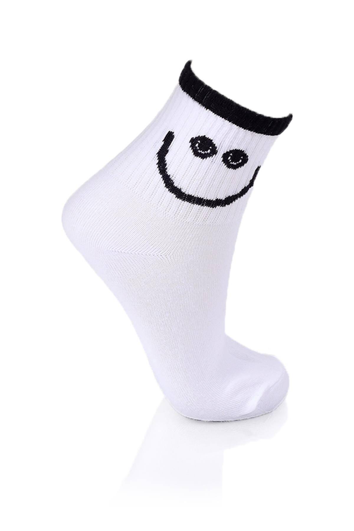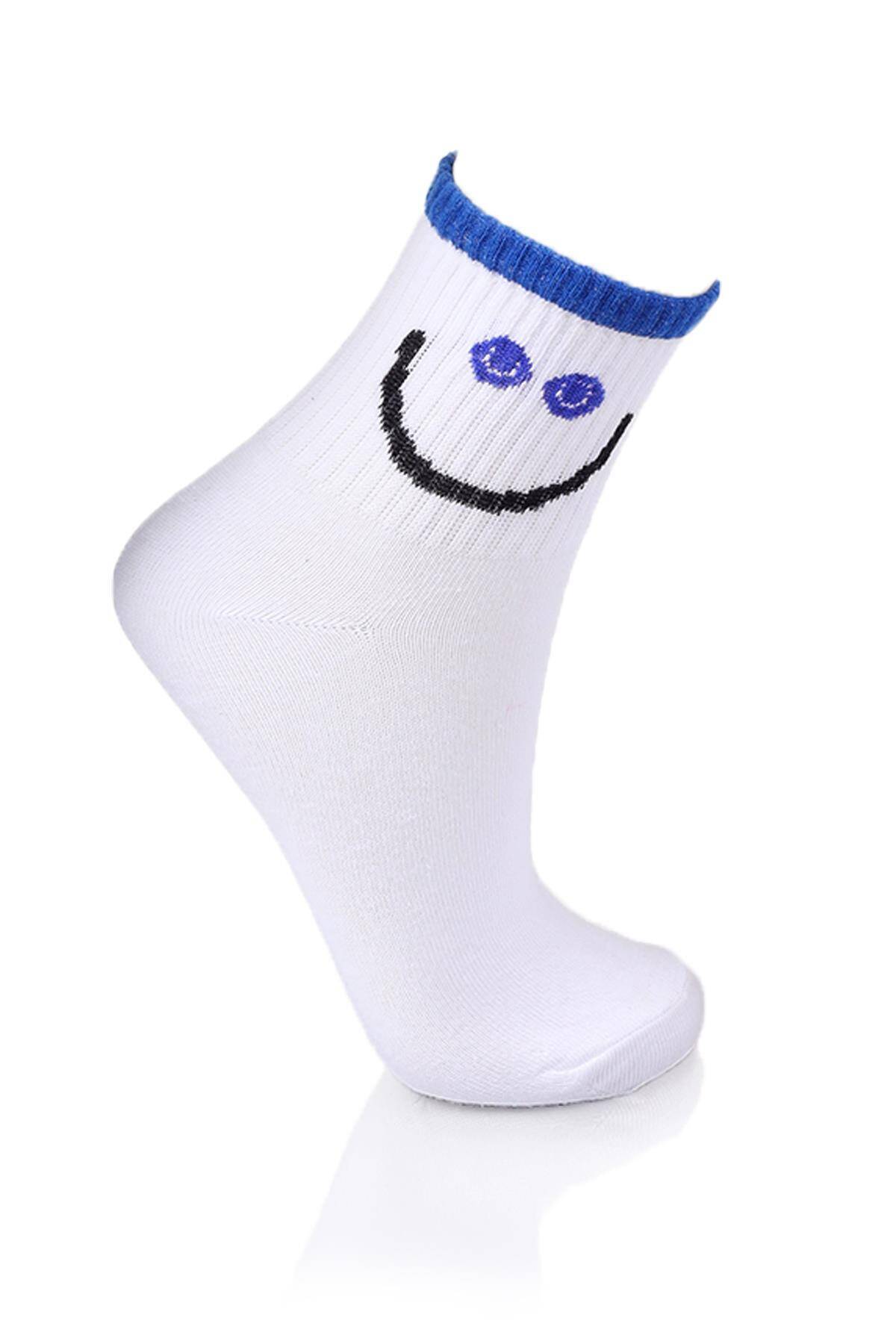 1102 Smile Baskı 3'lü Yarım Konç Çorap Beyaz-Siyah-Mavi