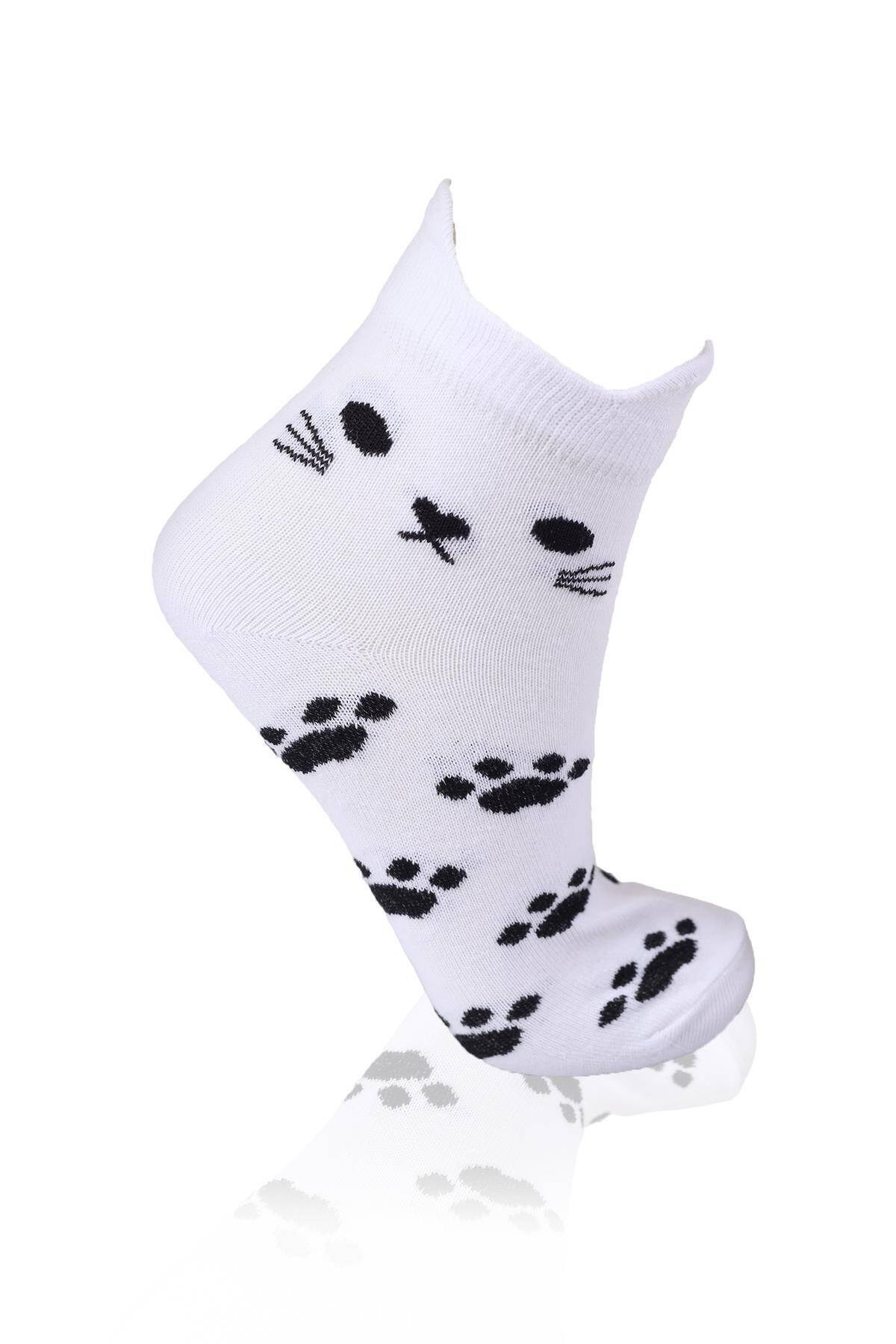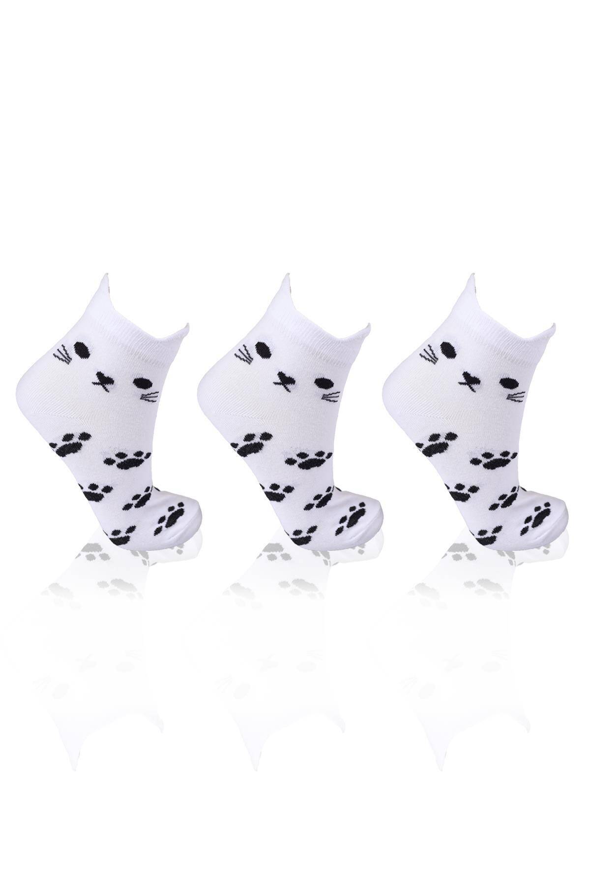 1105 Üç Boyutlu Kedili 3'lü Patik Çorap Beyaz