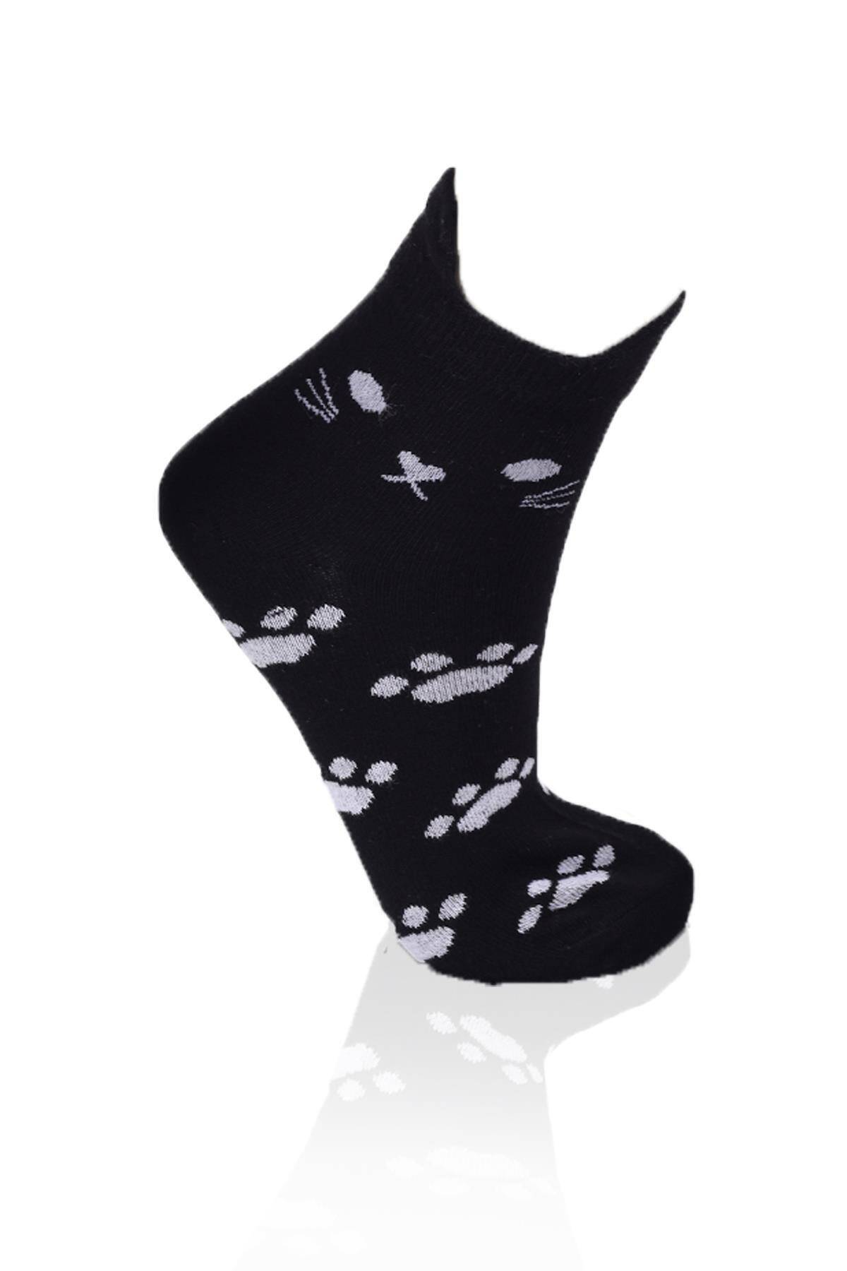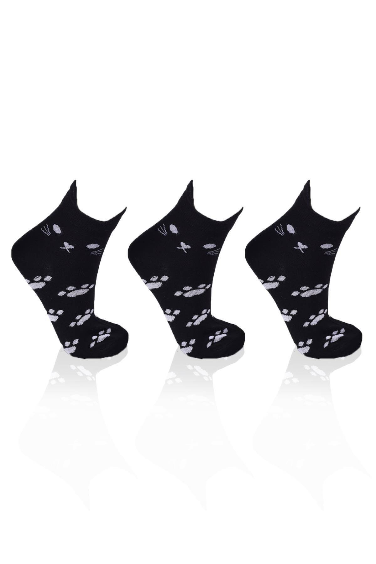 1105 Üç Boyutlu Kedili 3'lü Patik Çorap Siyah