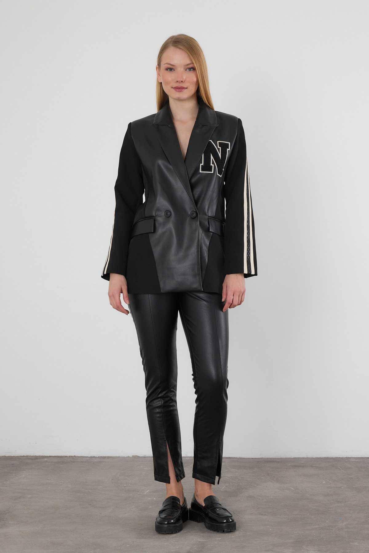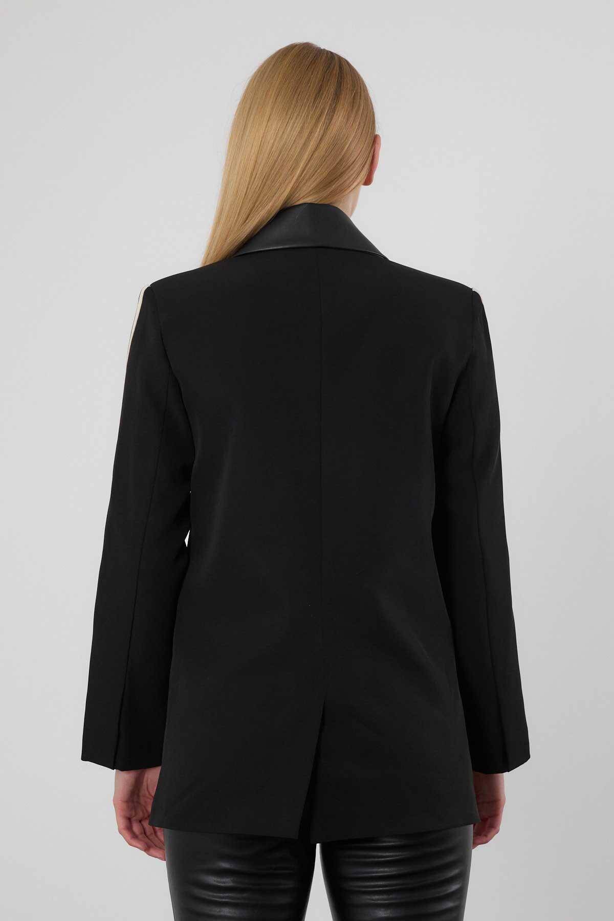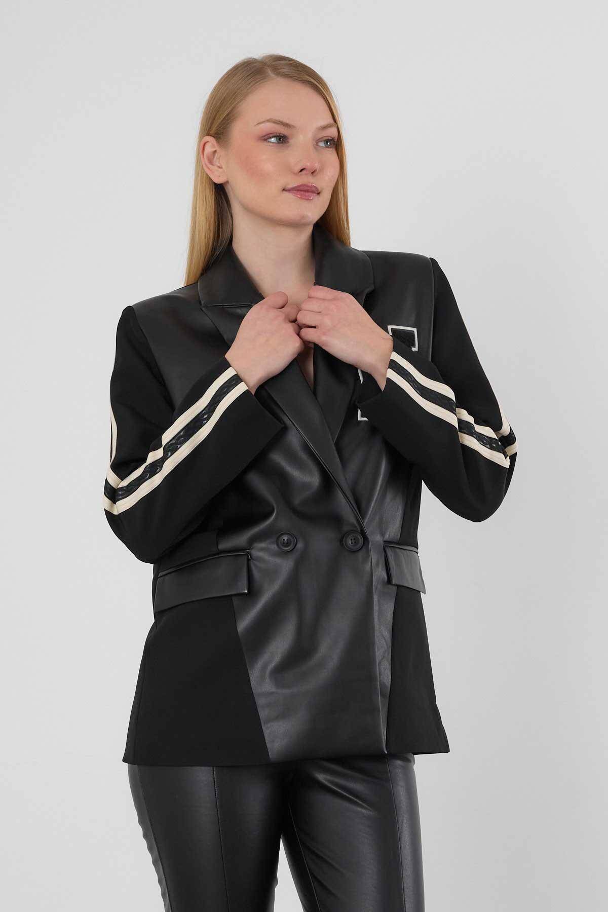 1932 Kolları Şeritli Deri Garnili Atlas Ceket Siyah
