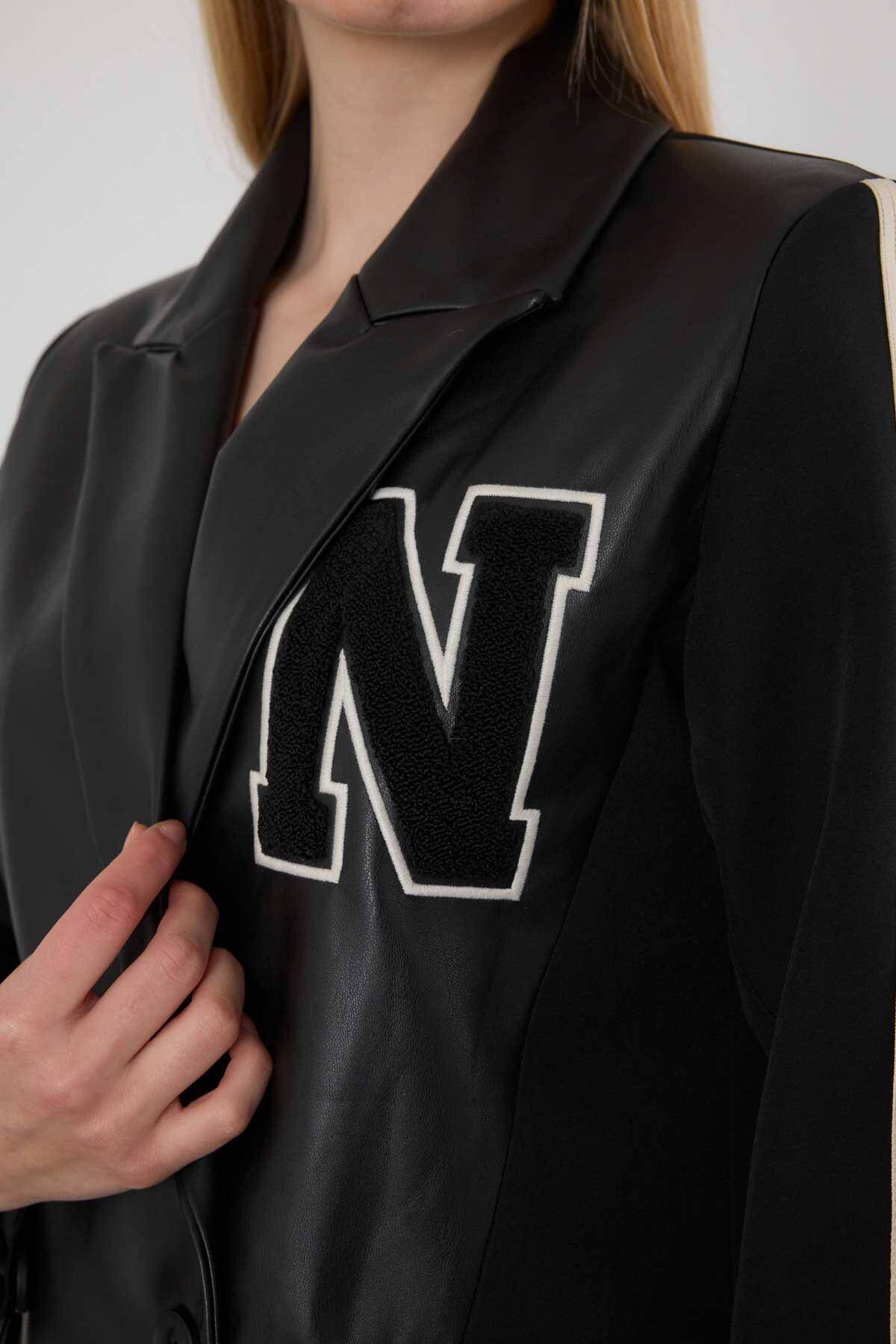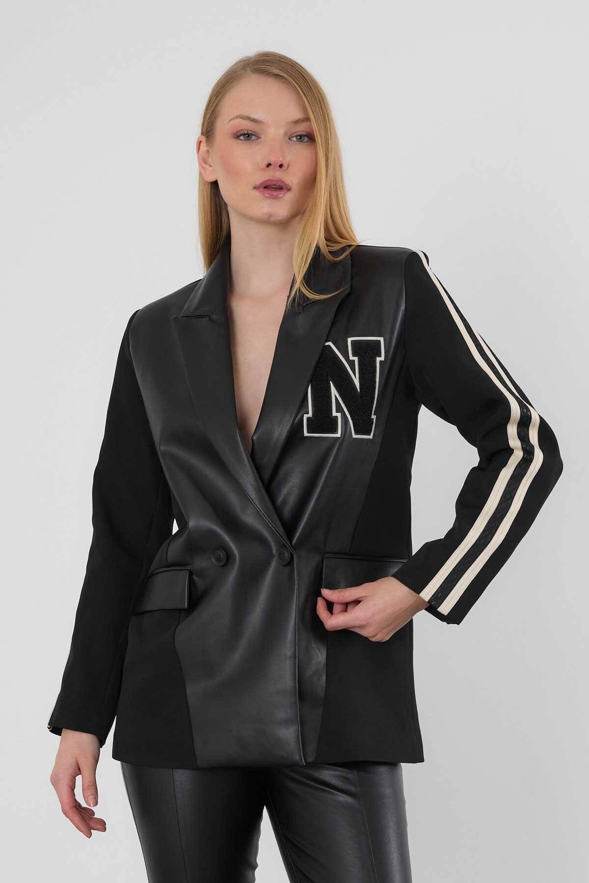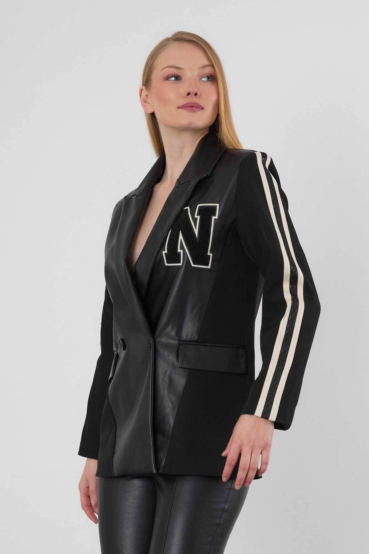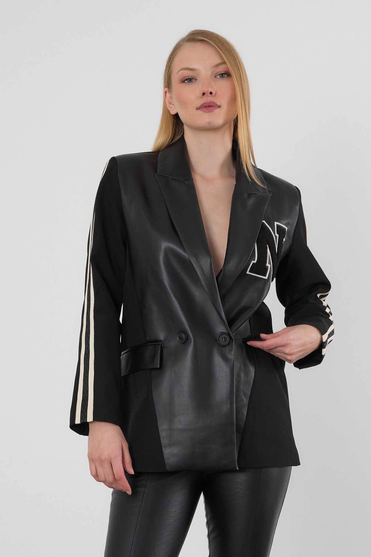1932 Kolları Şeritli Deri Garnili Atlas Ceket Siyah