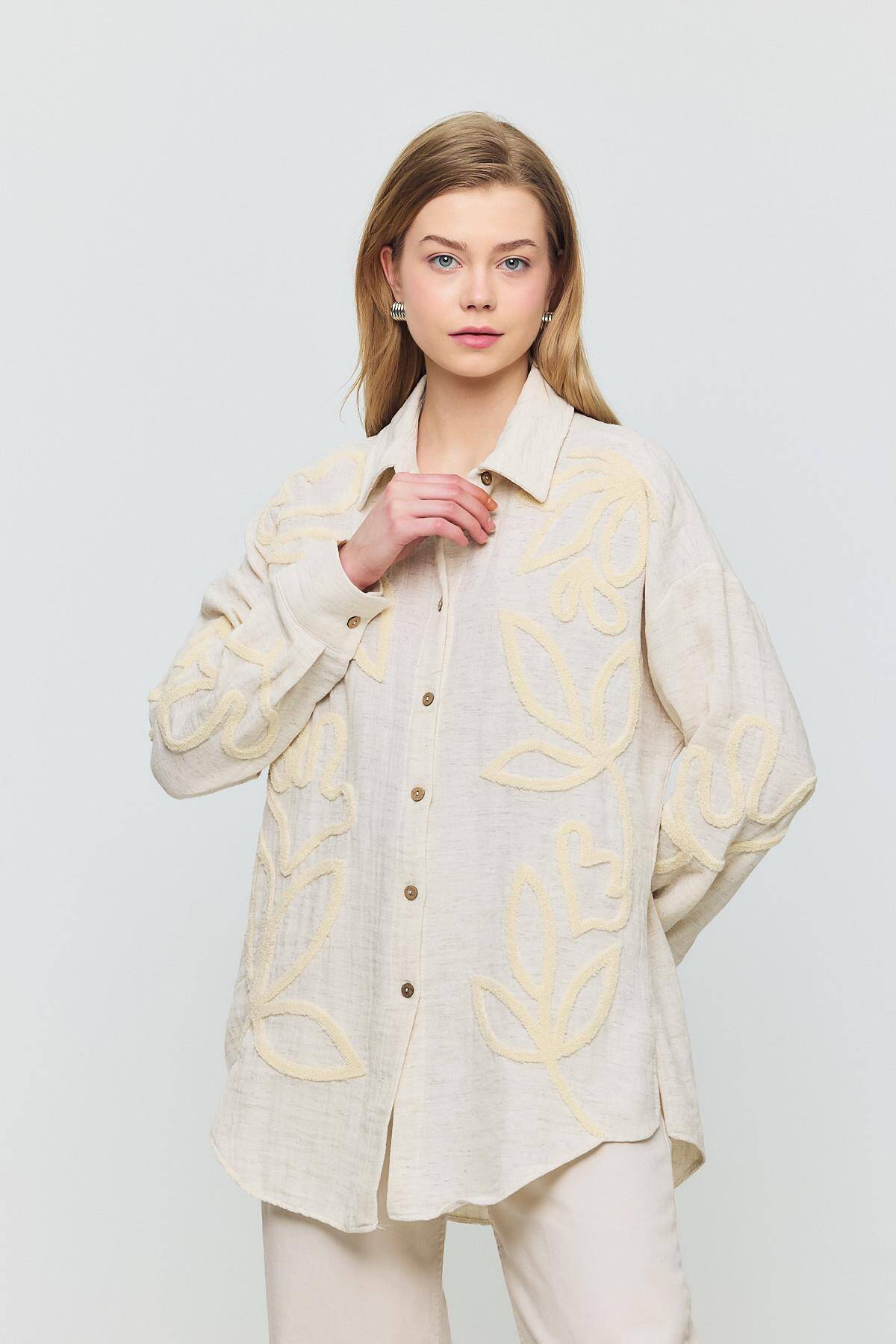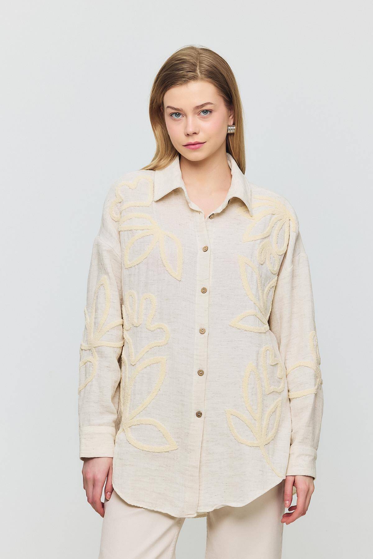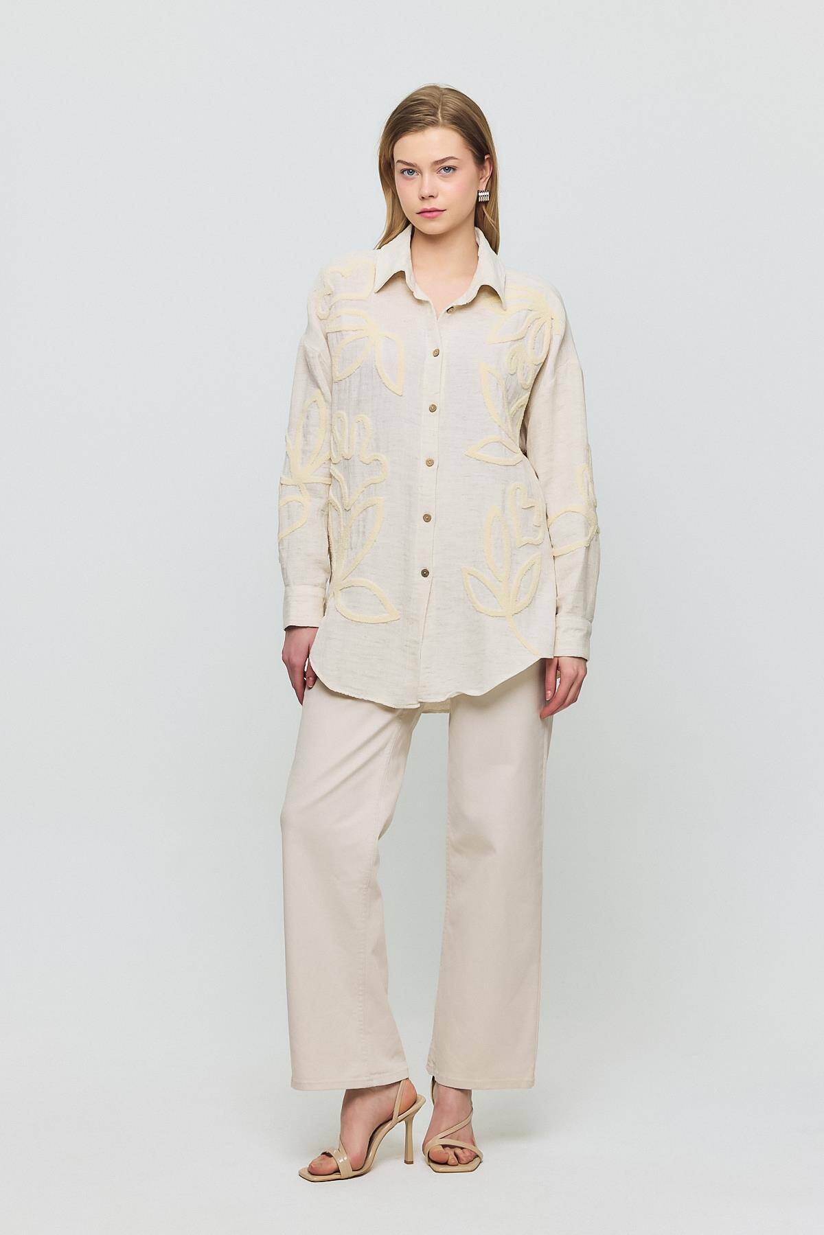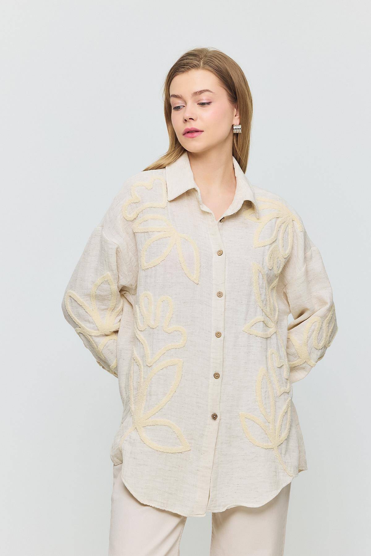 2004 Önü Yaprak Nakışlı Gömlek Bej