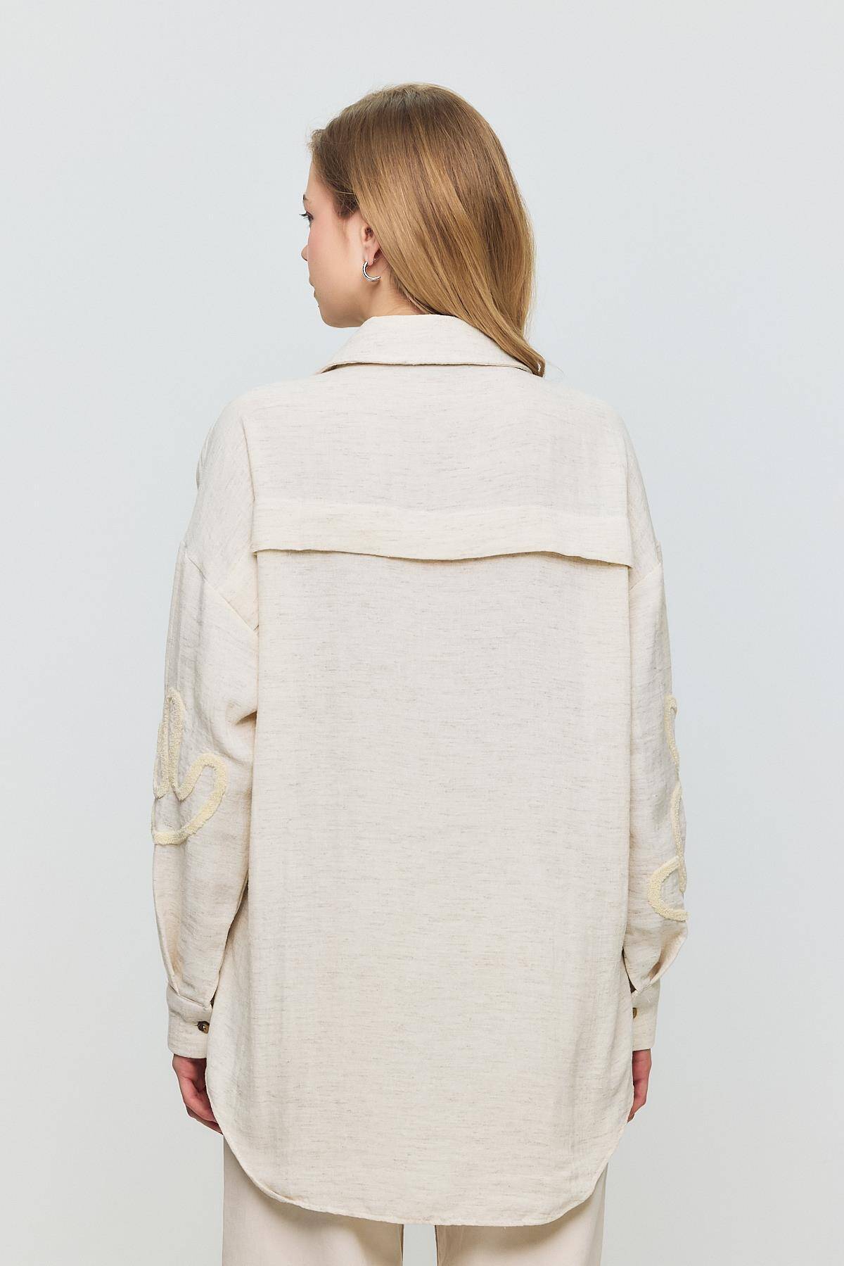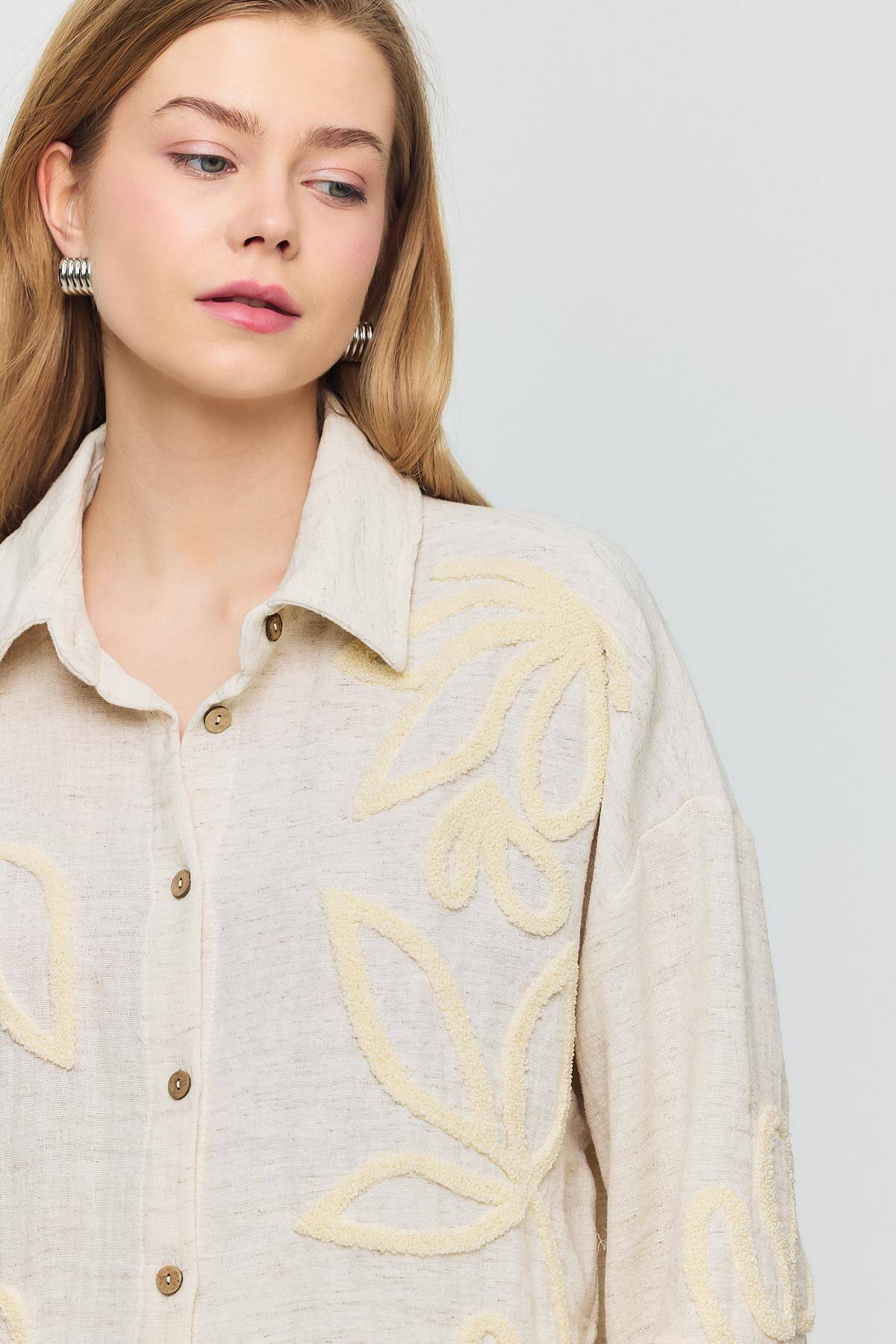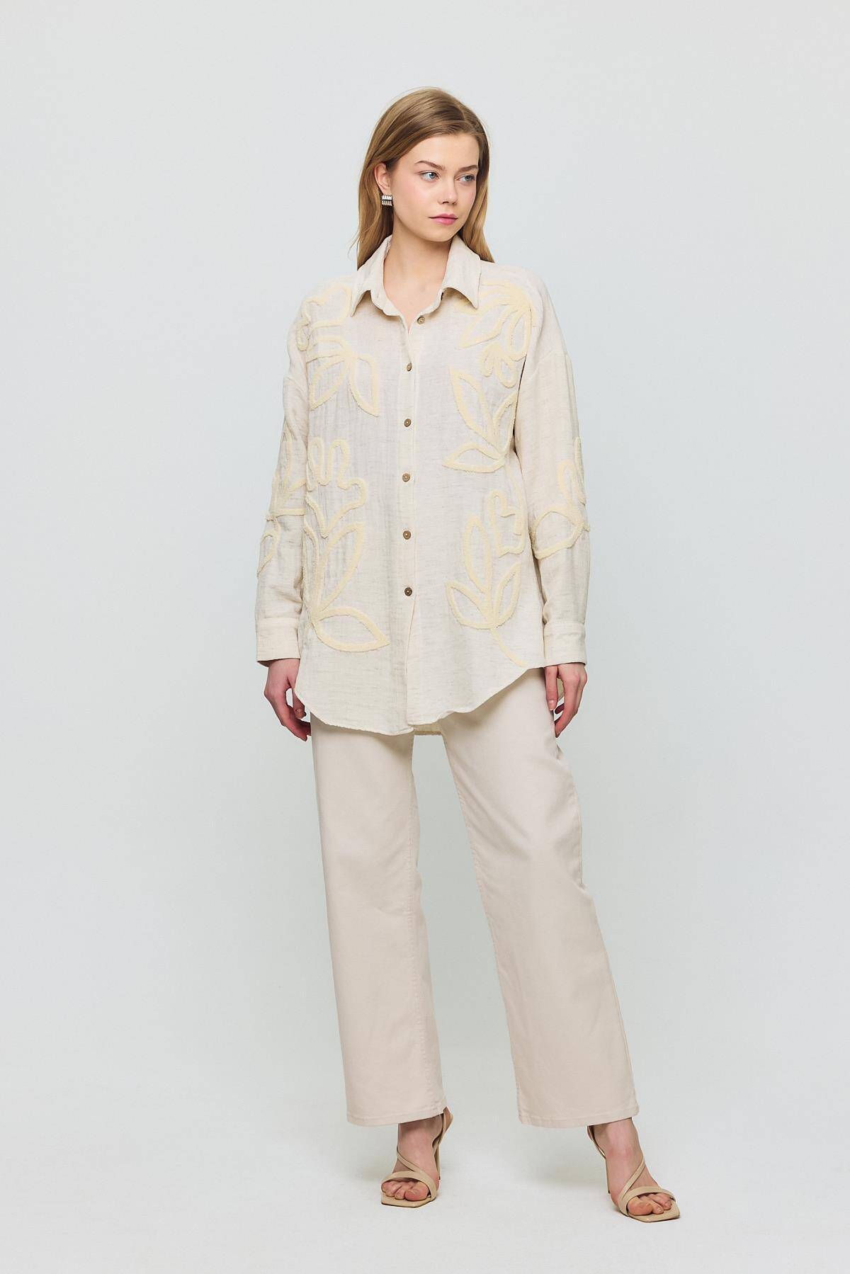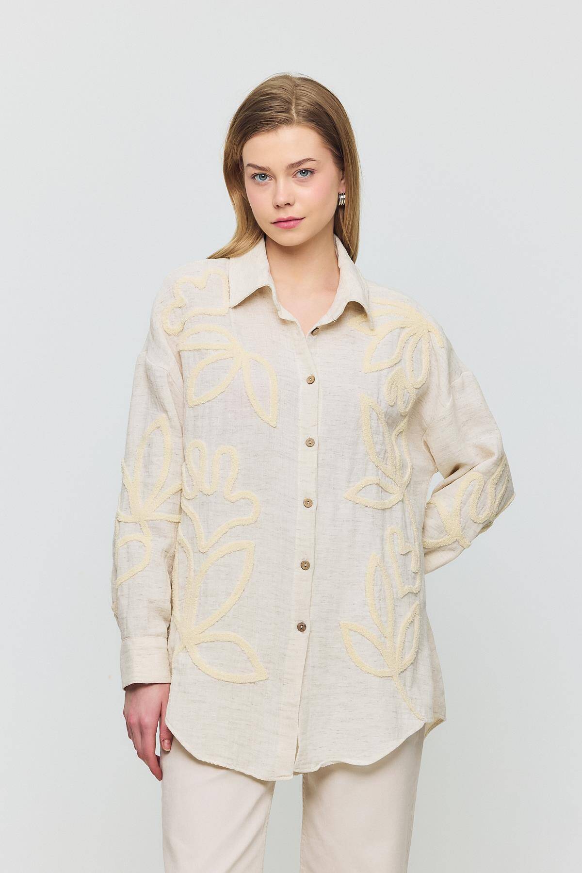 2004 Önü Yaprak Nakışlı Gömlek Bej