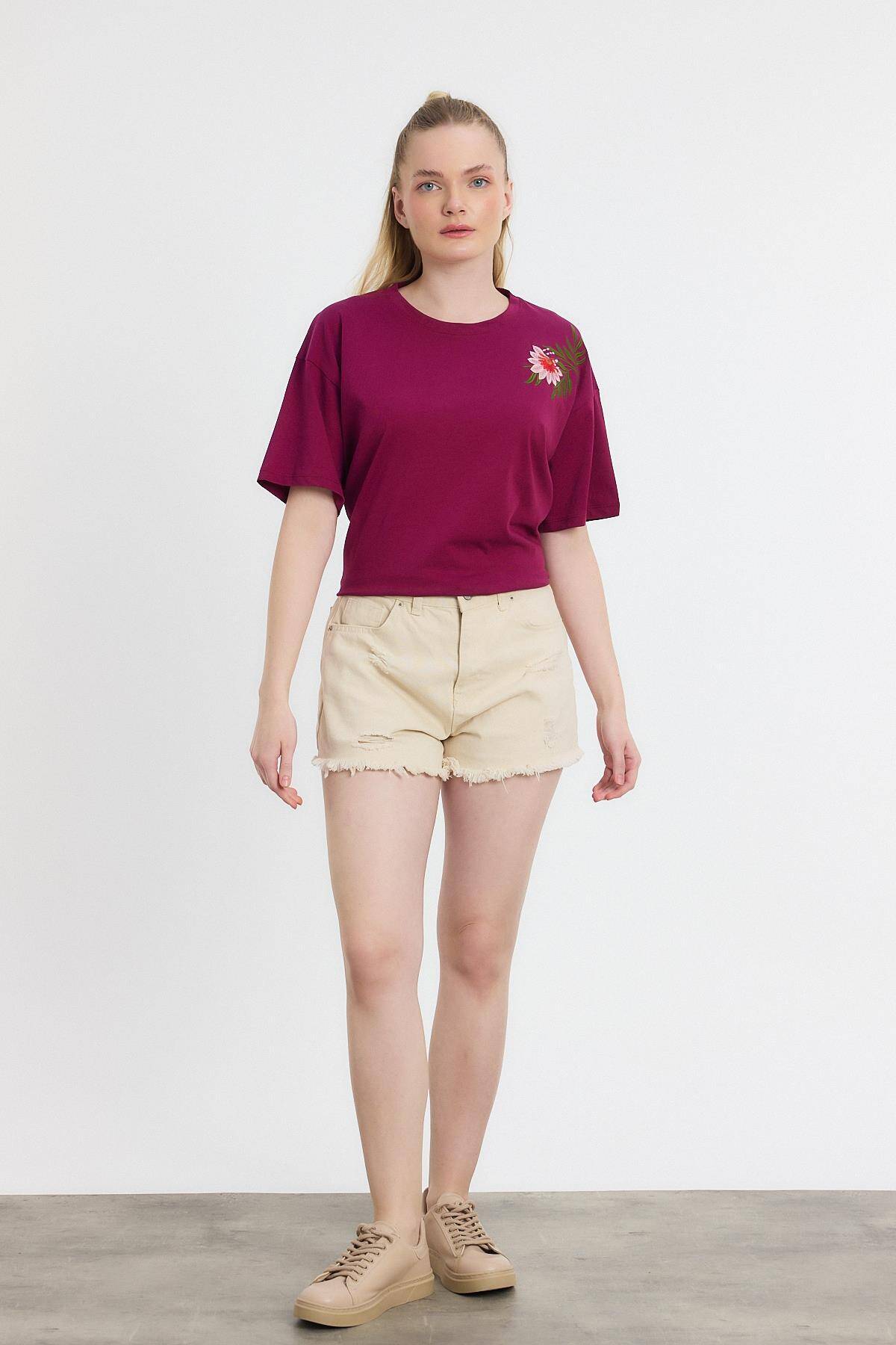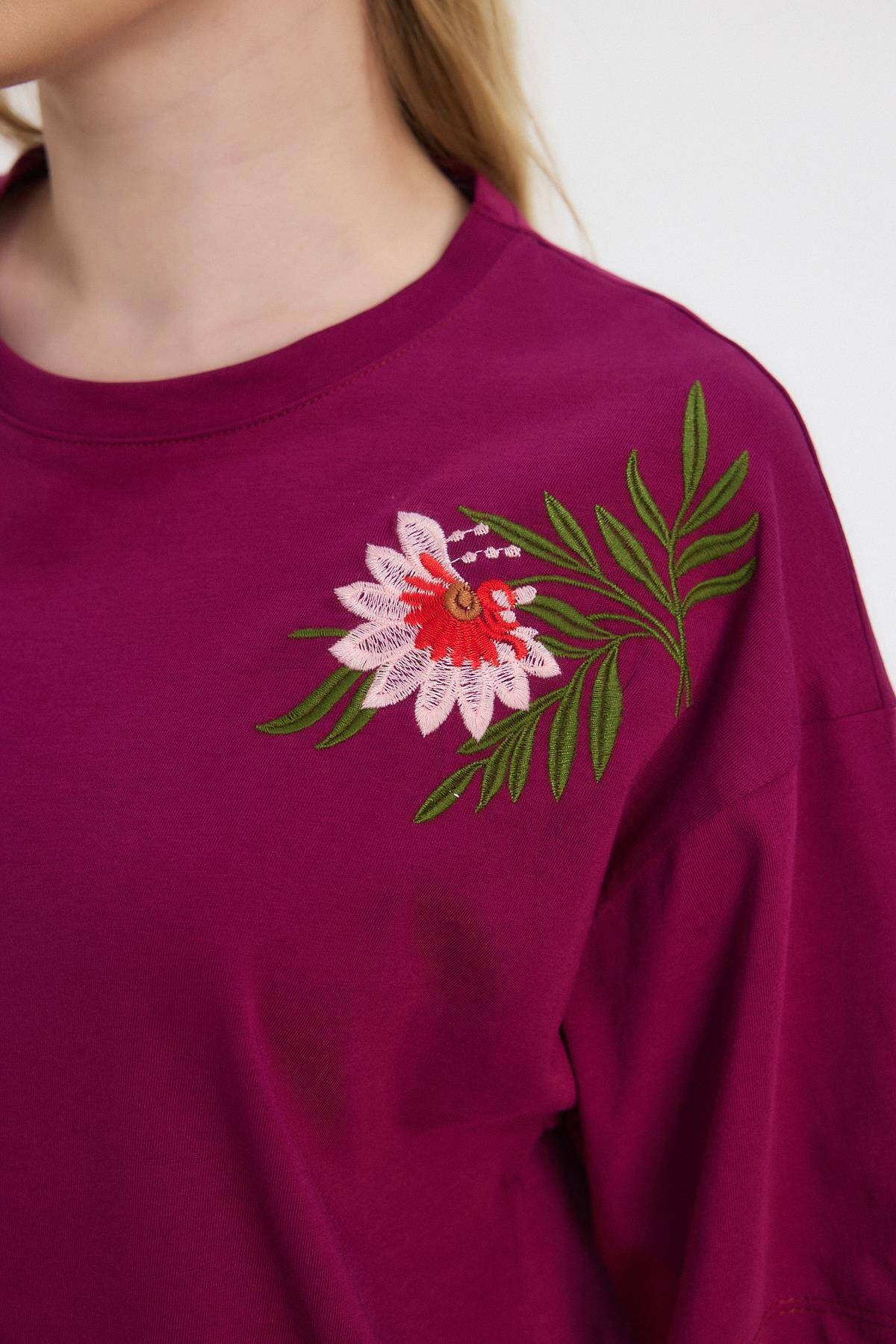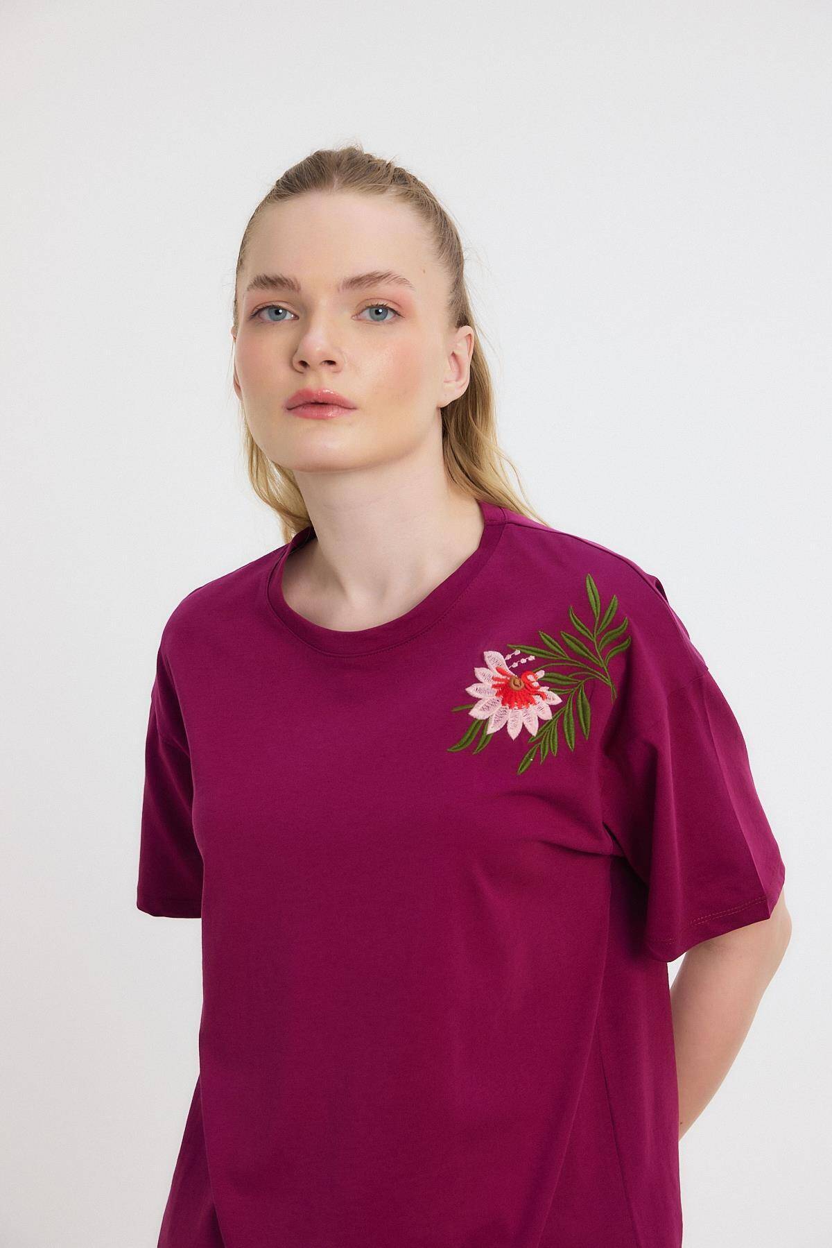 2150-21 Çiçek Nakışlı Tişört Bordo