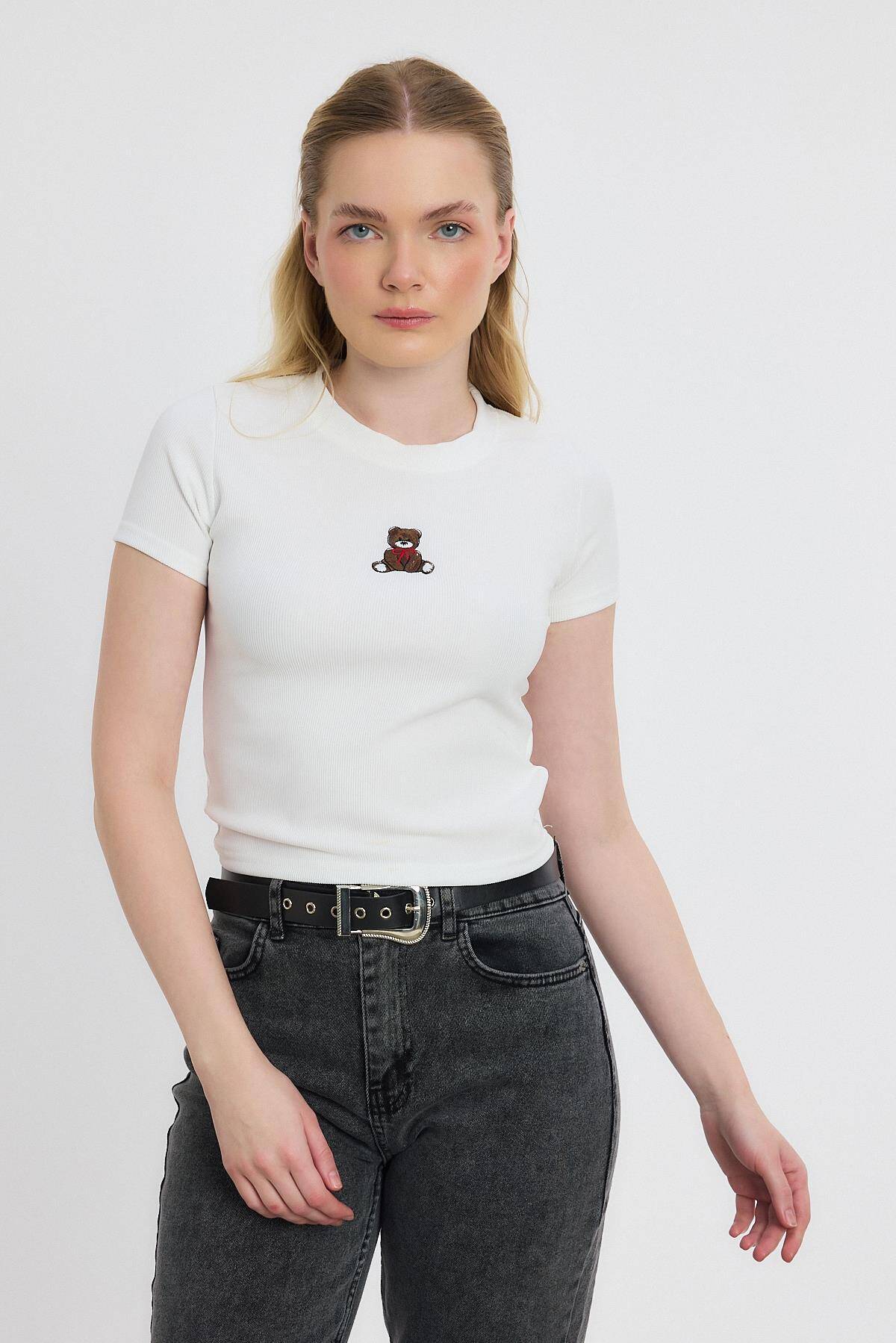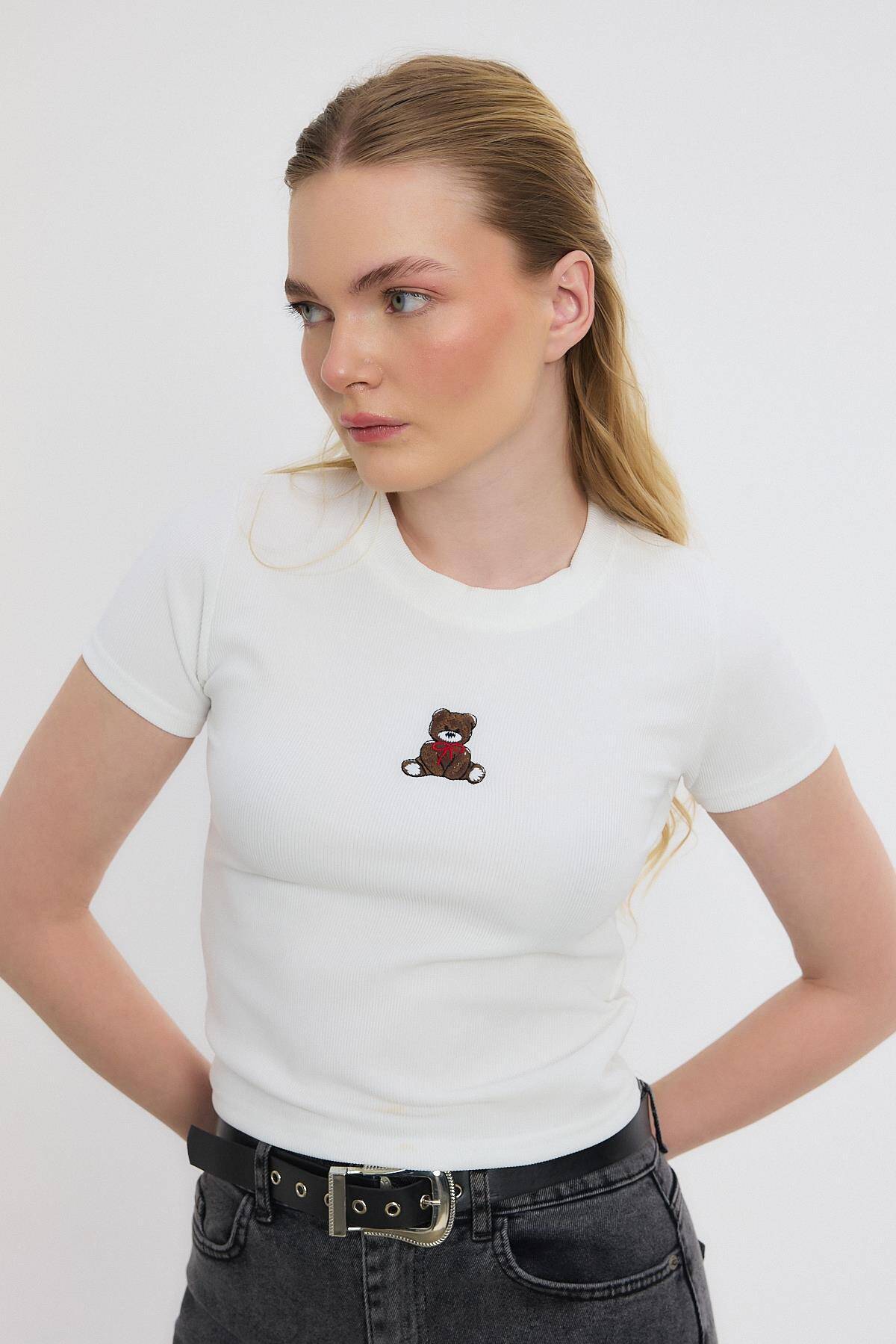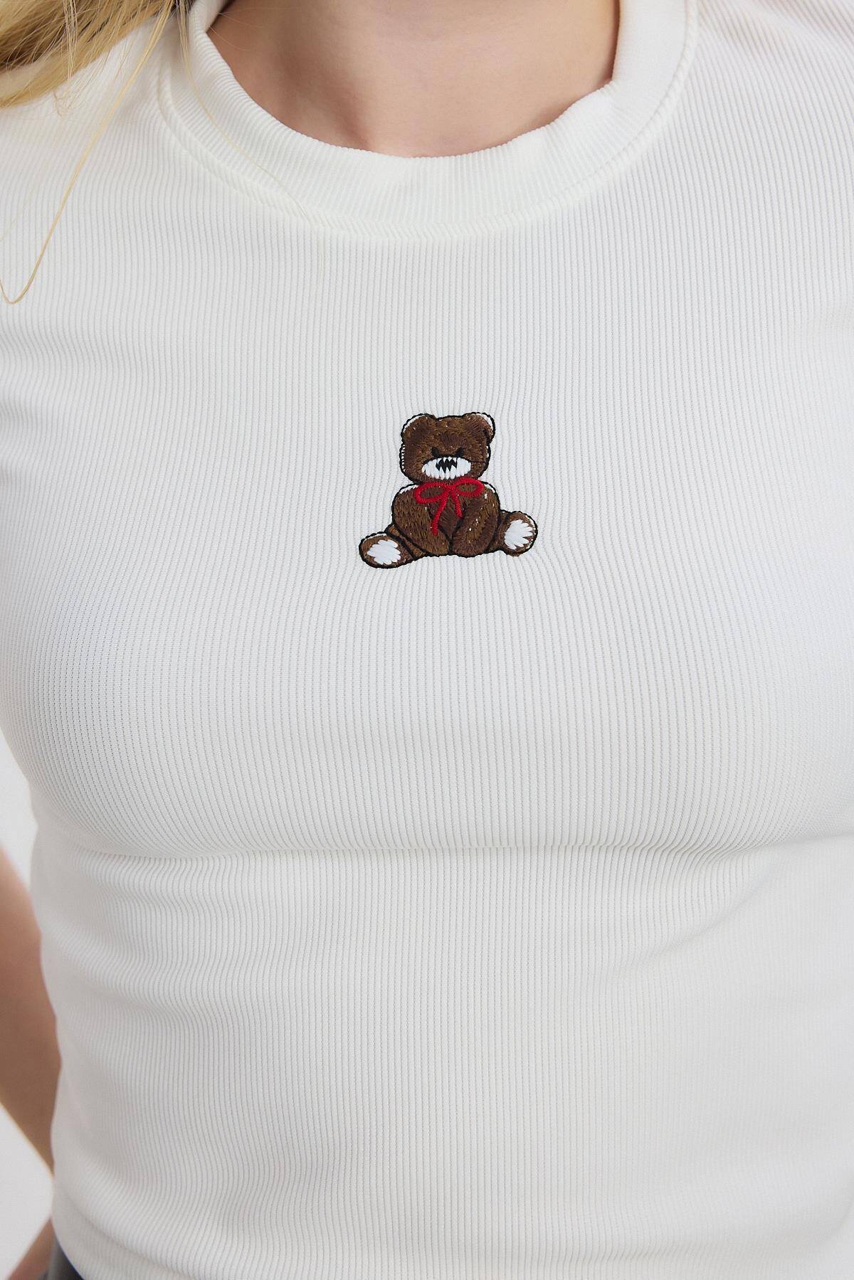 2199 Ayıcık Nakışlı Kısa Kol Bluz Ekru