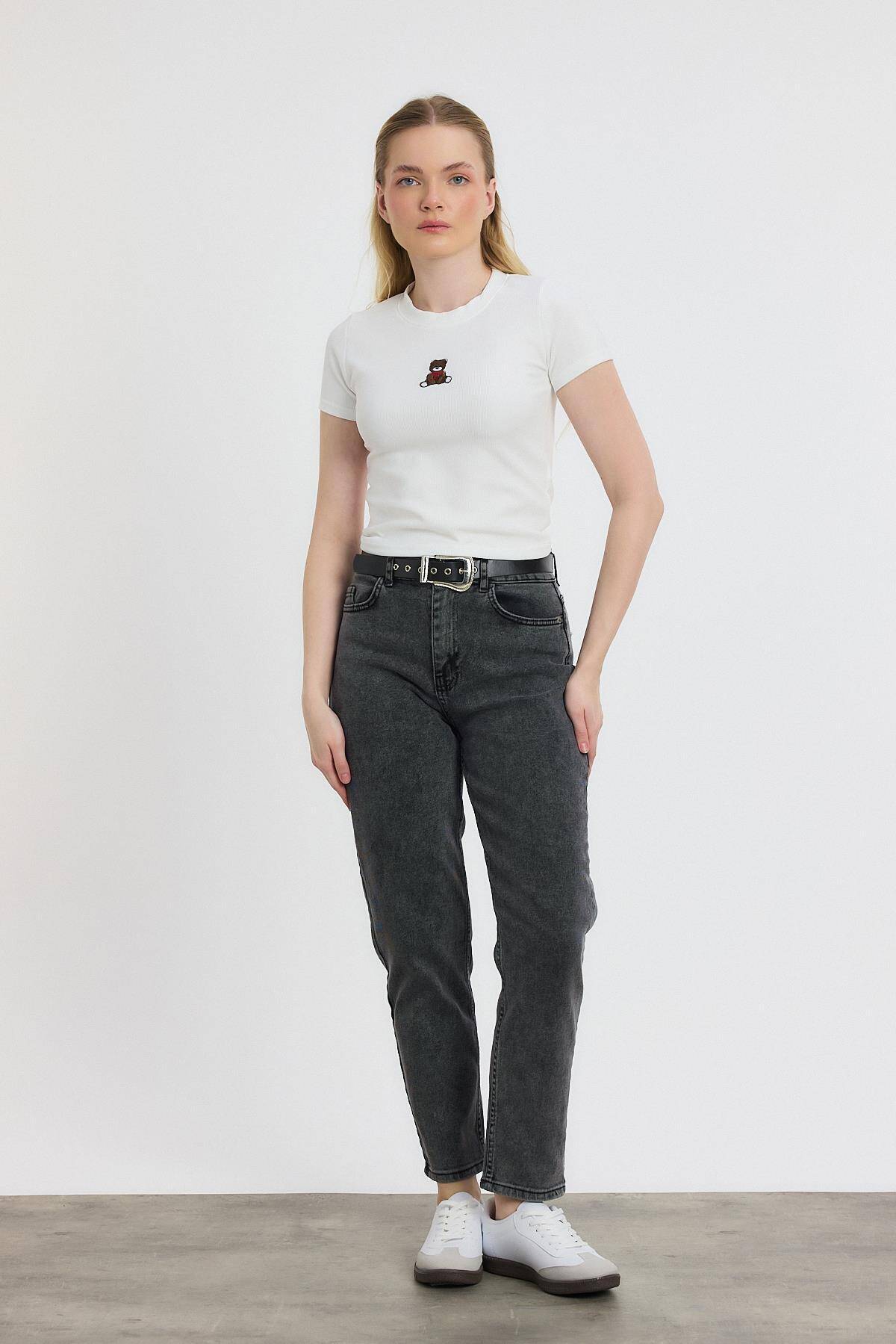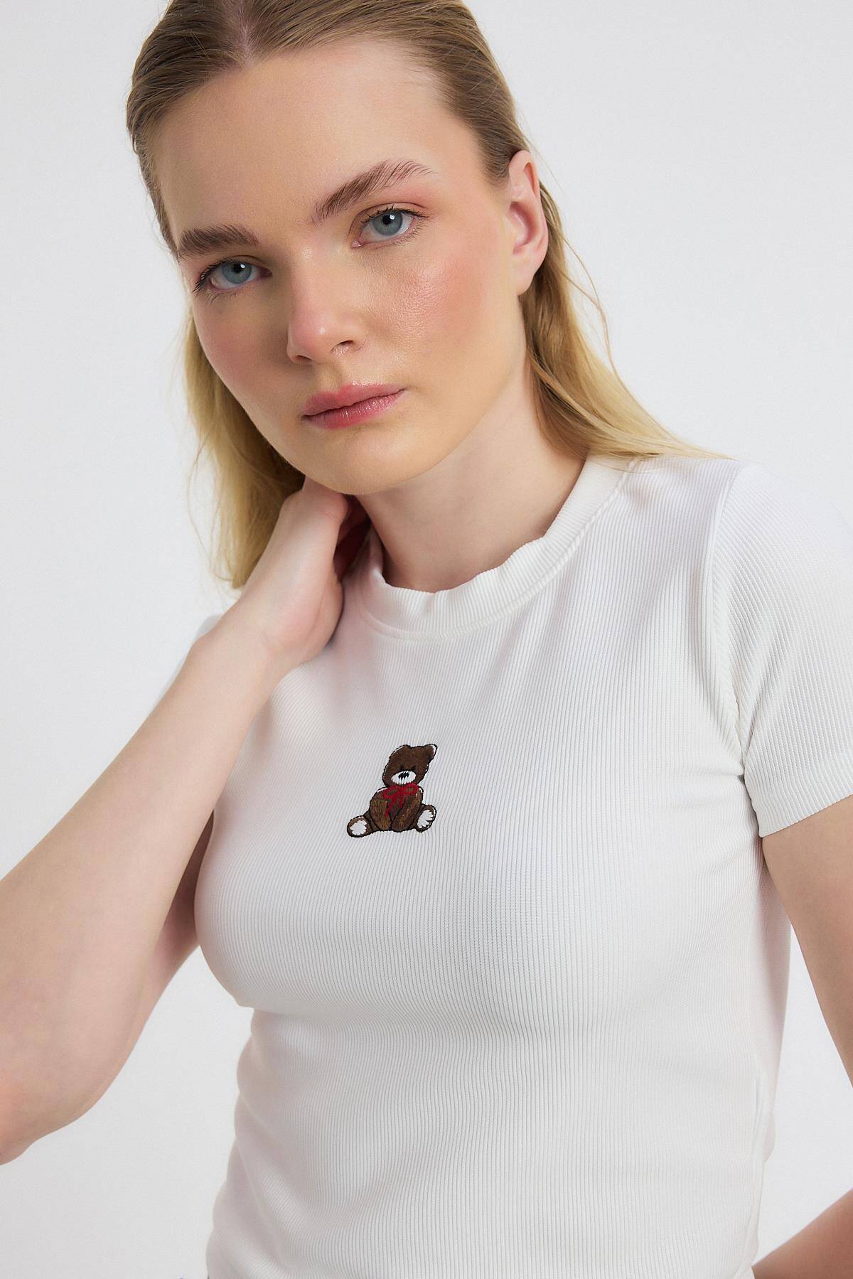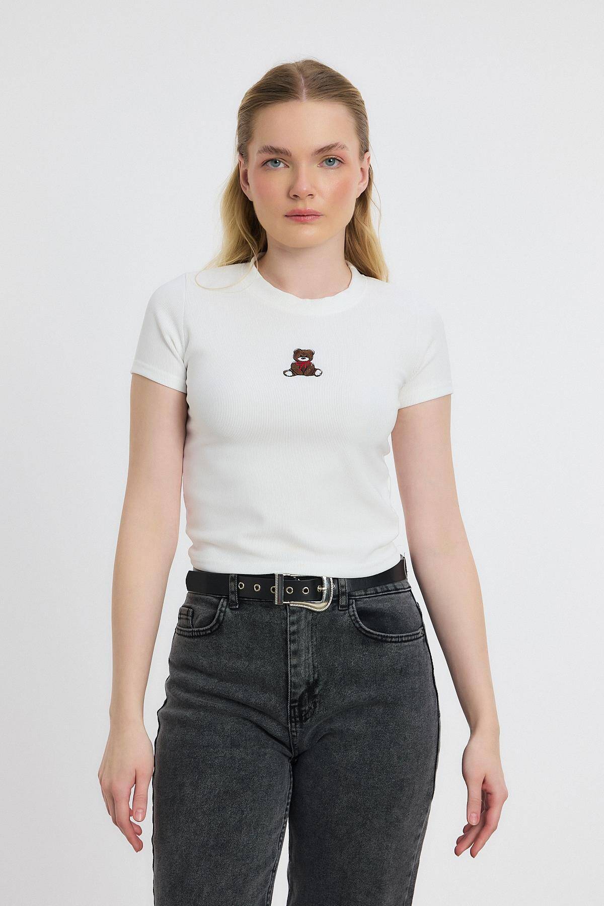 2199 Ayıcık Nakışlı Kısa Kol Bluz Ekru