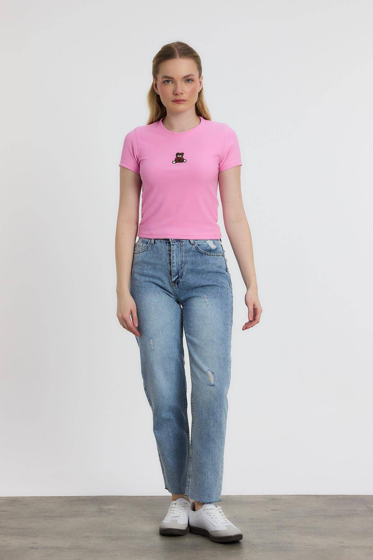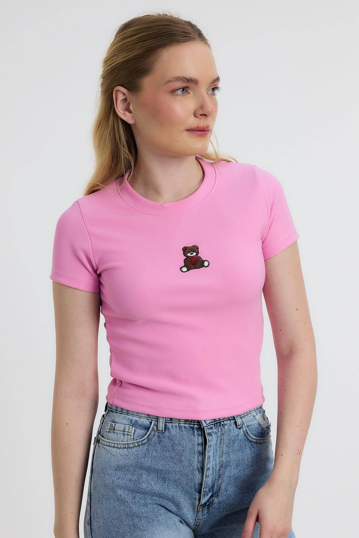 2199 Ayıcık Nakışlı Kısa Kol Bluz Pembe