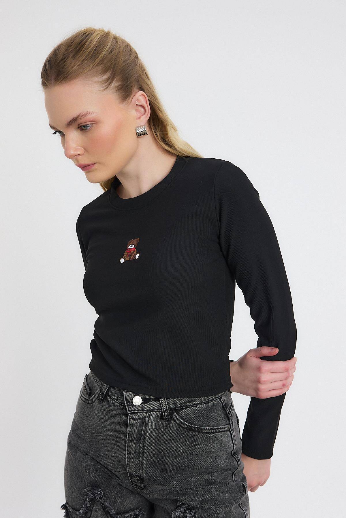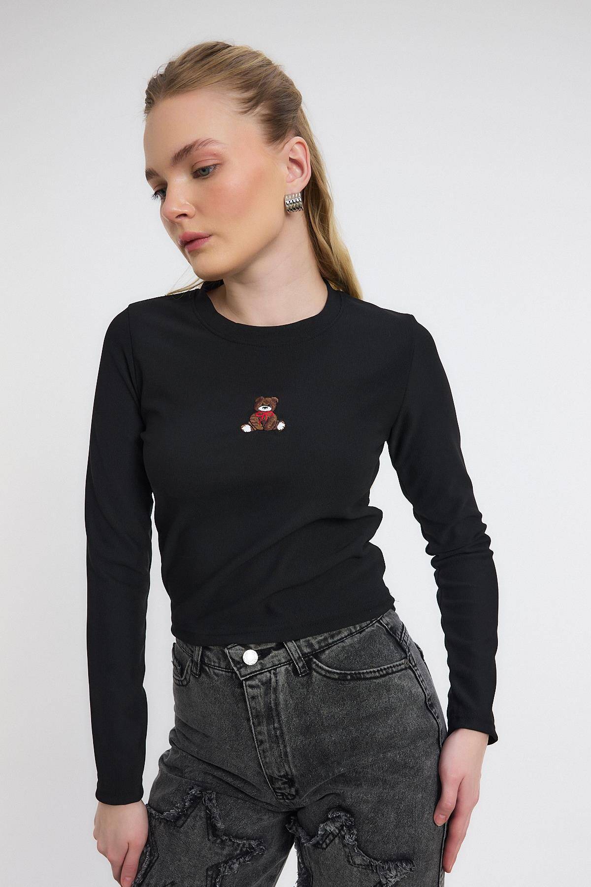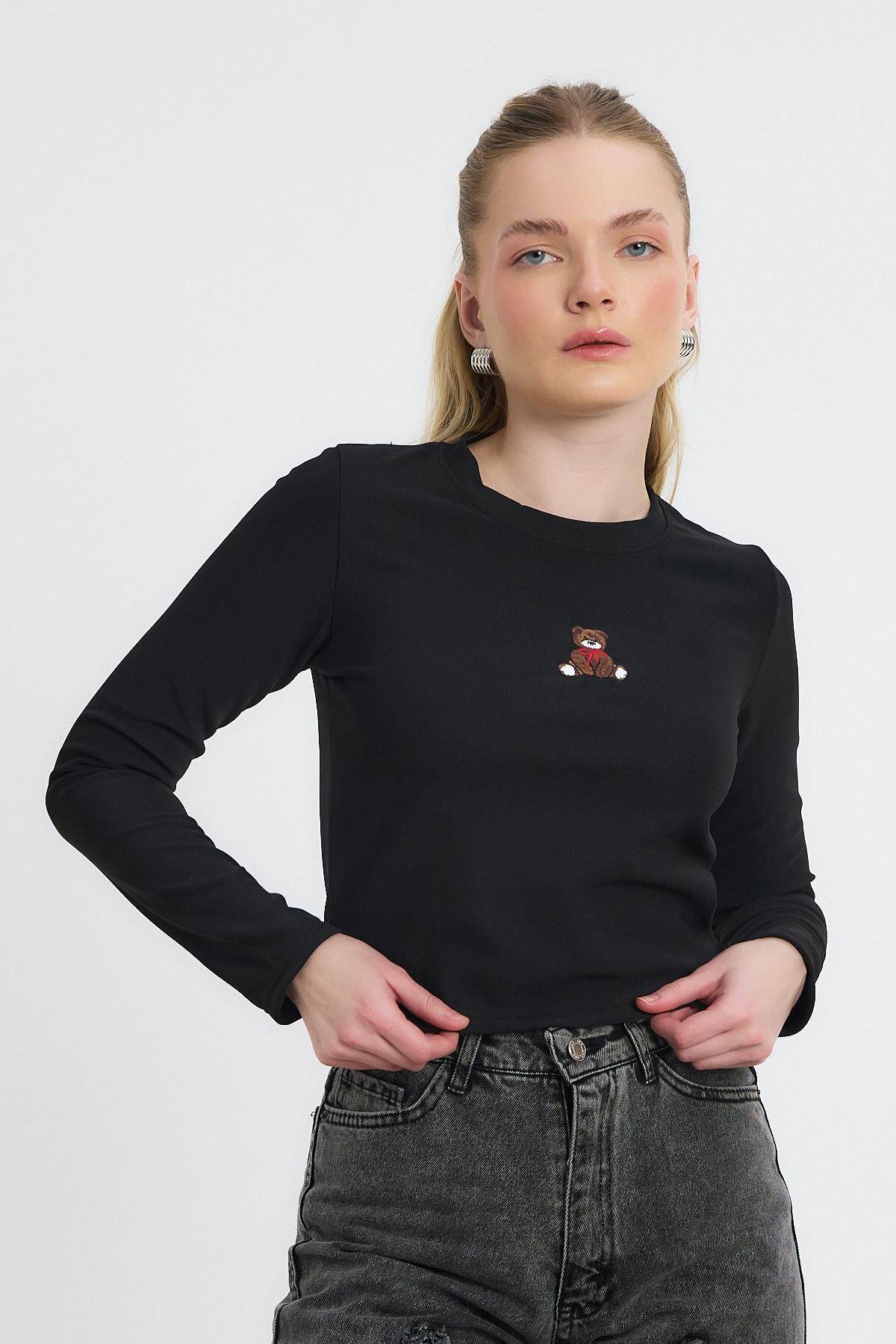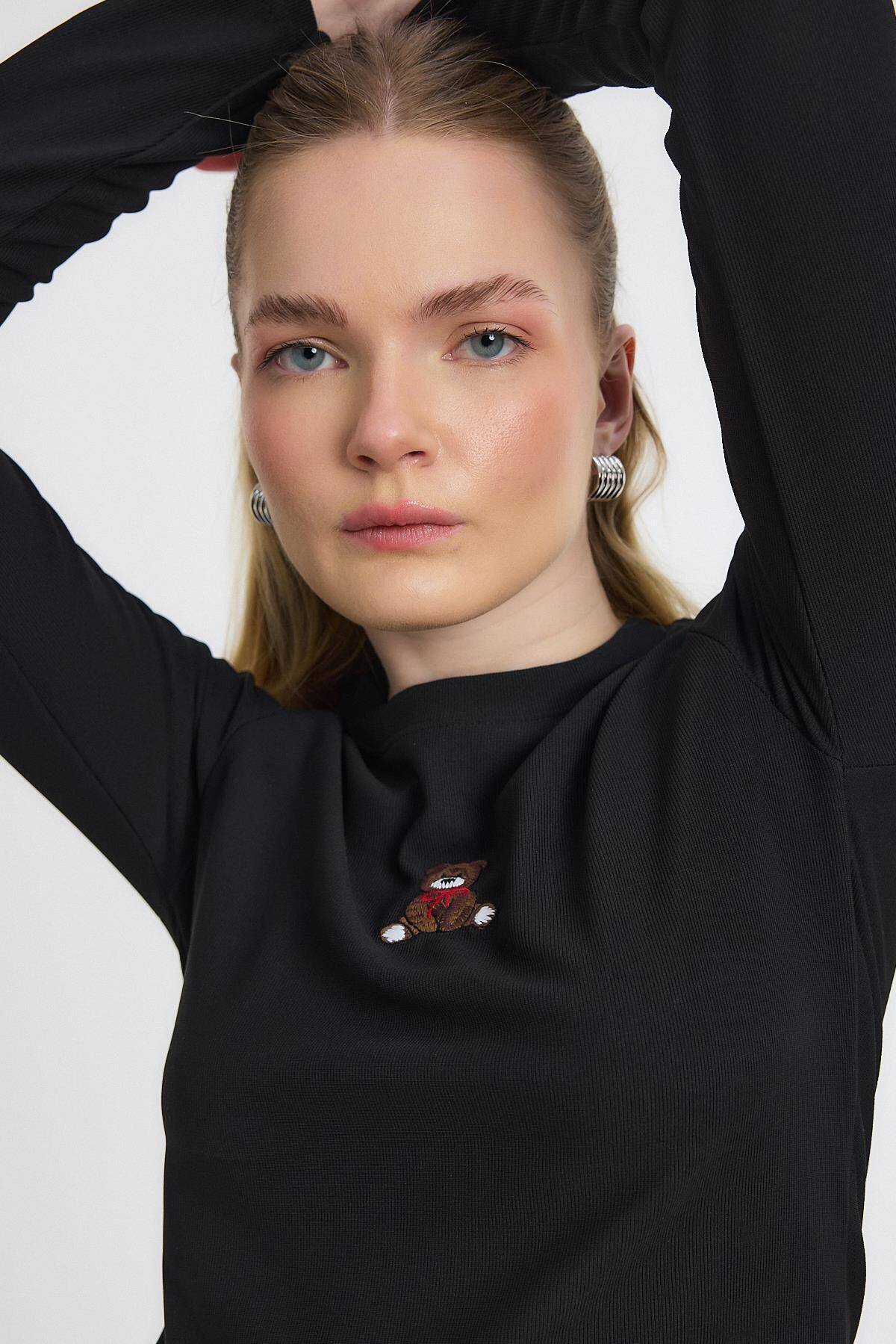 2200 Ayıcık Nakışlı Bisiklet Yaka Bluz Siyah