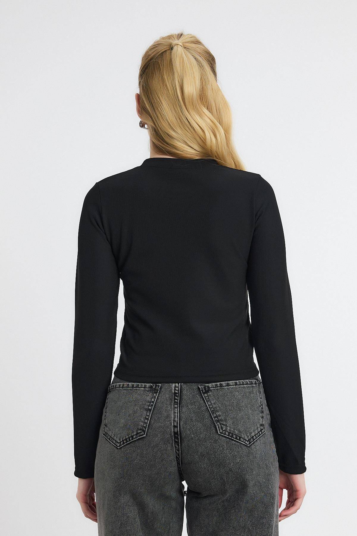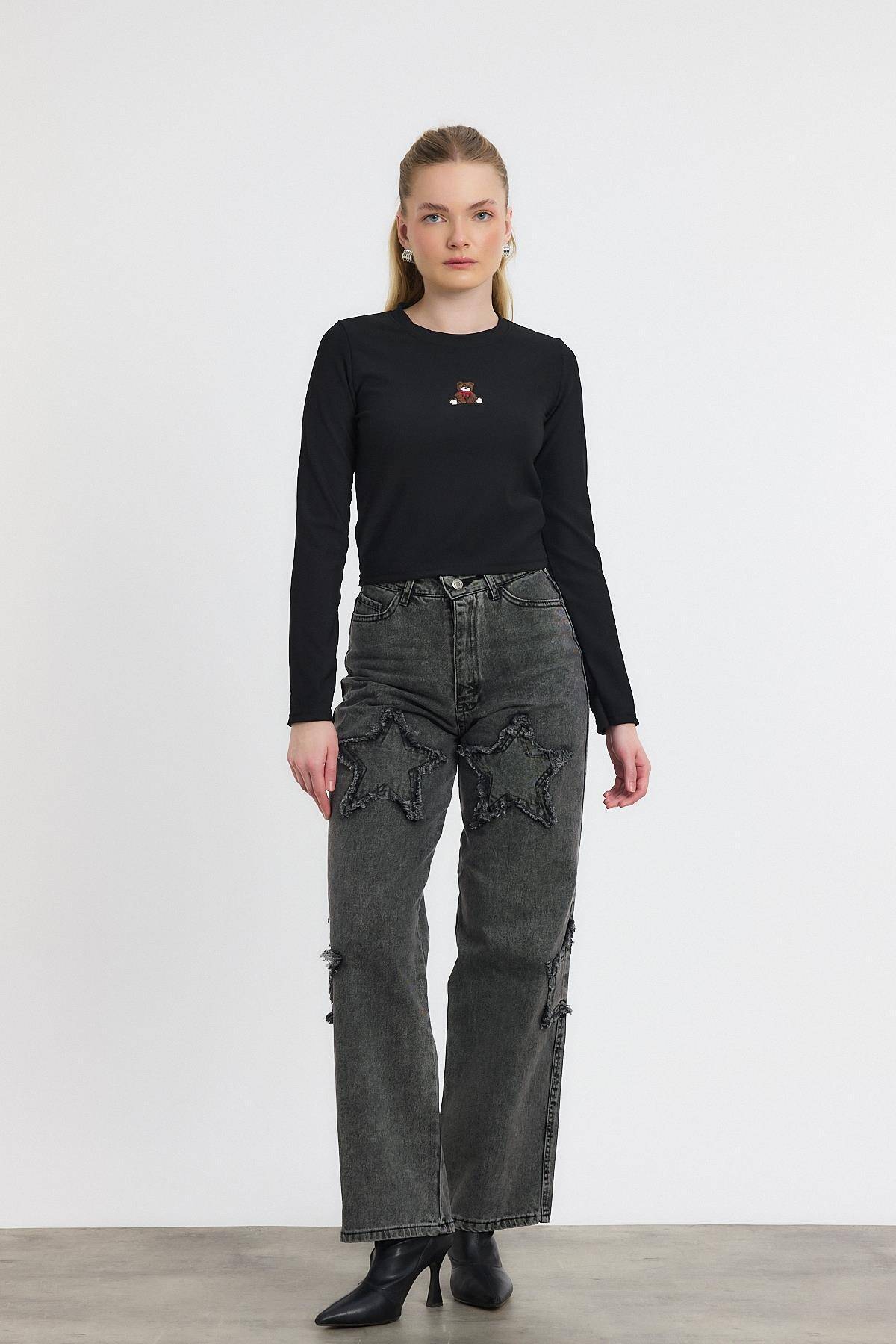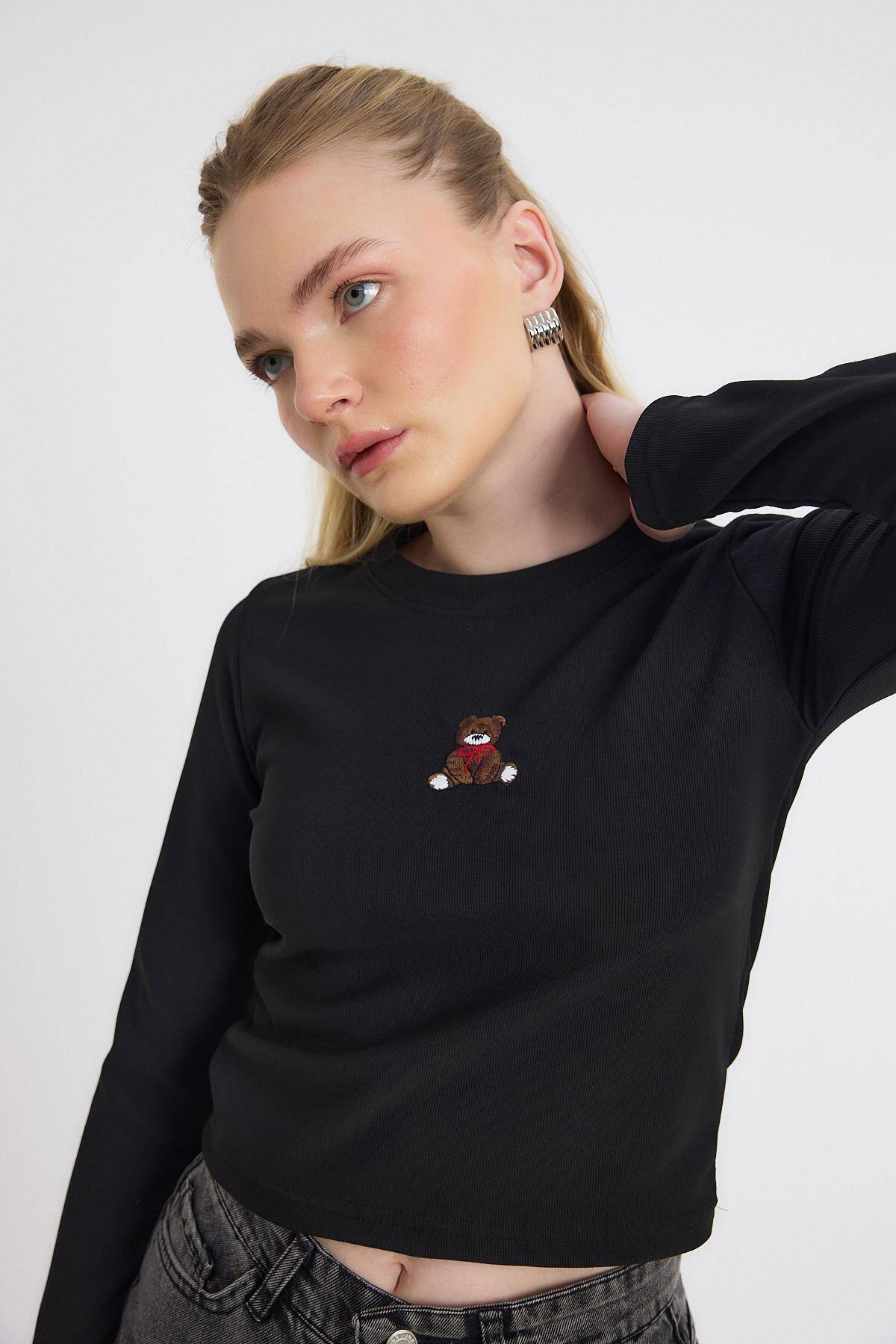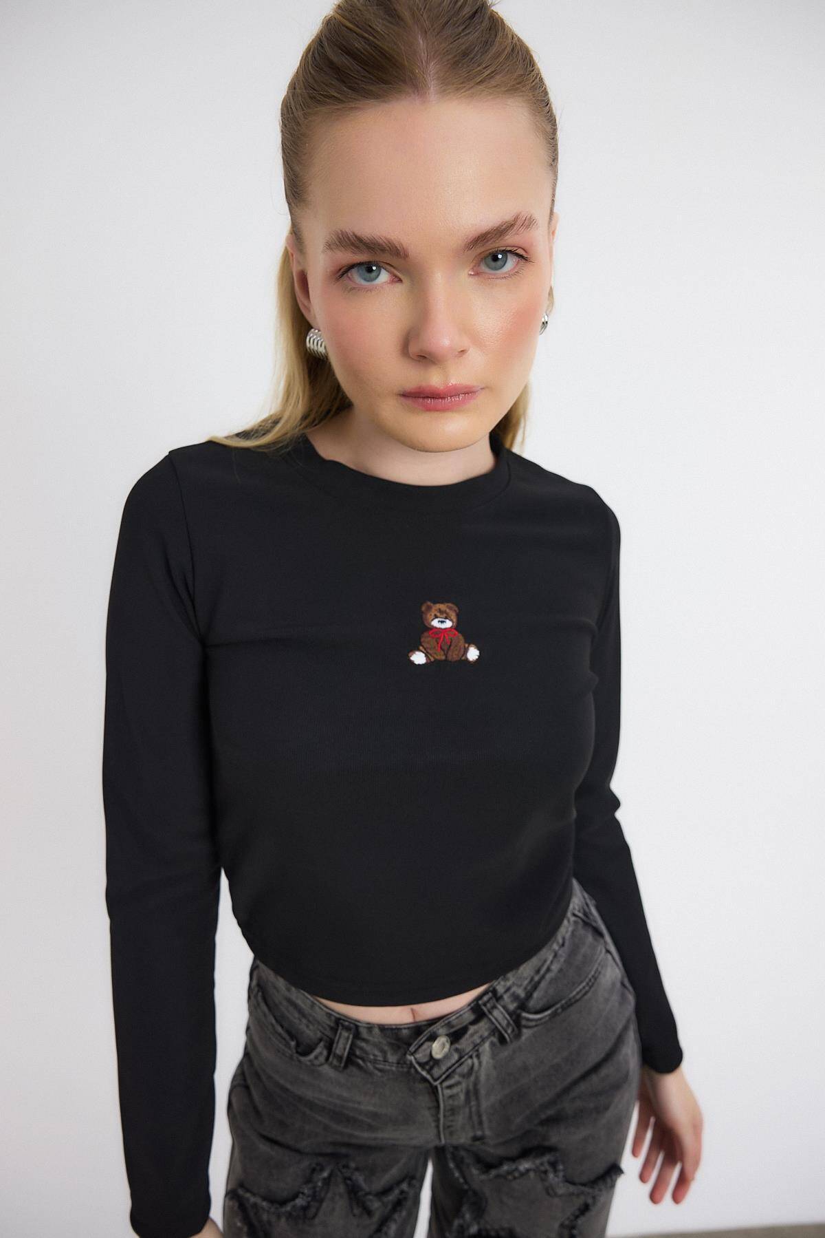 2200 Ayıcık Nakışlı Bisiklet Yaka Bluz Siyah