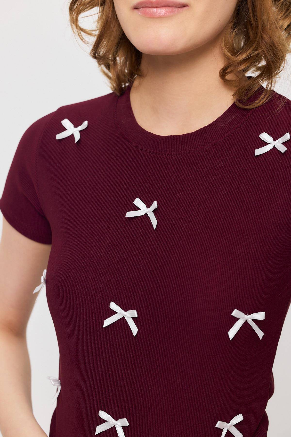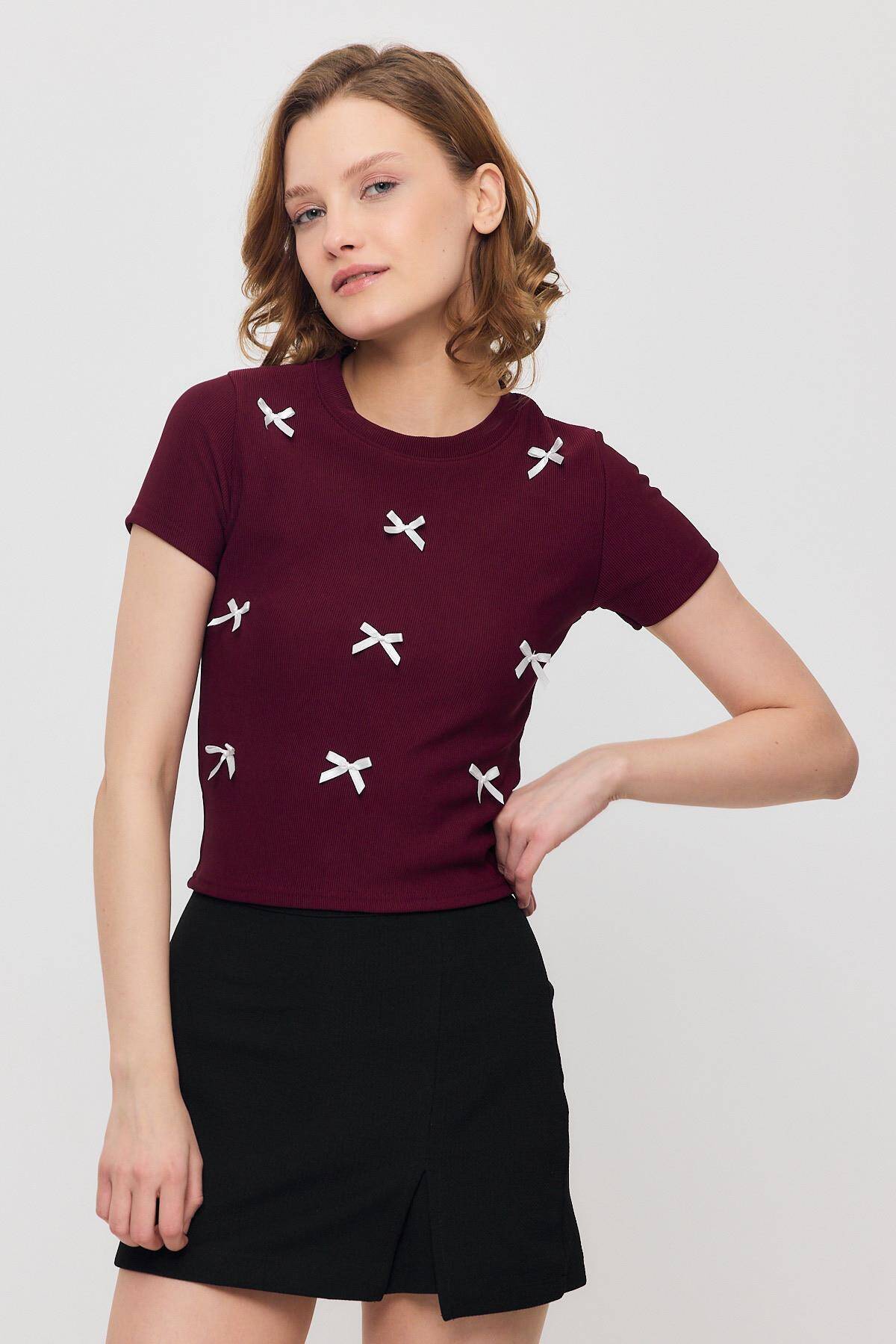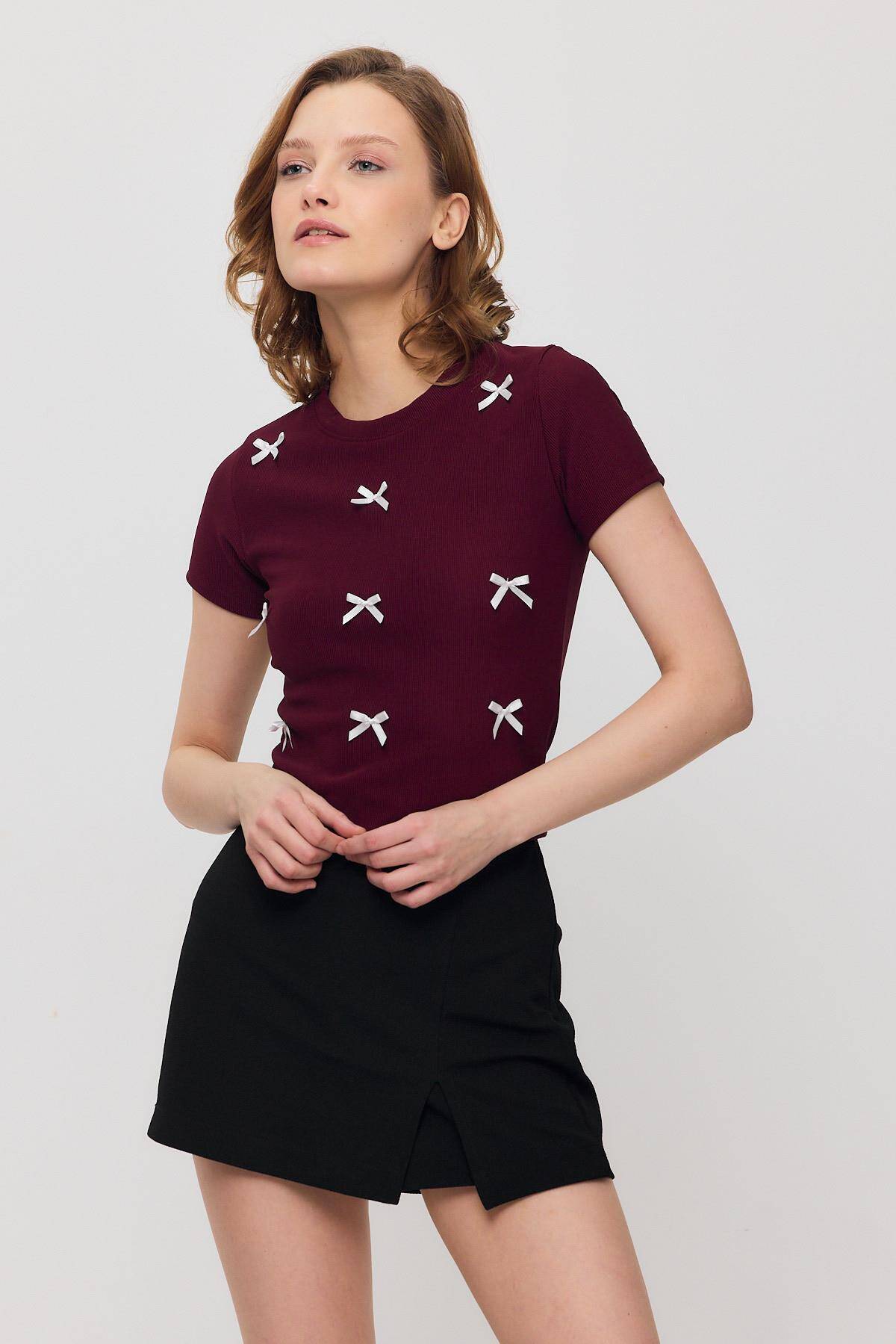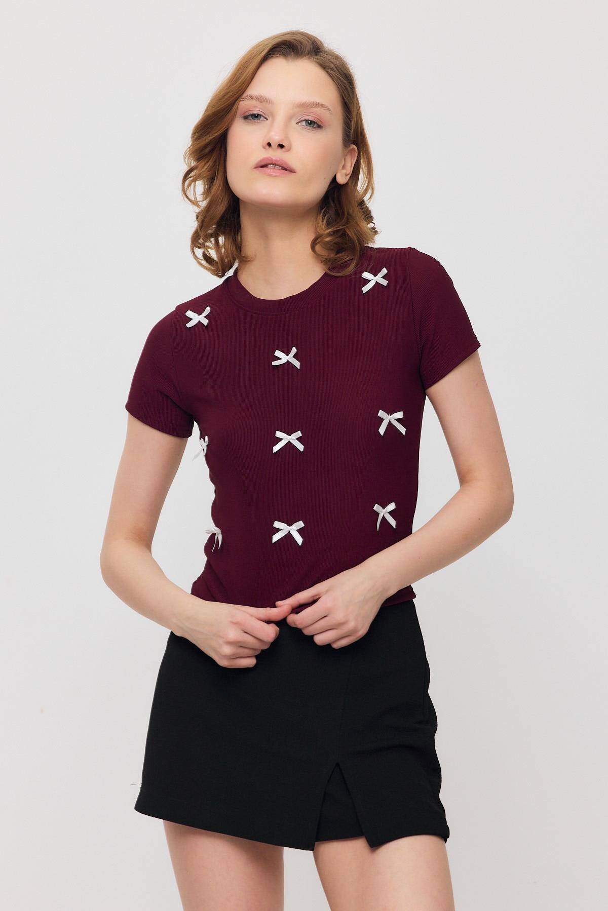 2202 Kurdele Detay Kısa Kol Tişört Bordo