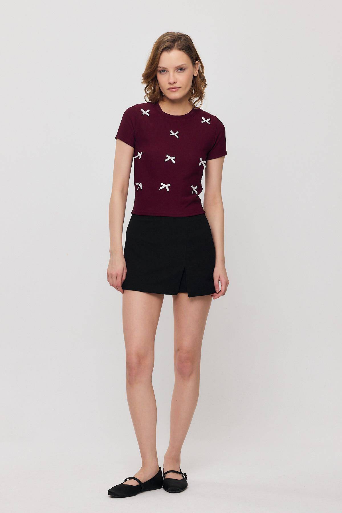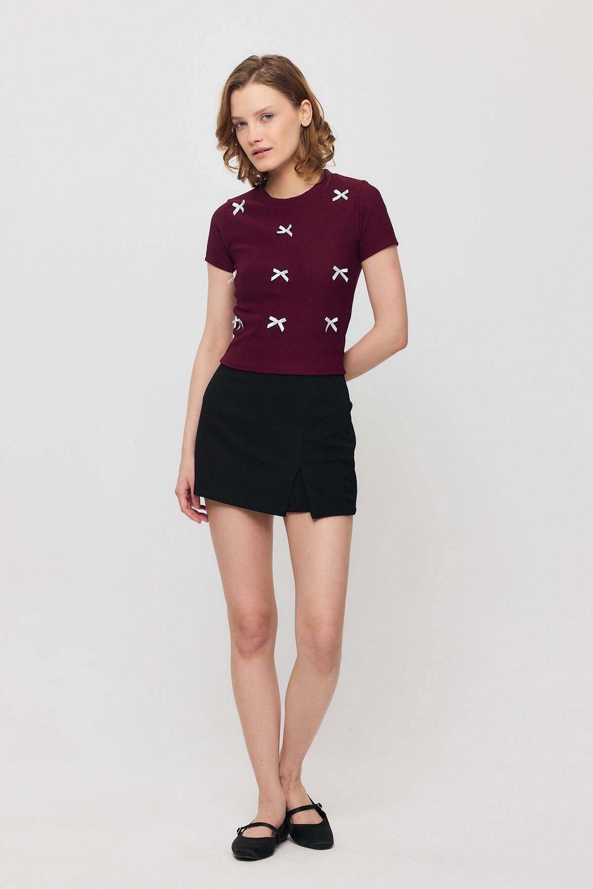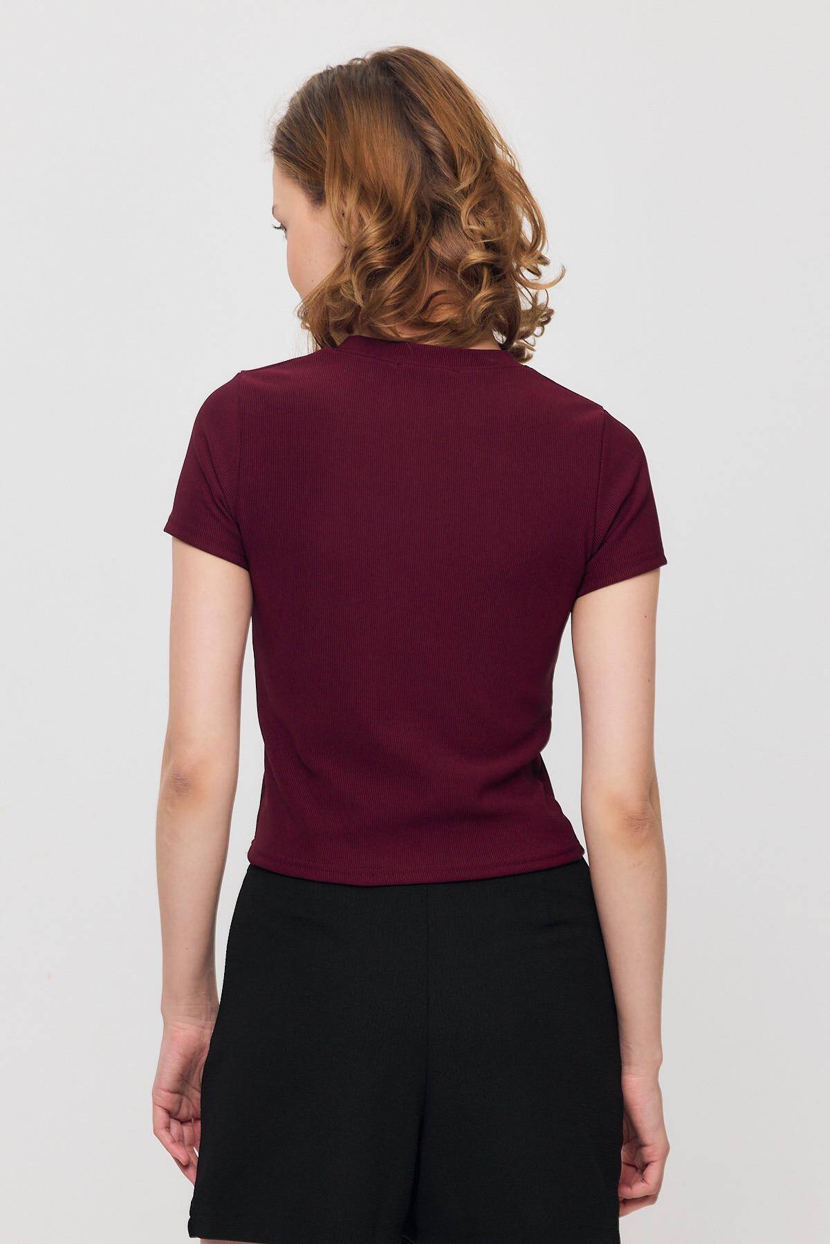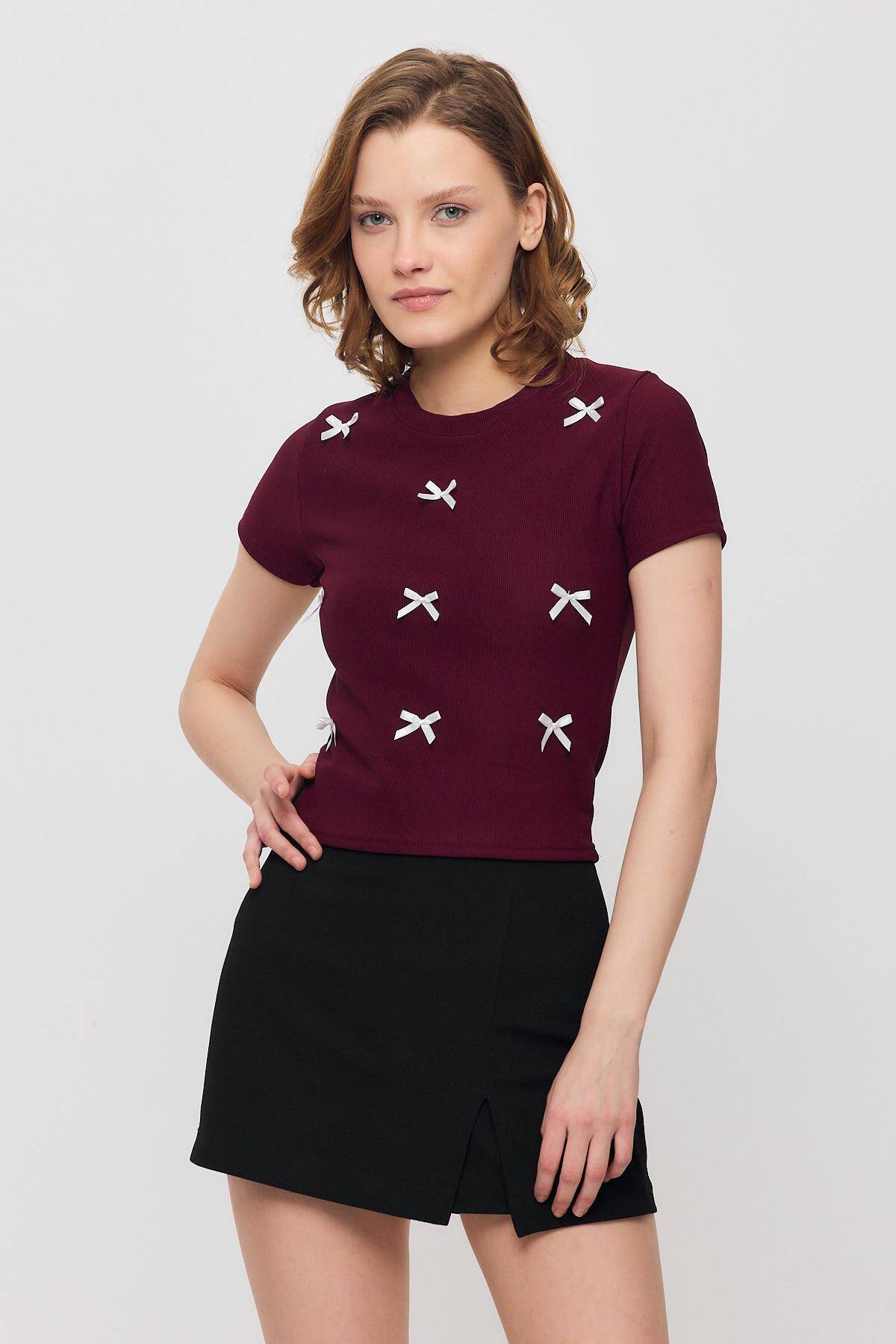 2202 Kurdele Detay Kısa Kol Tişört Bordo