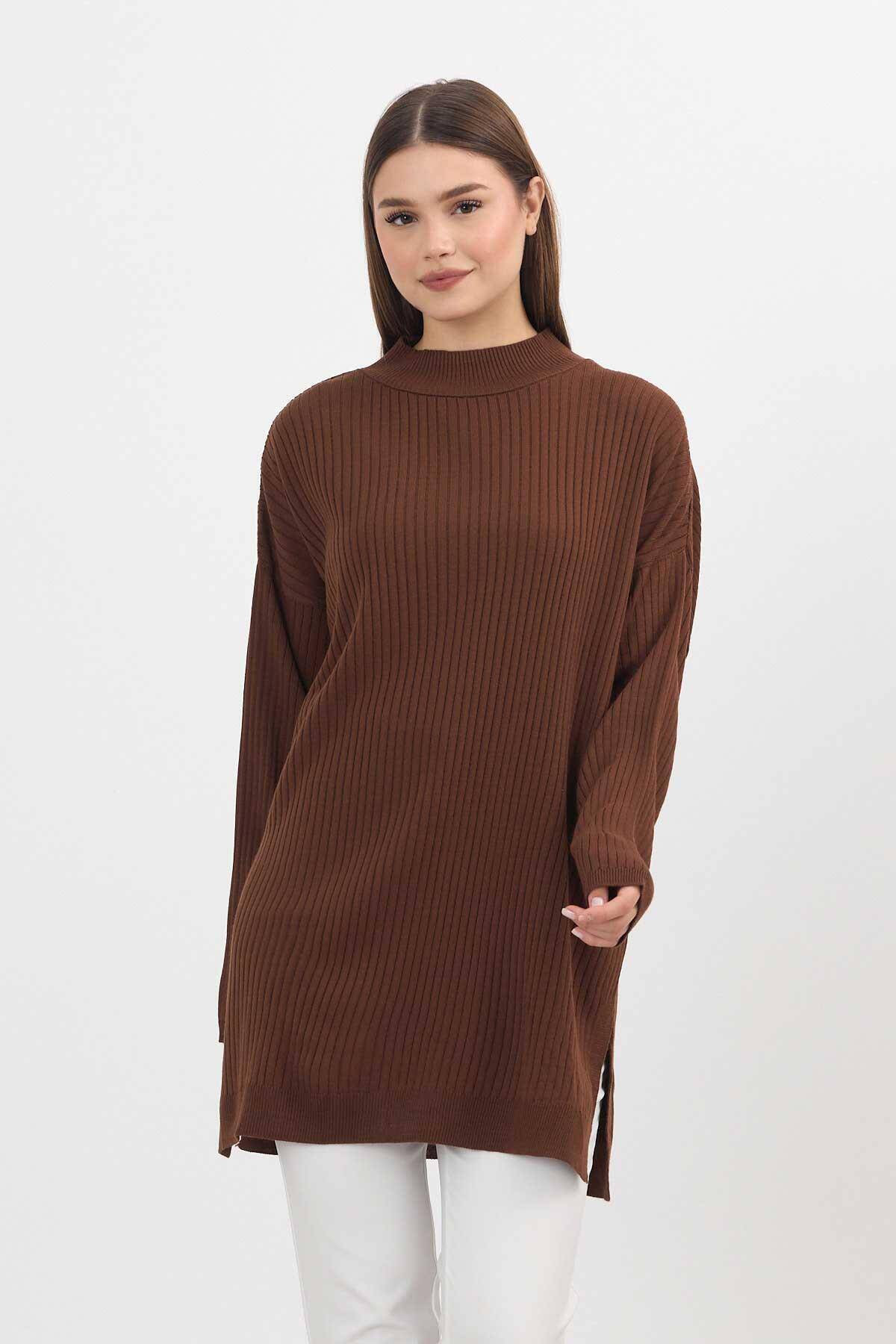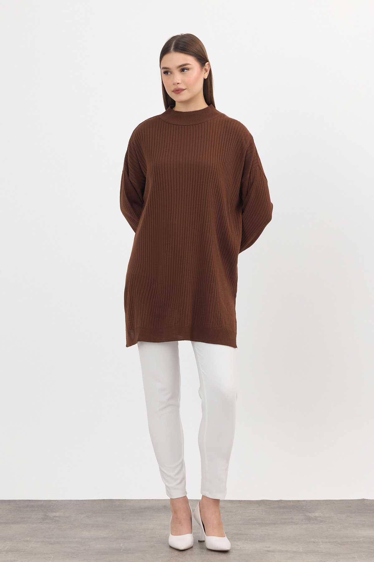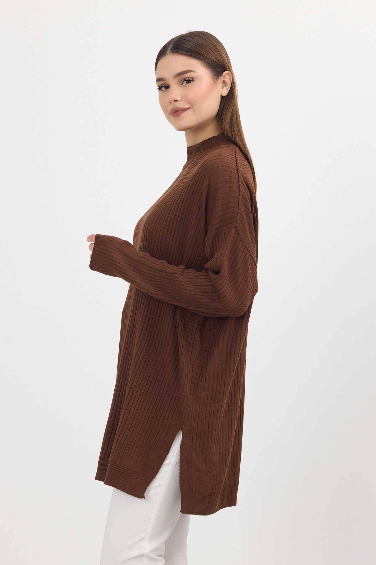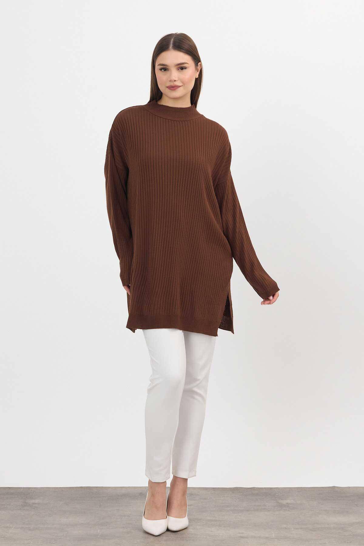 22131 Yırtmaç Detay Fitilli Tunik Kahve