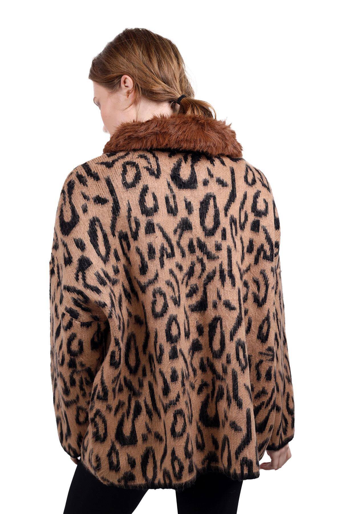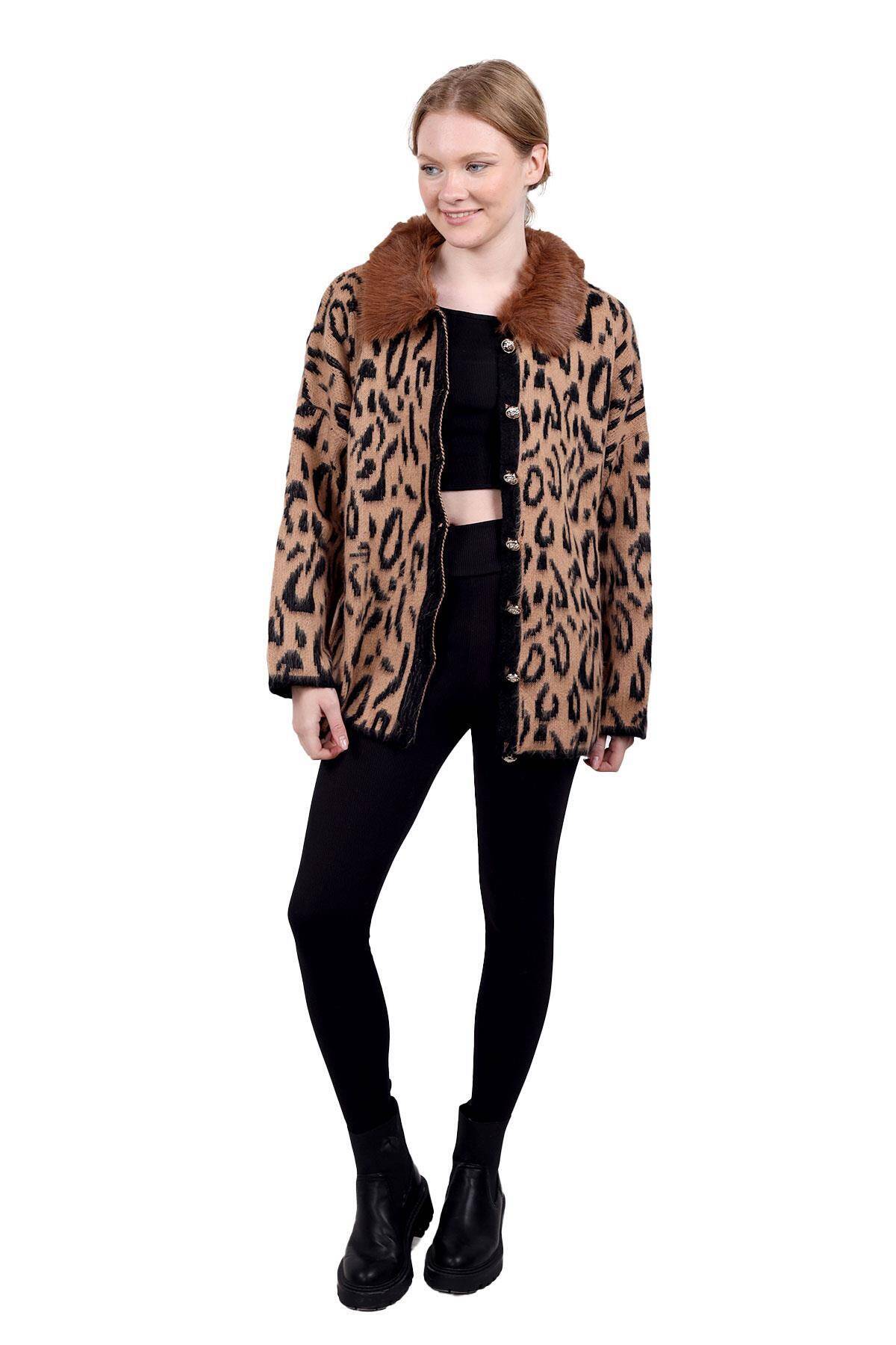 22288 Leopar Yakası Kürklü Hırka Kahve