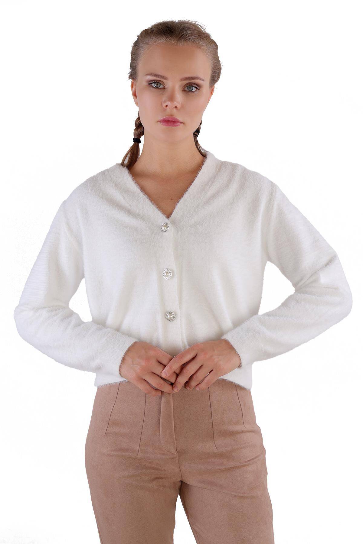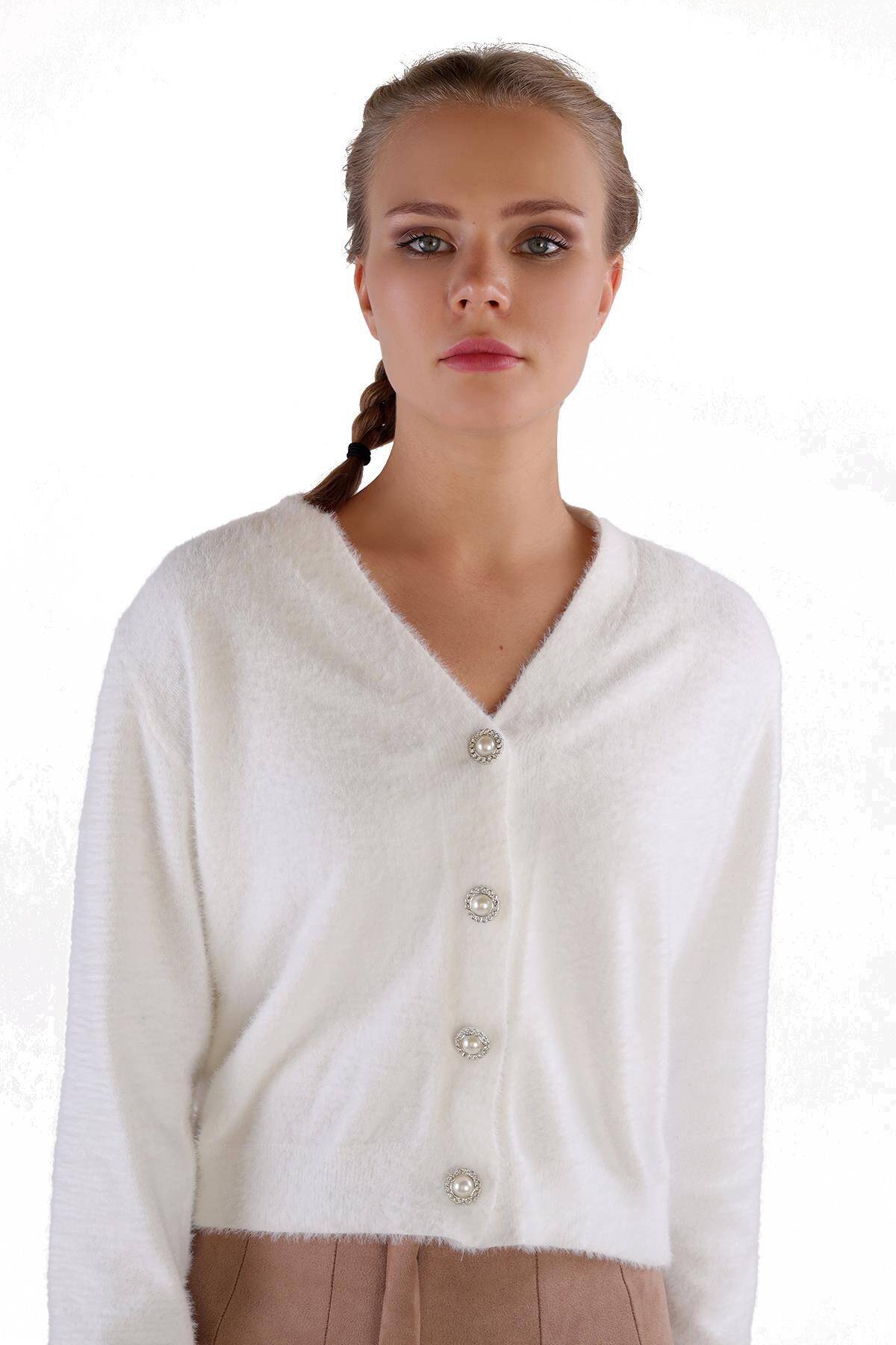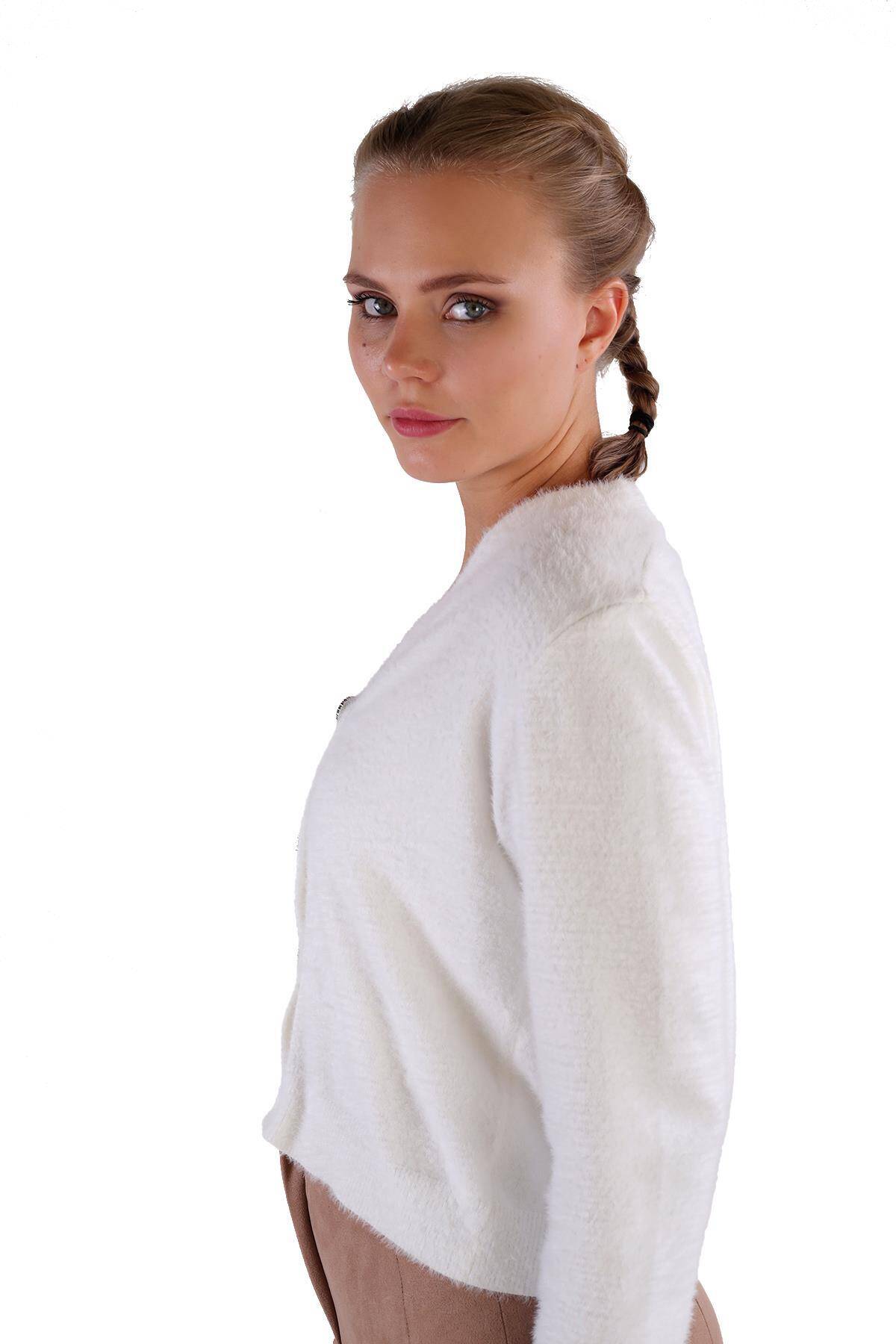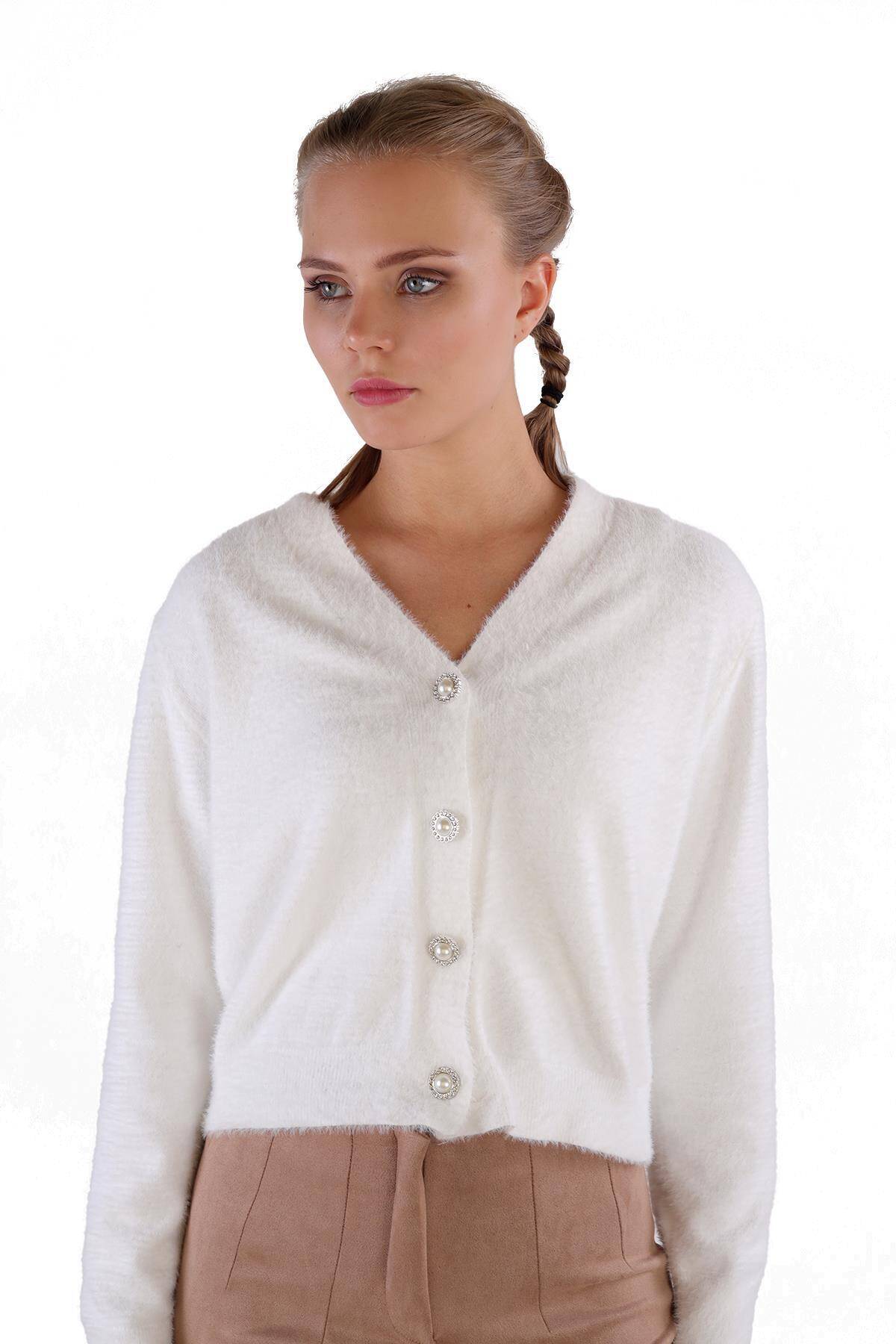 24170 Düğme Detay Sakallı Kısa Hırka Ekru