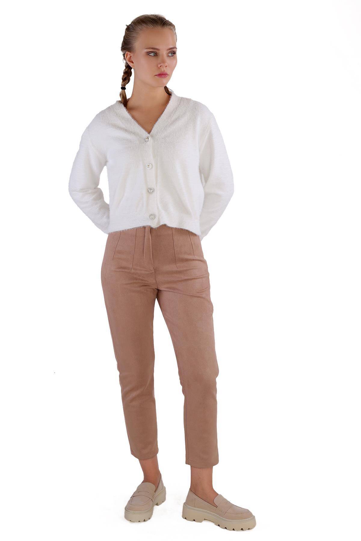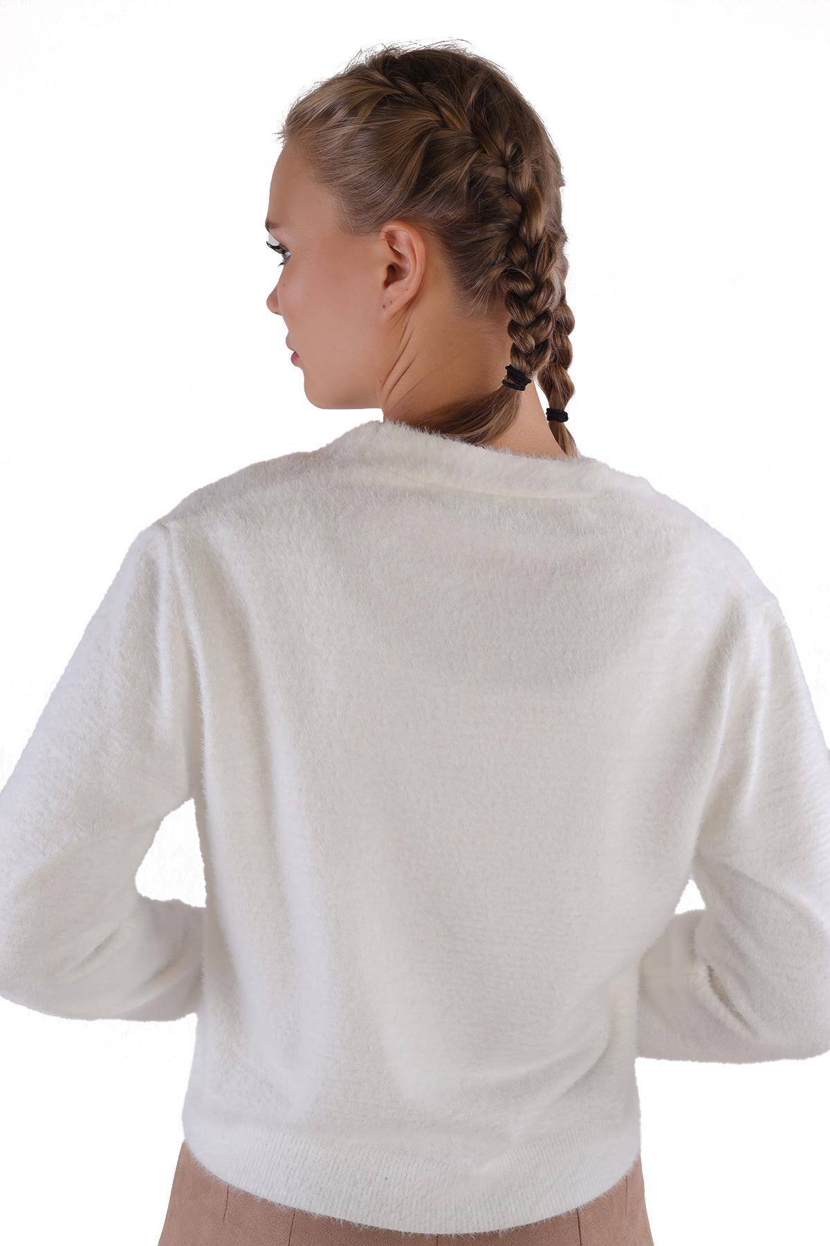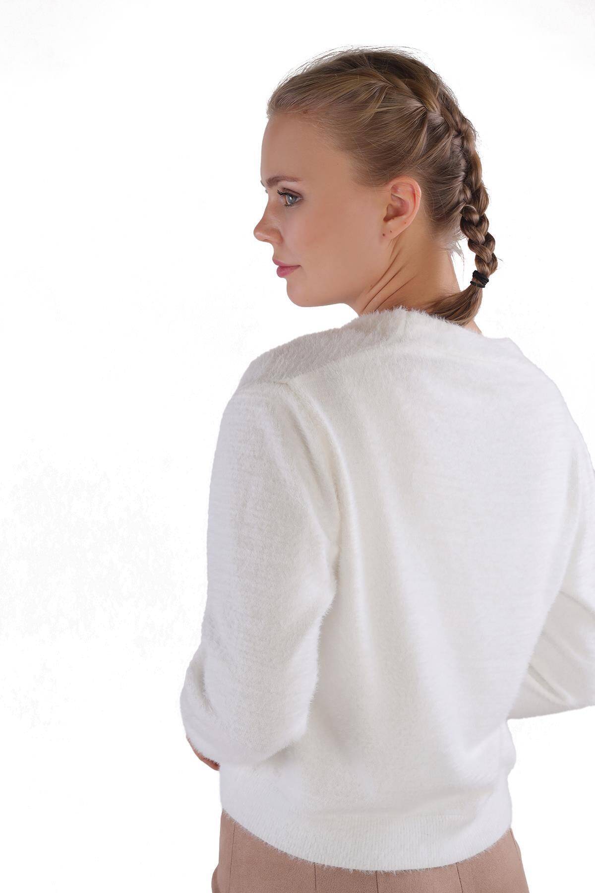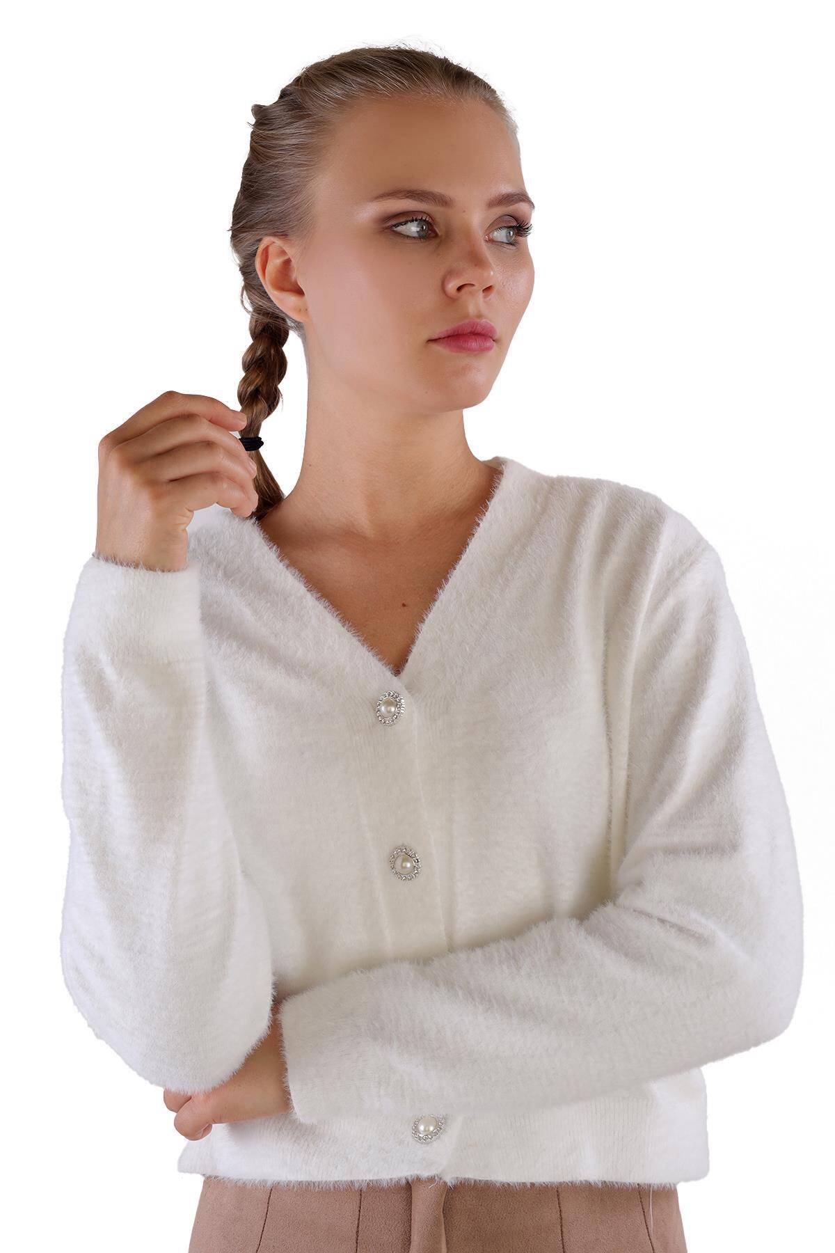 24170 Düğme Detay Sakallı Kısa Hırka Ekru
