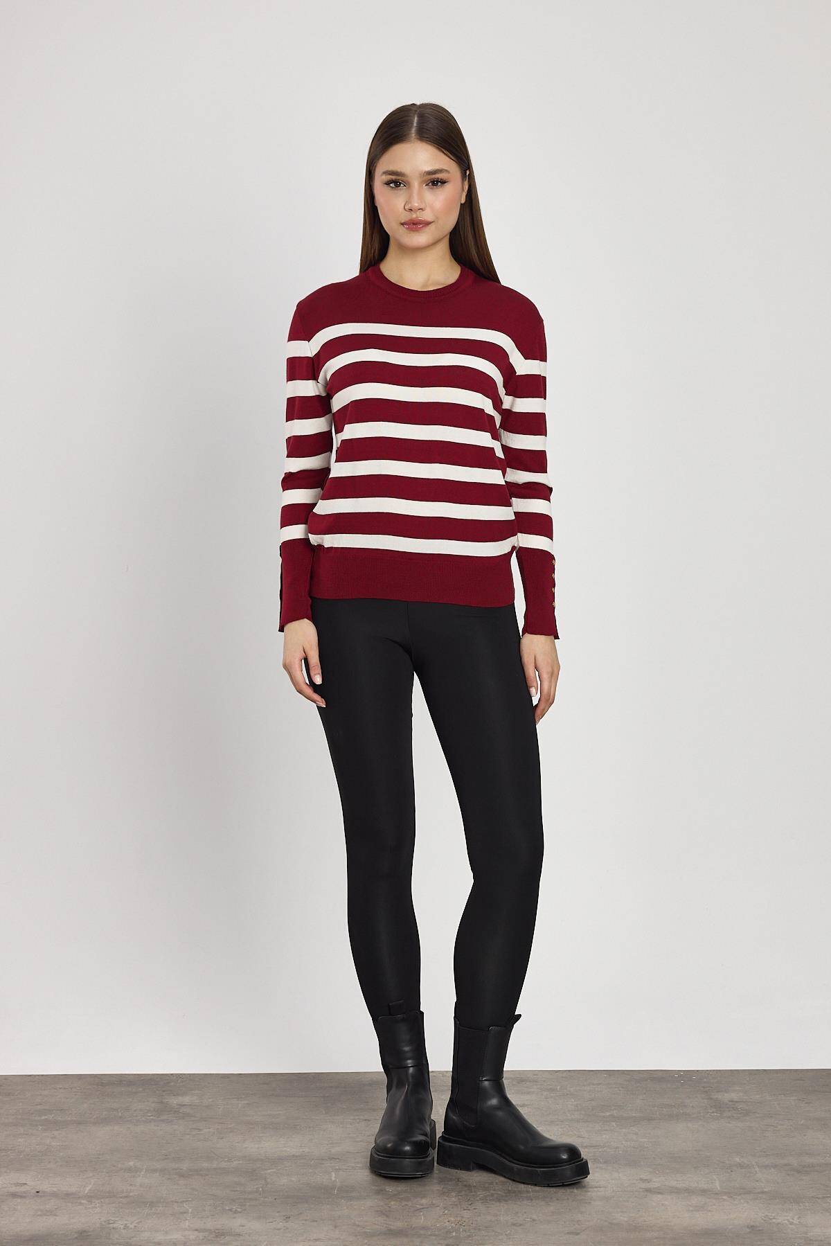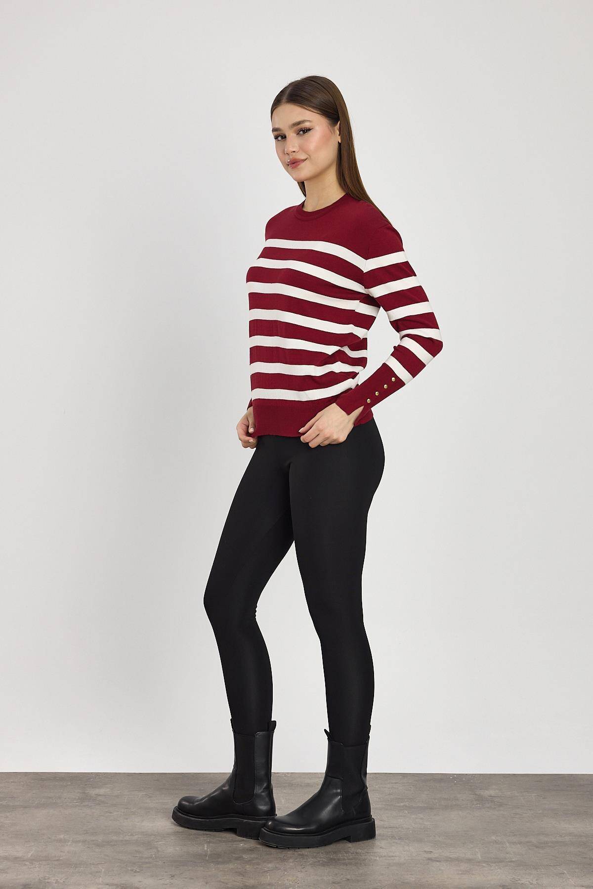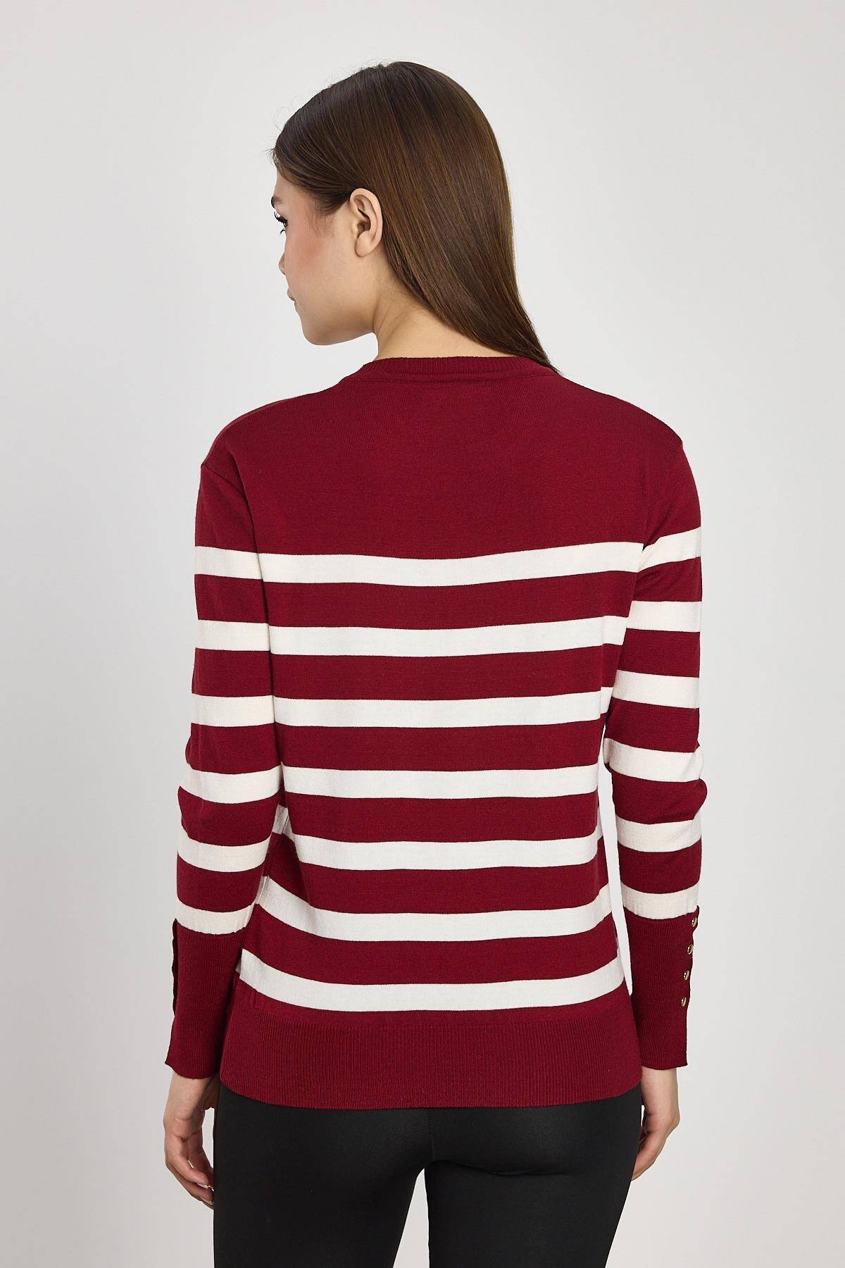 24346 Çizgili Kol Düğme Detay Kazak Bordo