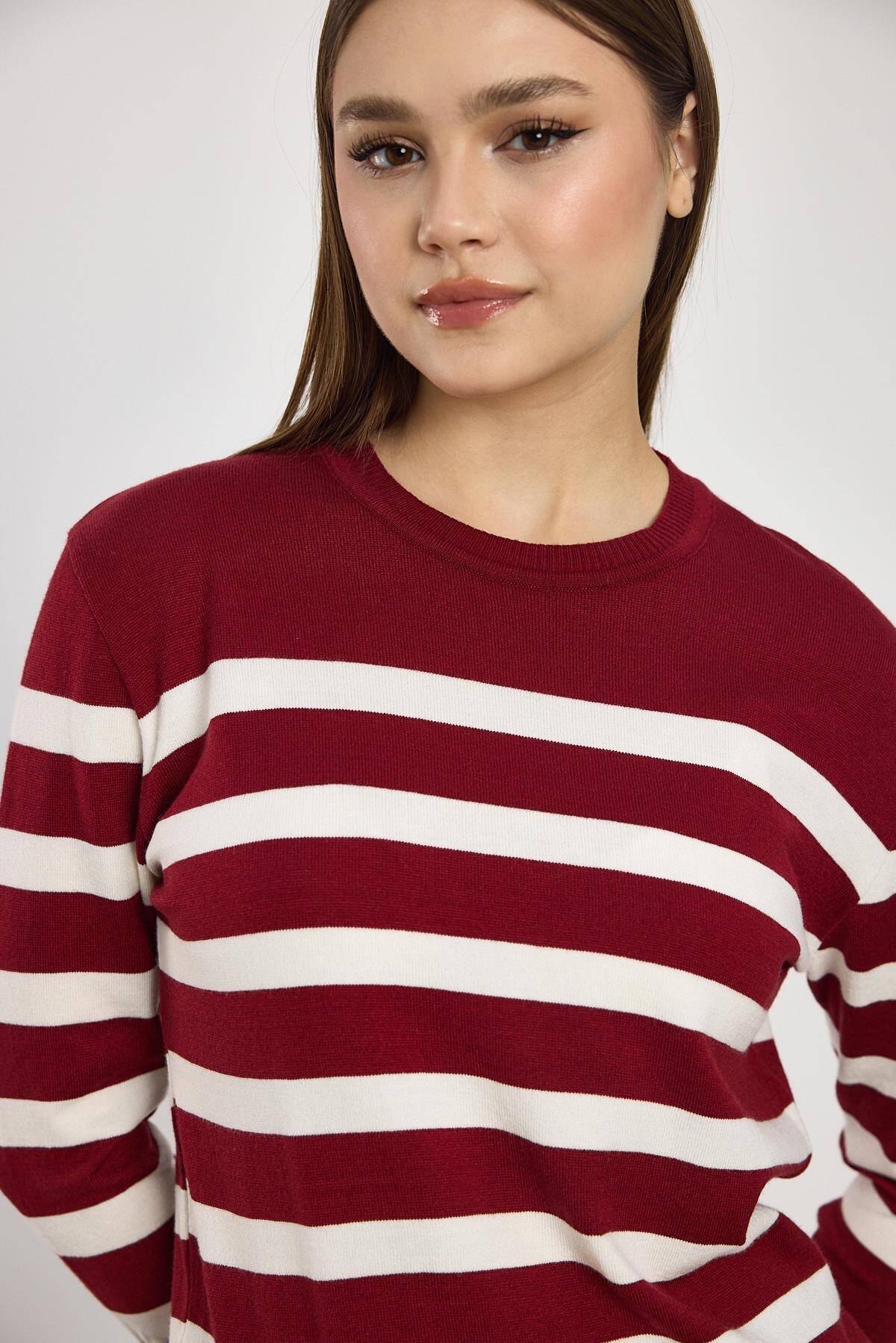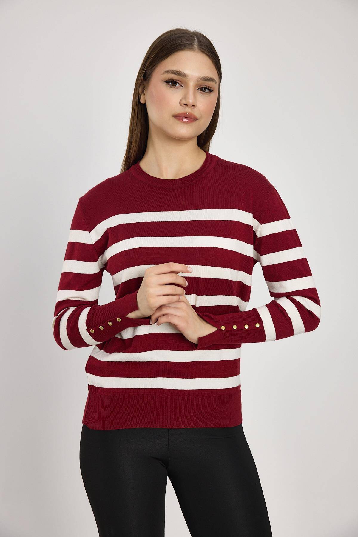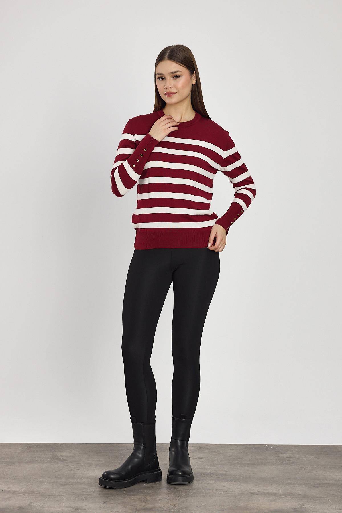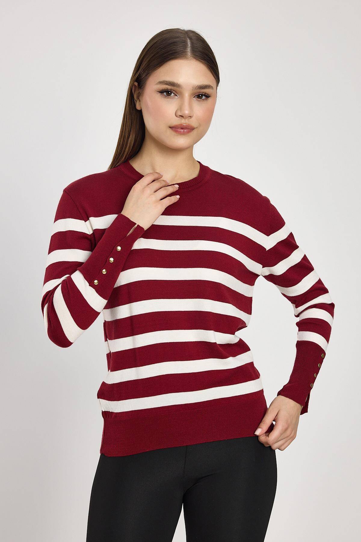 24346 Çizgili Kol Düğme Detay Kazak Bordo