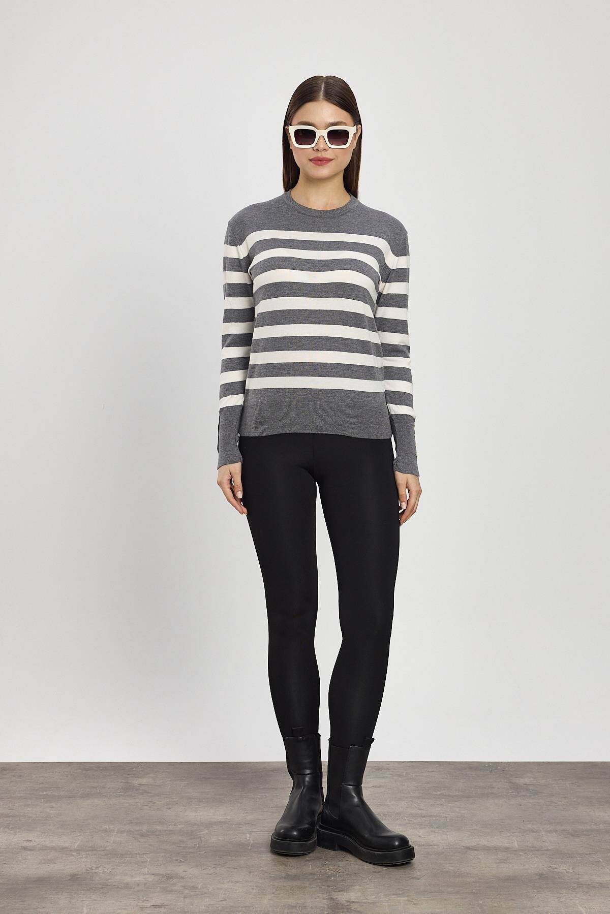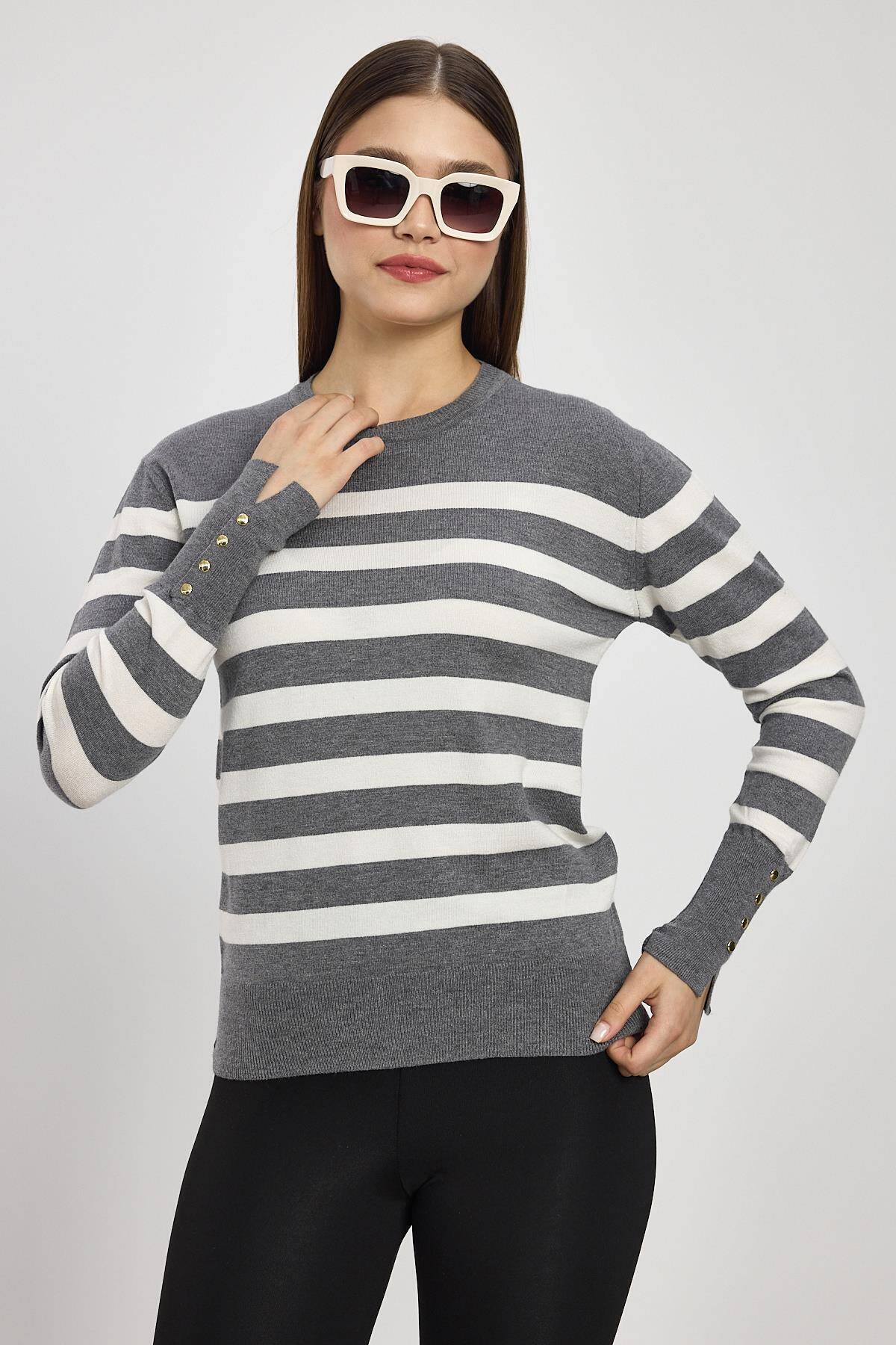 24346 Çizgili Kol Düğme Detay Kazak Füme