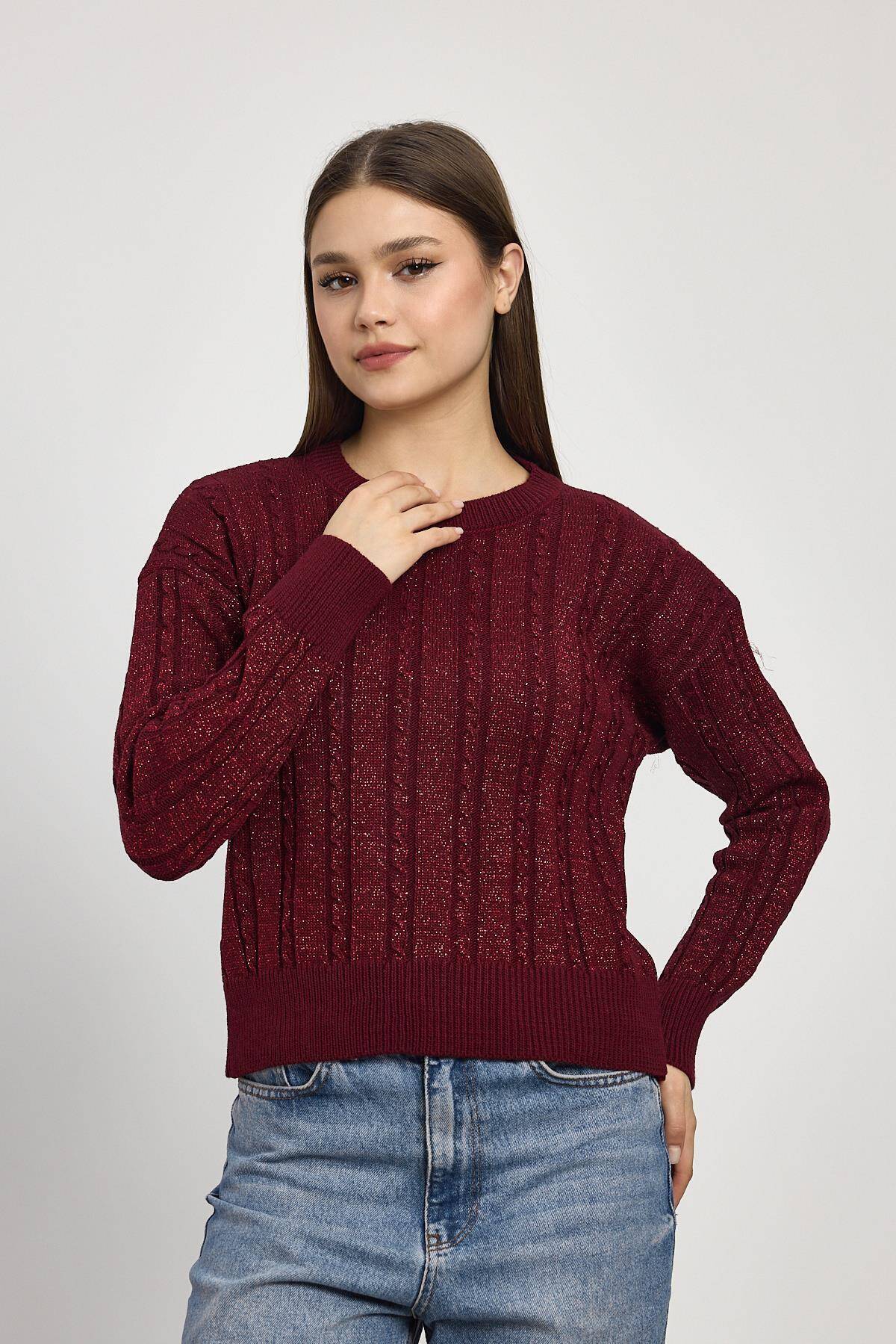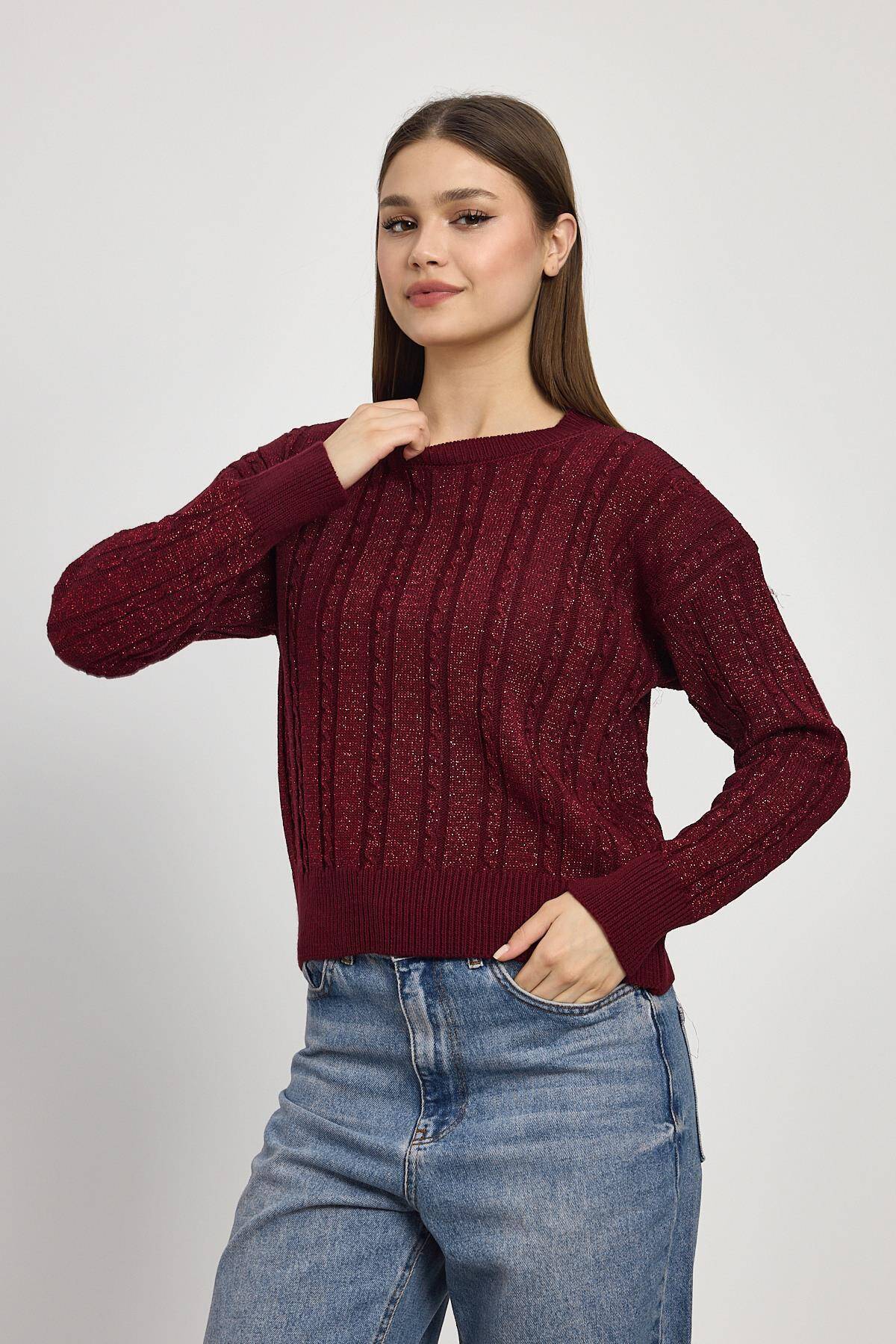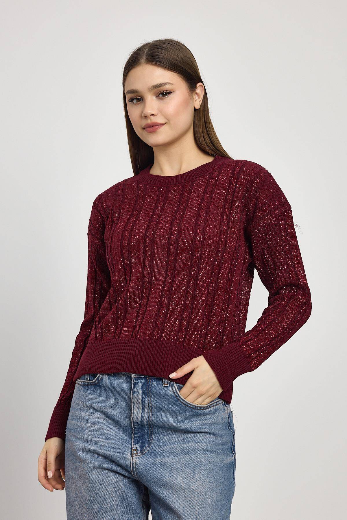 24366 Örgü Detay Simli Triko Kazak Bordo