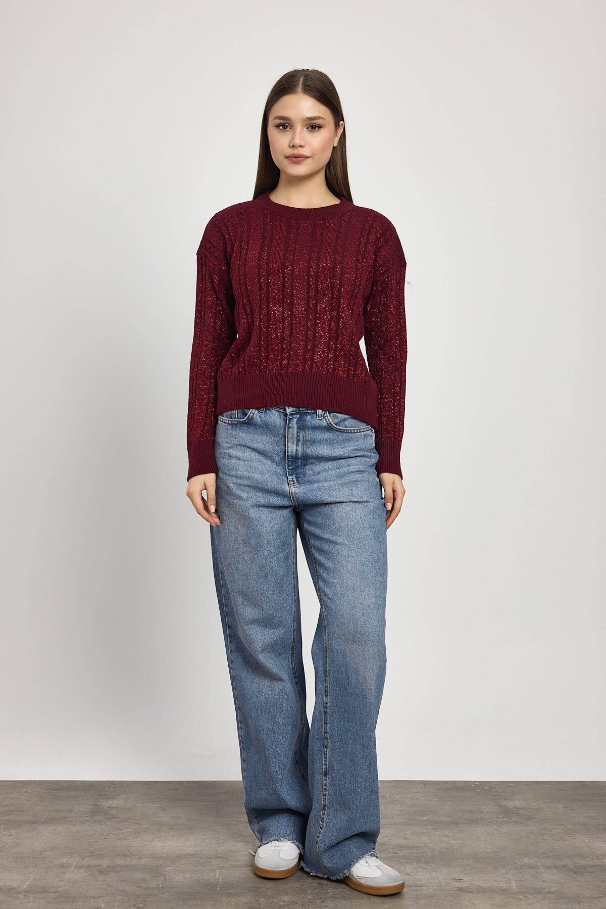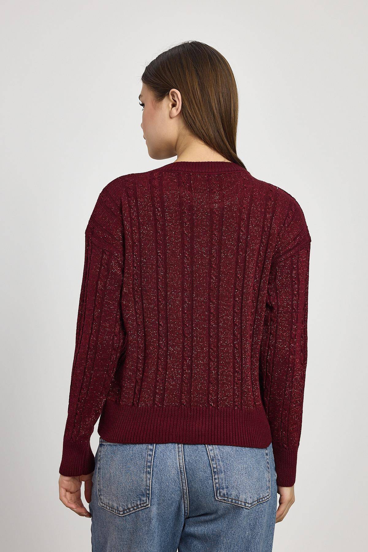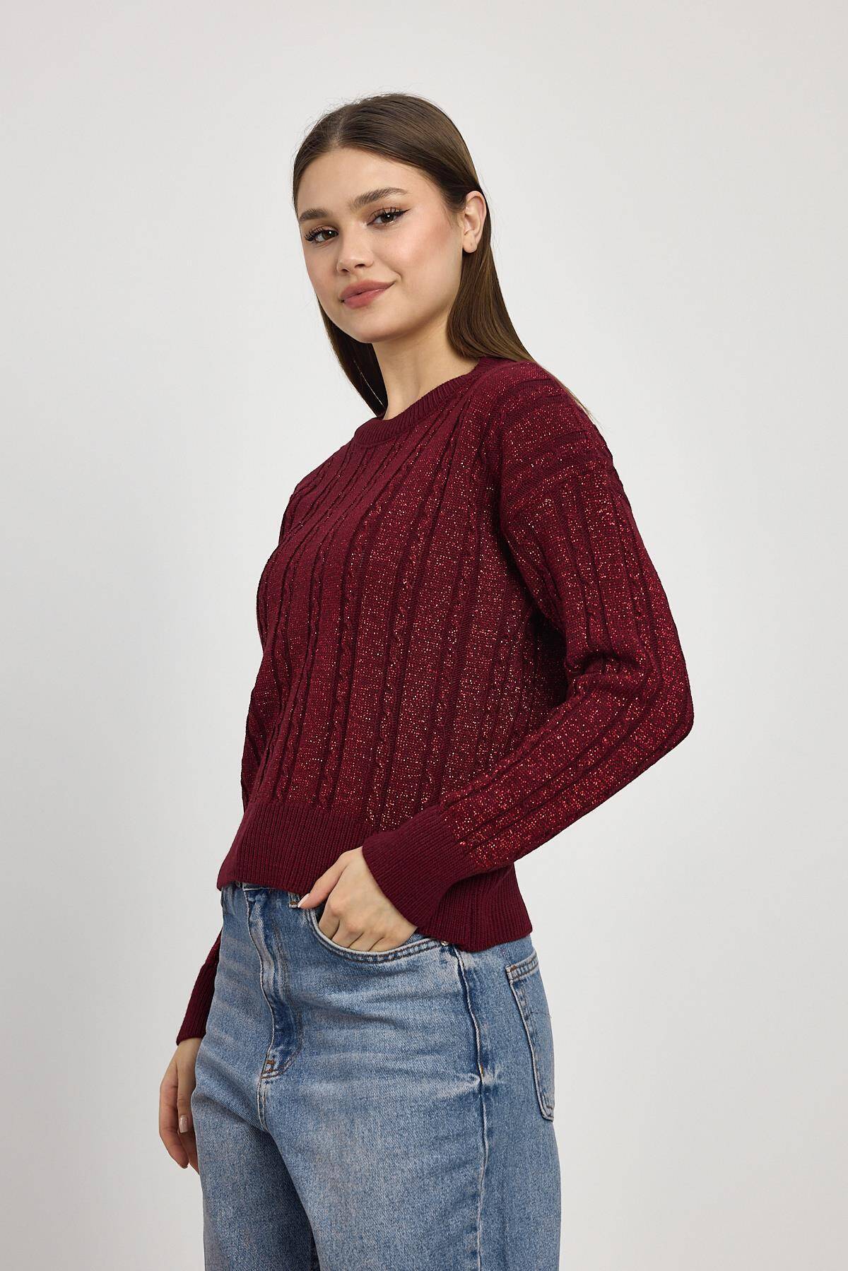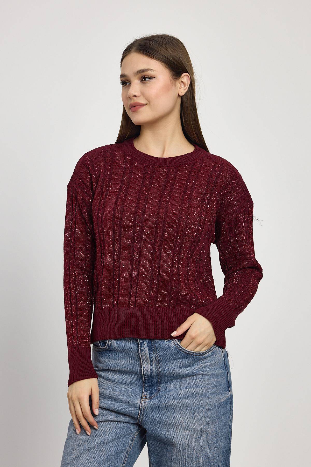 24366 Örgü Detay Simli Triko Kazak Bordo