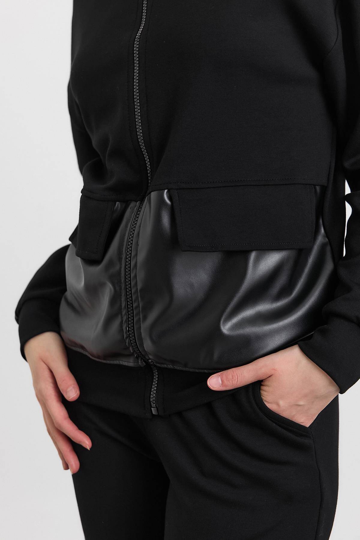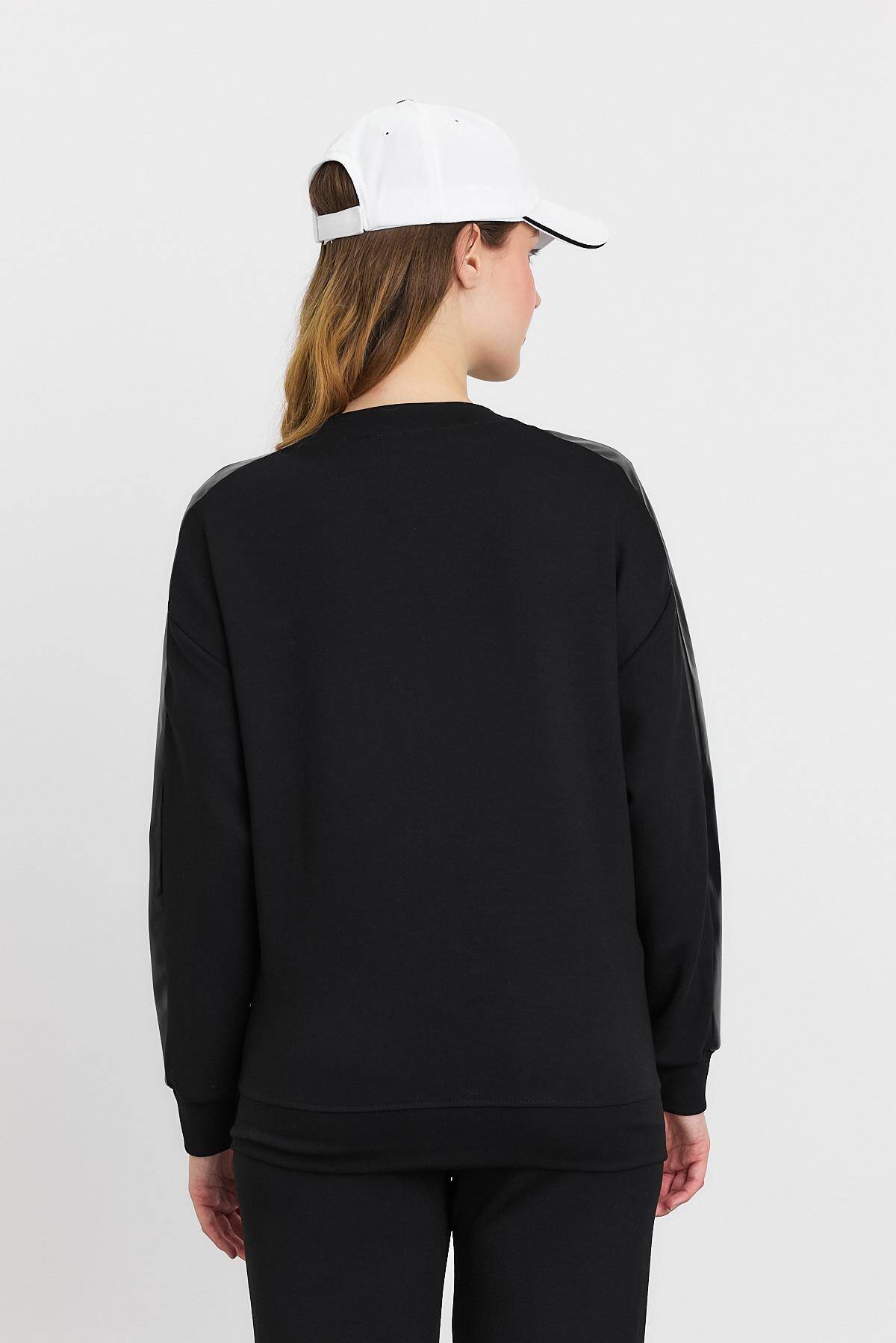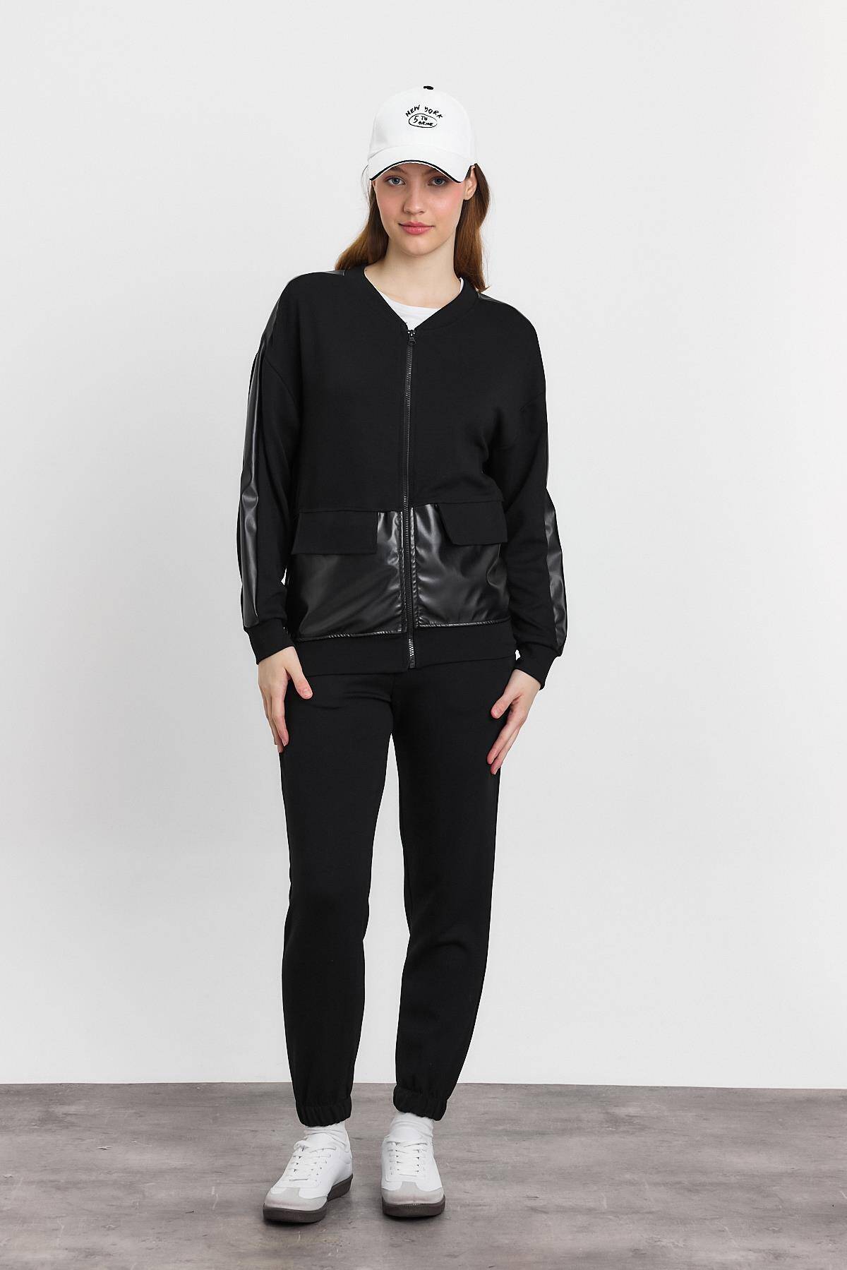 3010 Deri Garniili Fermuarlı Sweat Siyah