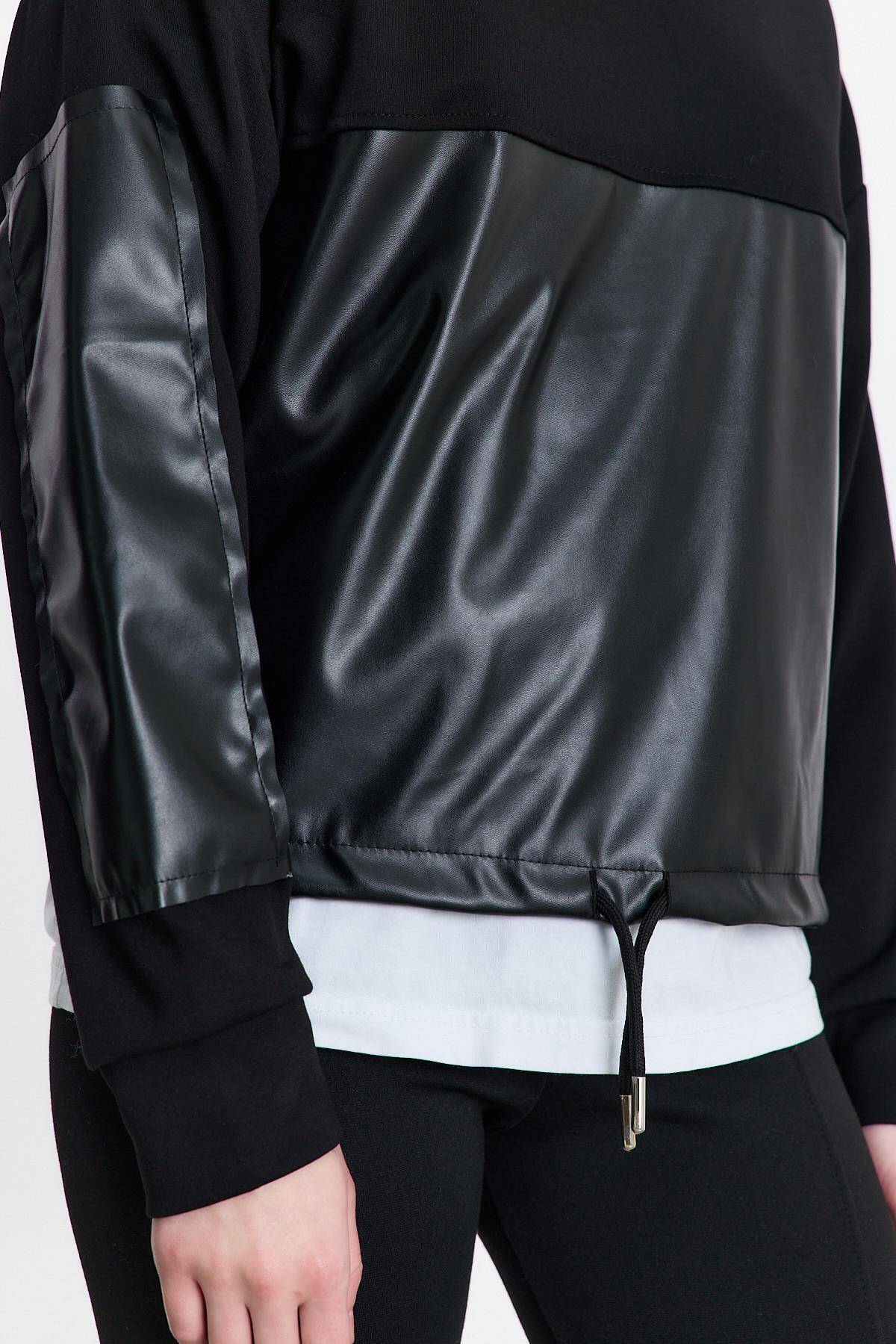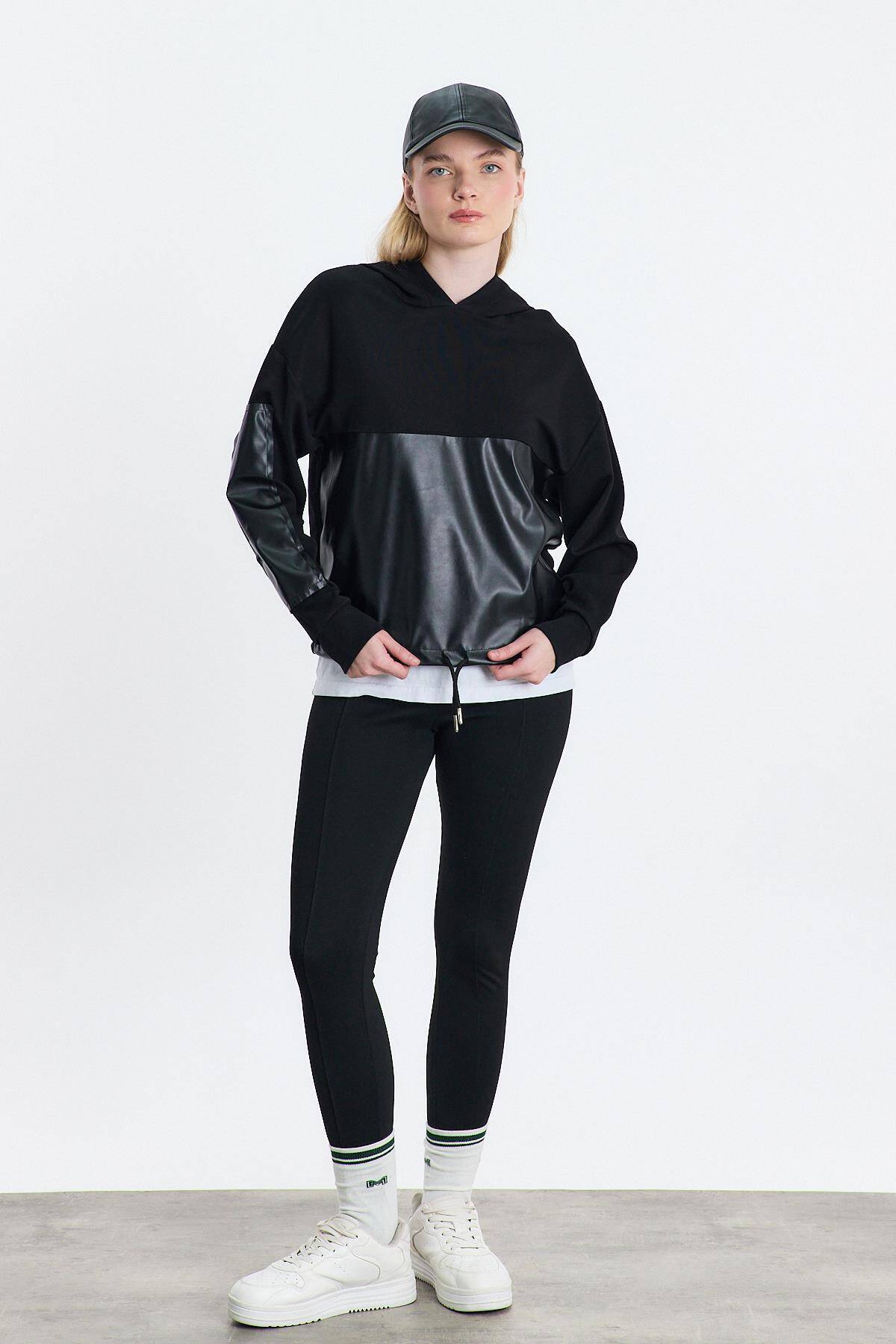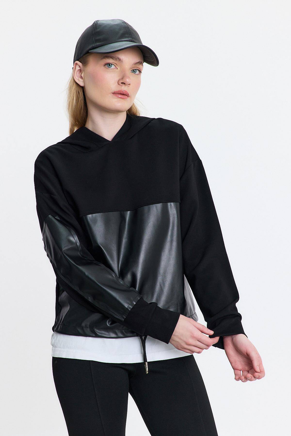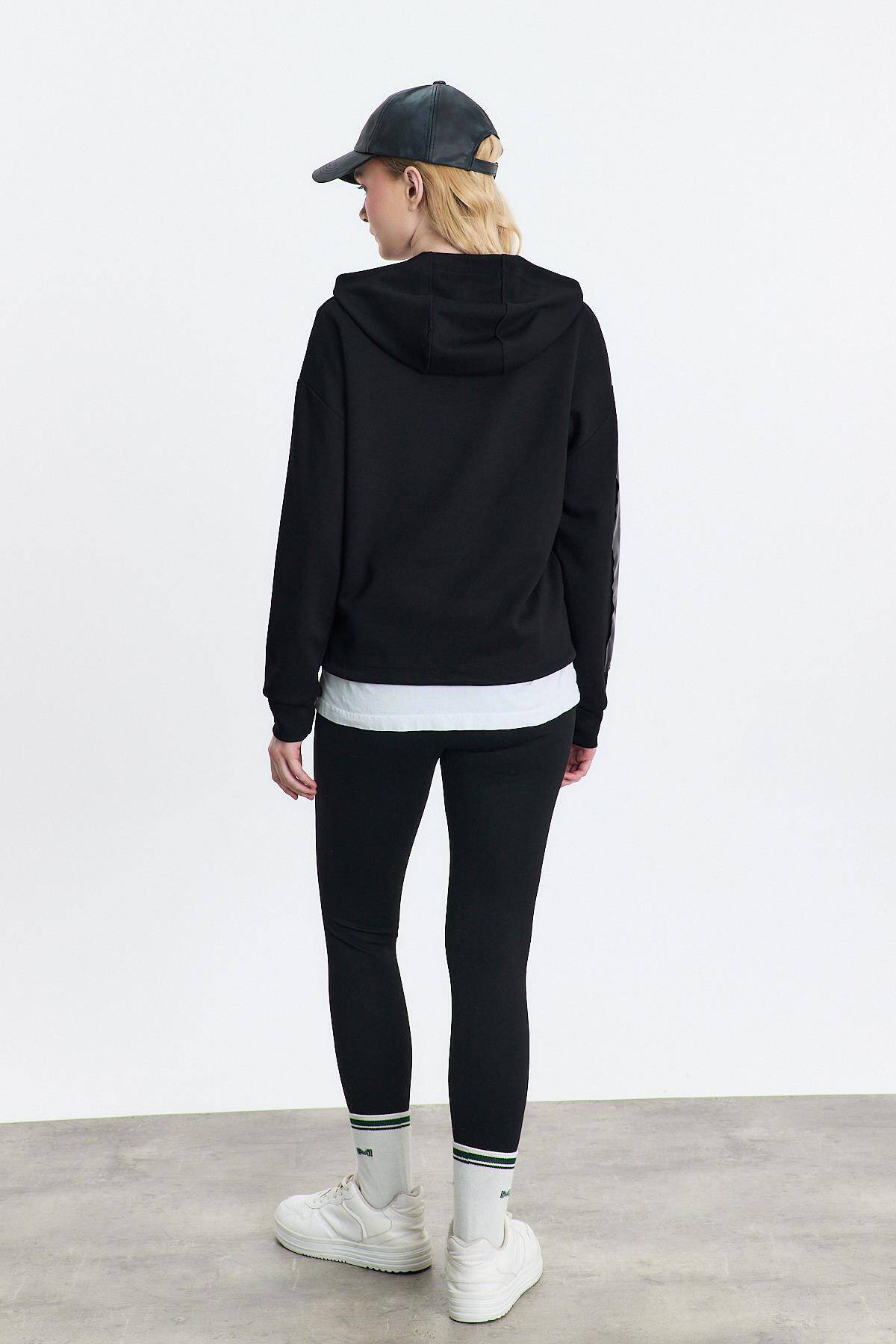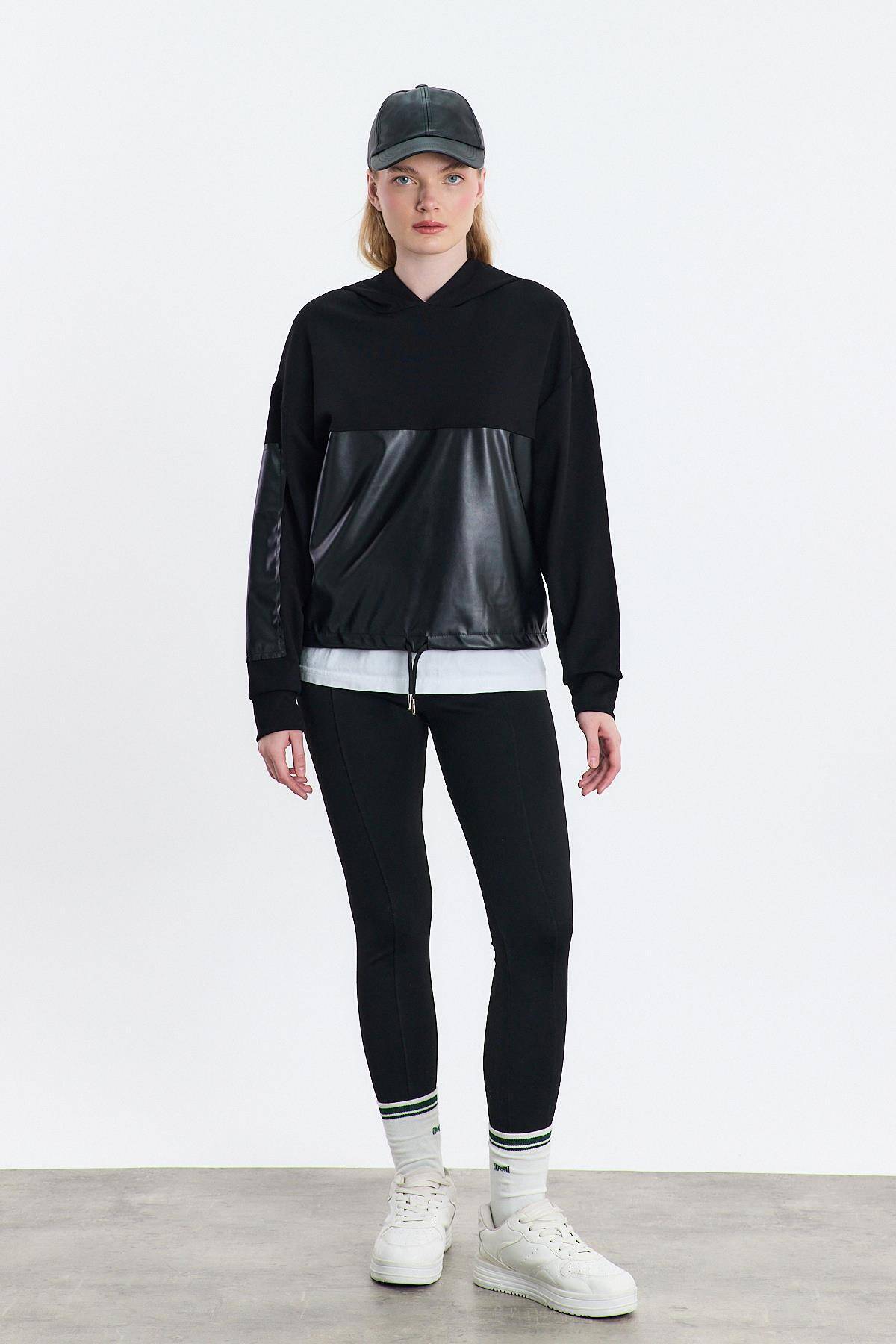 3012 Kapüşonlu Deri Detay Sweat Siyah