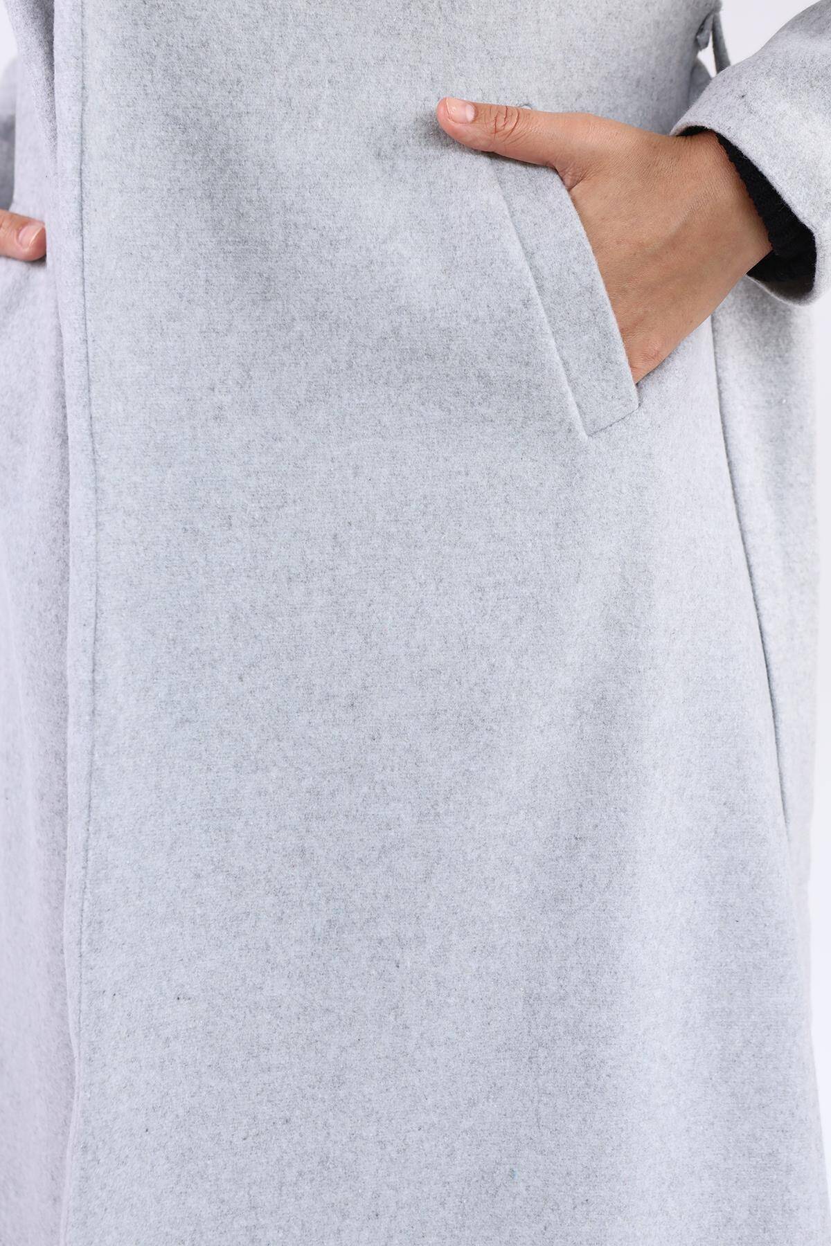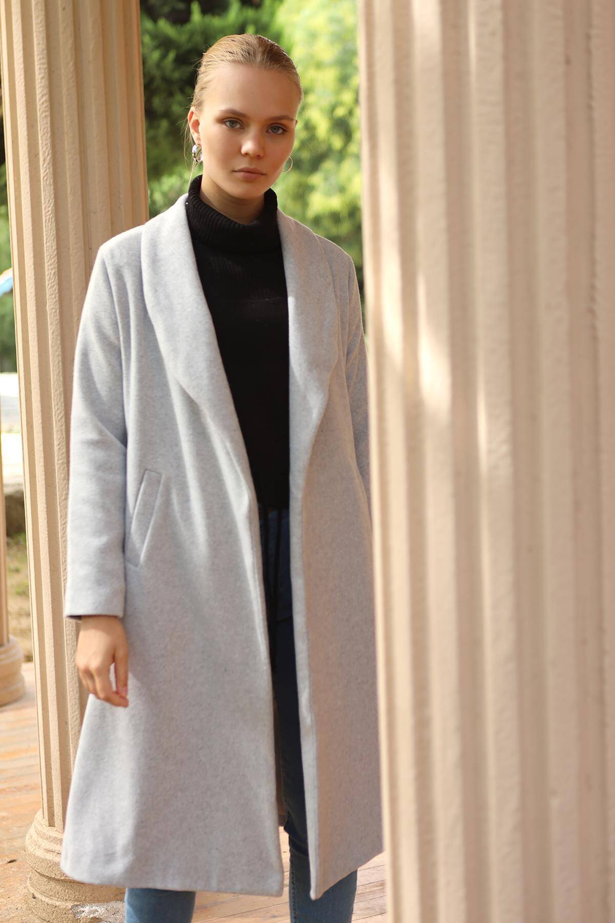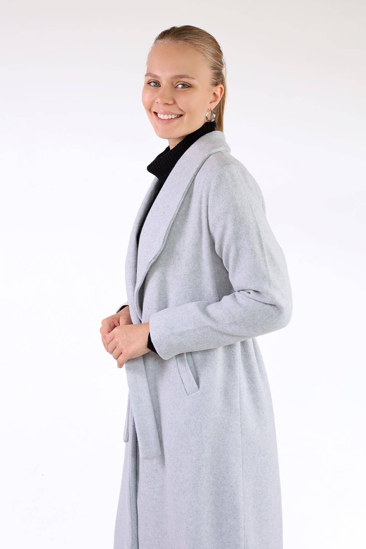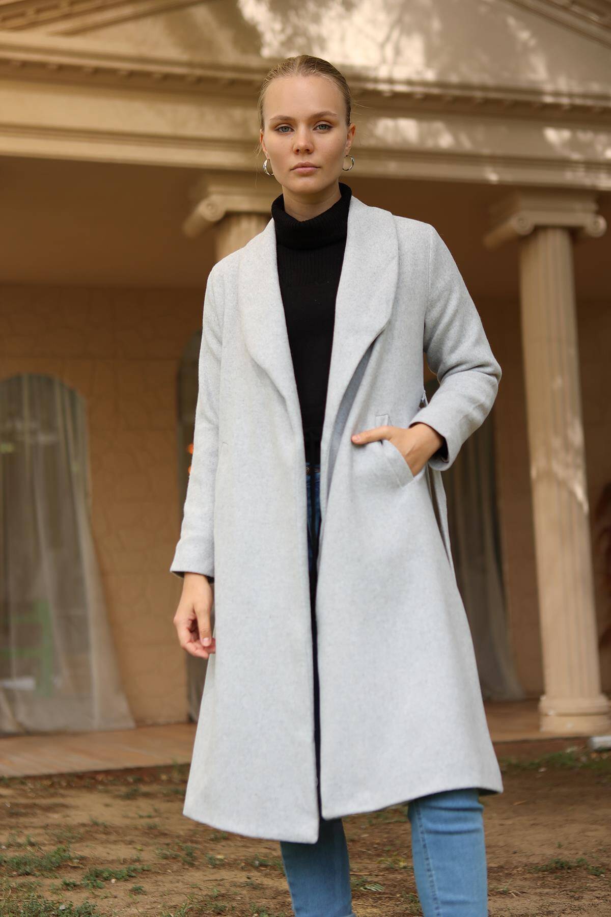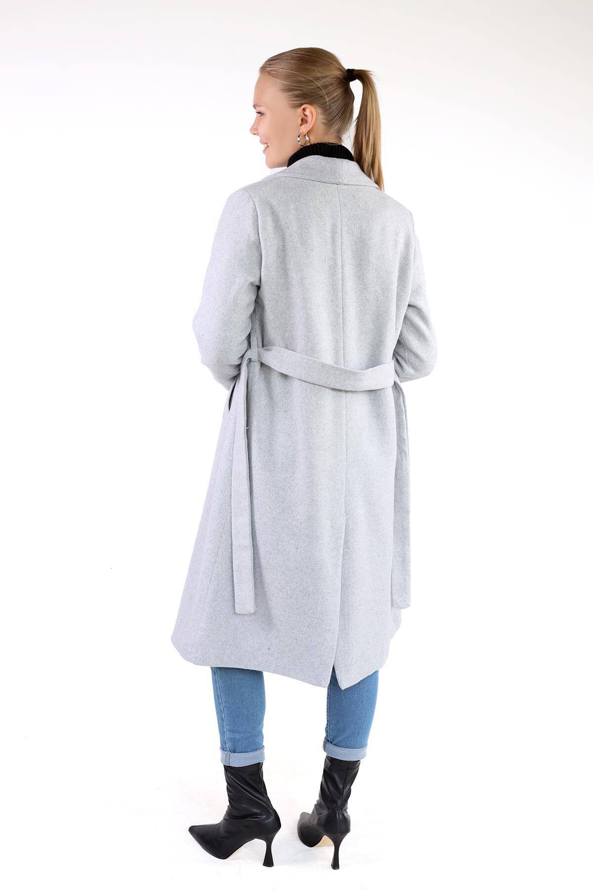 7149A Belden Bağlamalı Uzun Kaşe Kaban Gri