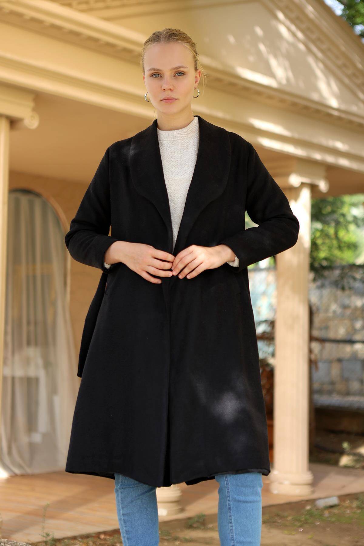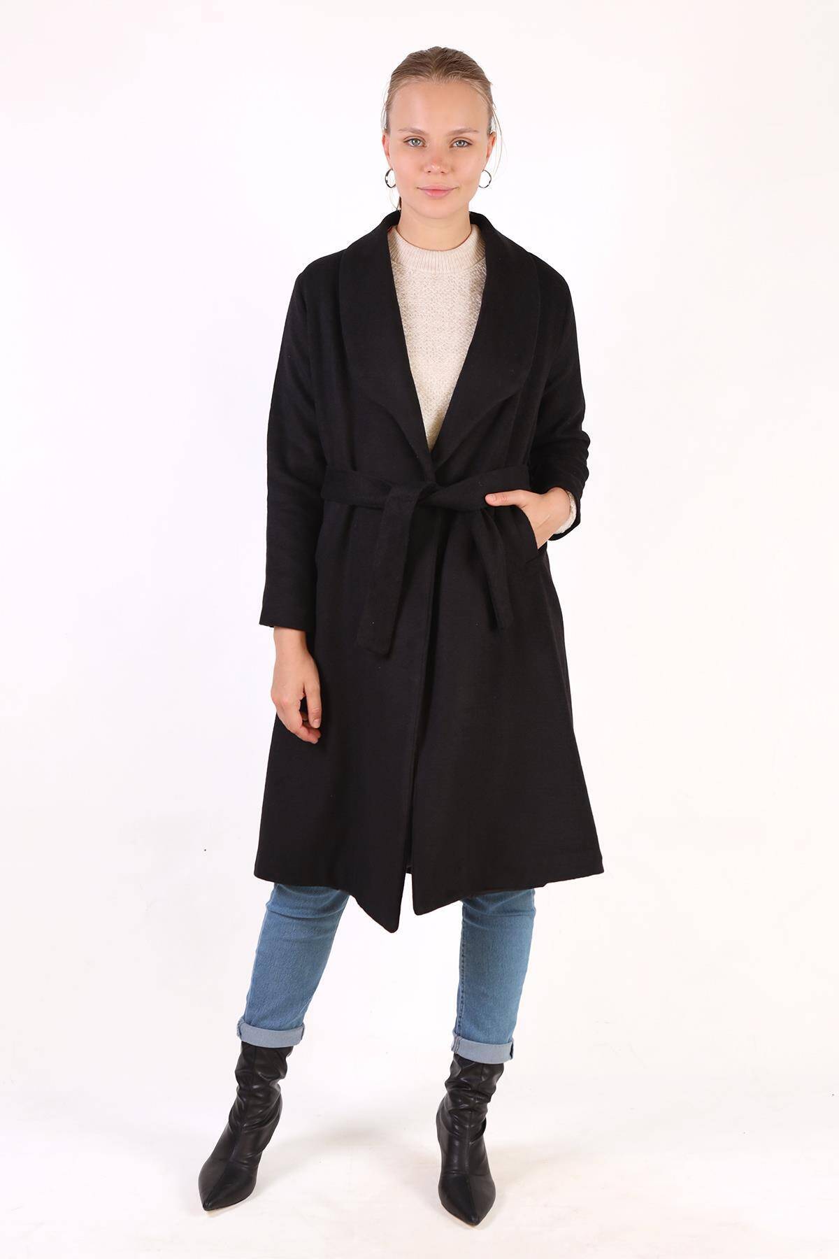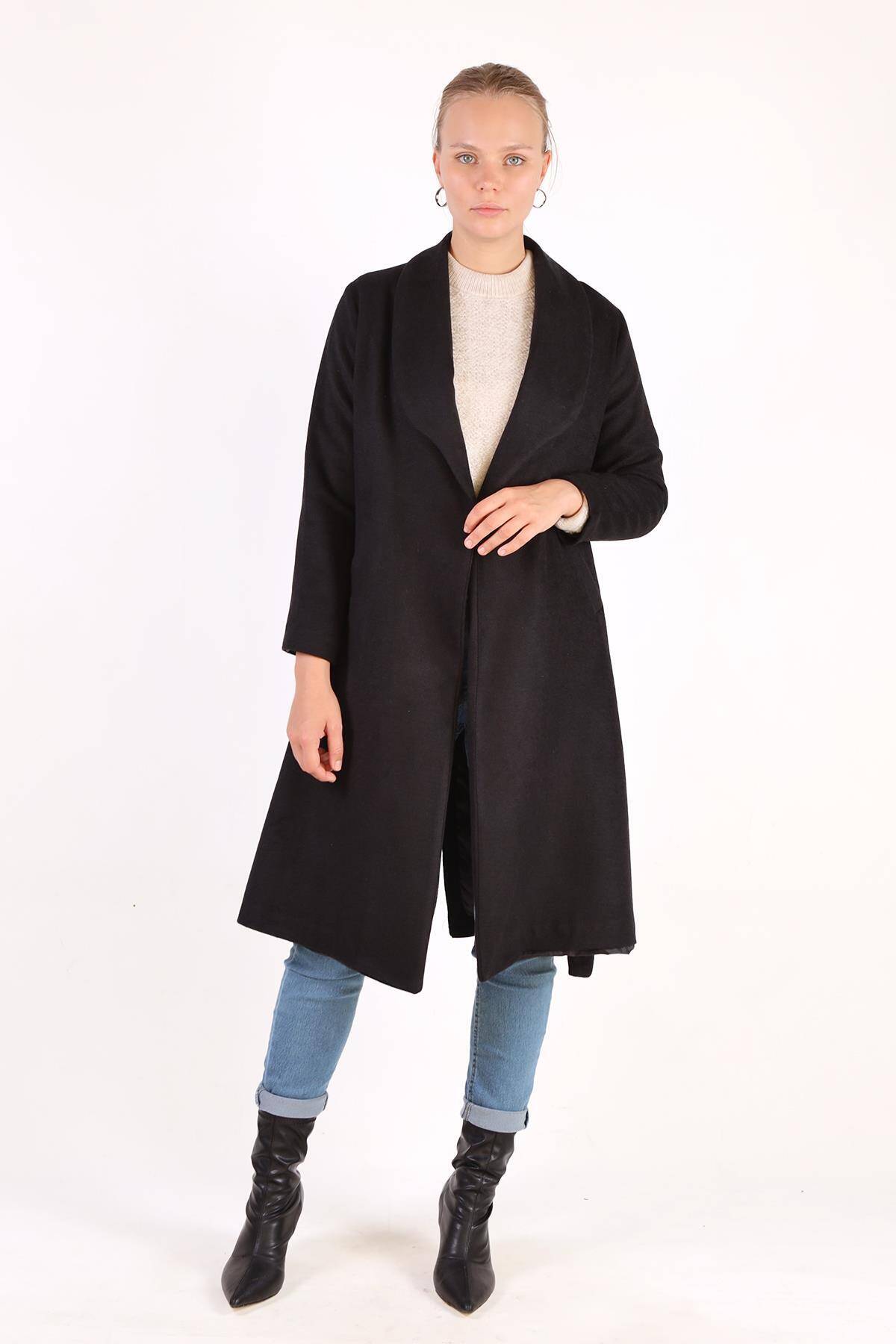 7149A Belden Bağlamalı Uzun Kaşe Kaban Siyah