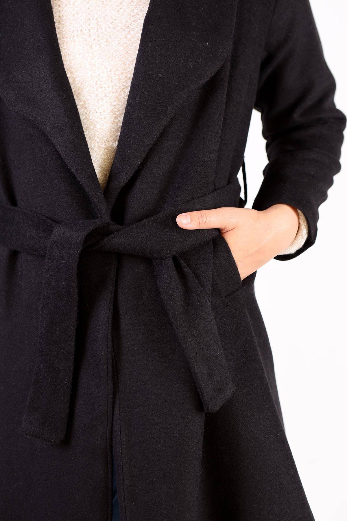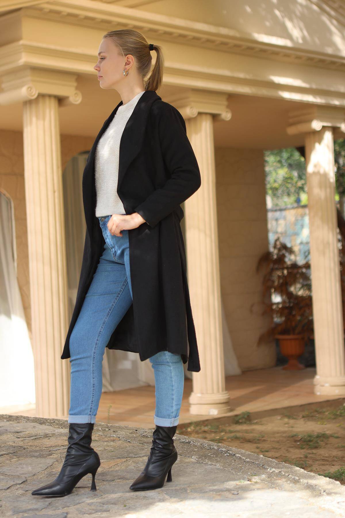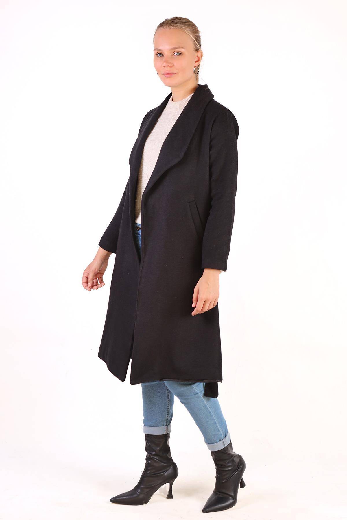 7149A Belden Bağlamalı Uzun Kaşe Kaban Siyah