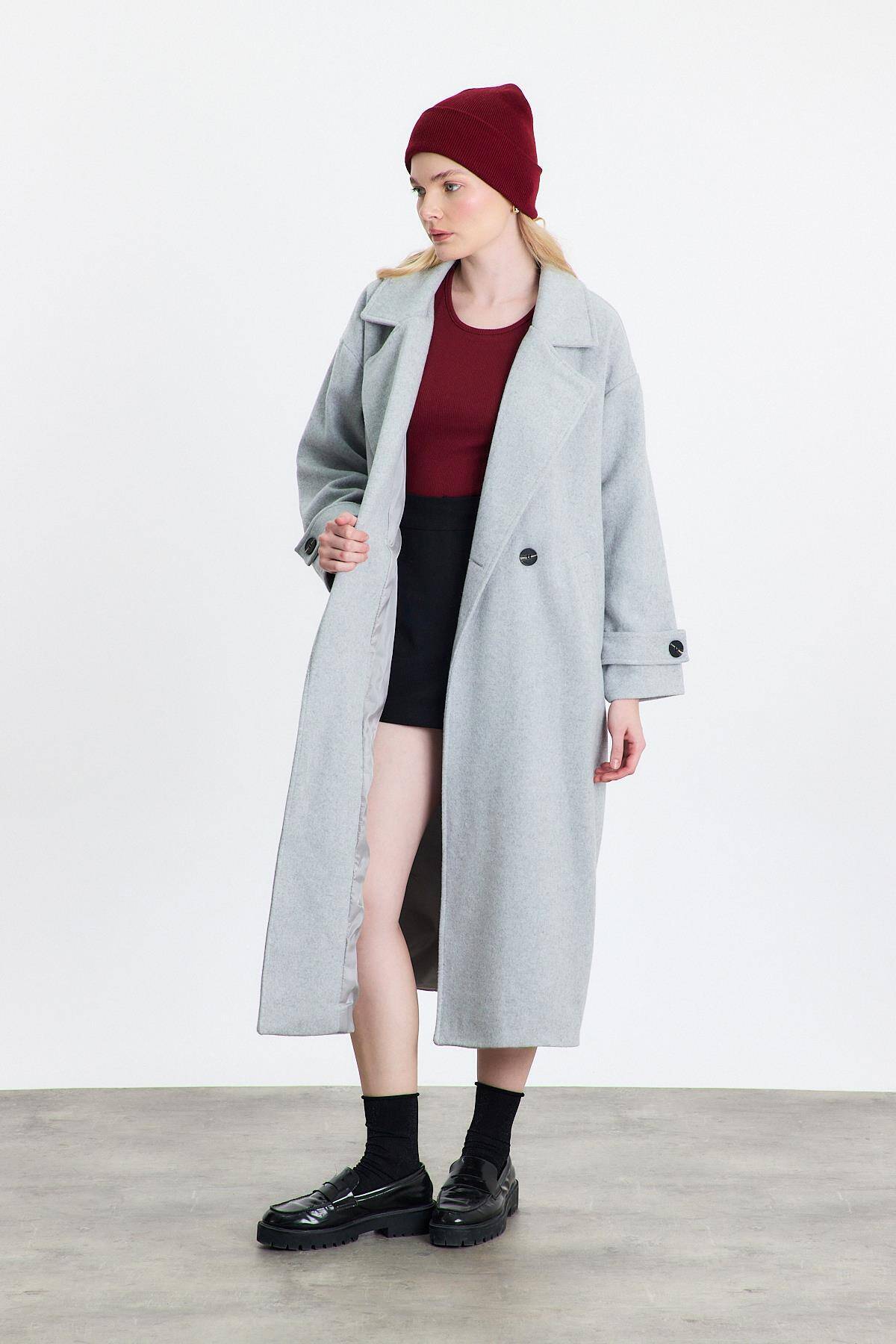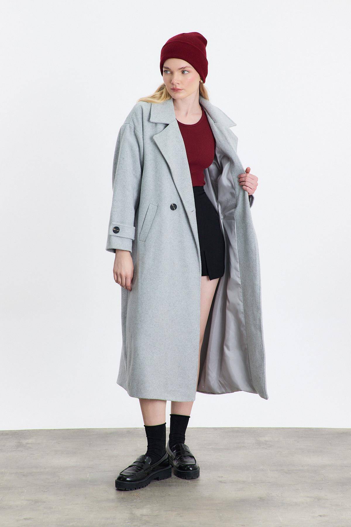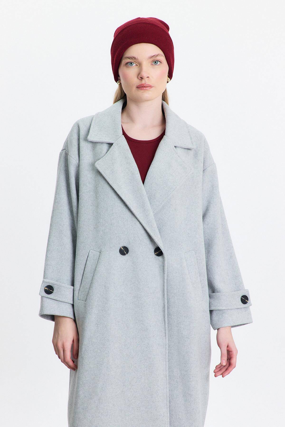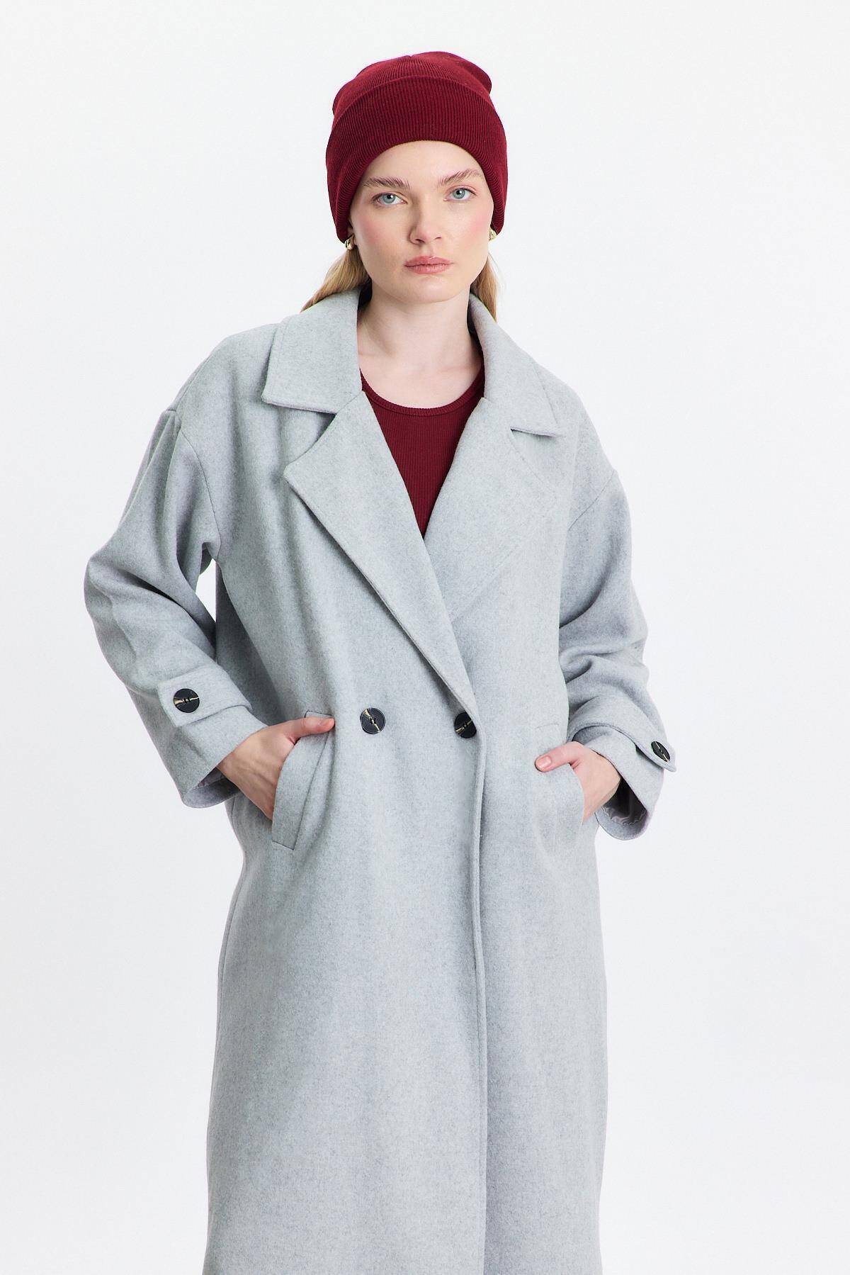 3025A Çift Düğme Cepli Uzun Kaban Gri