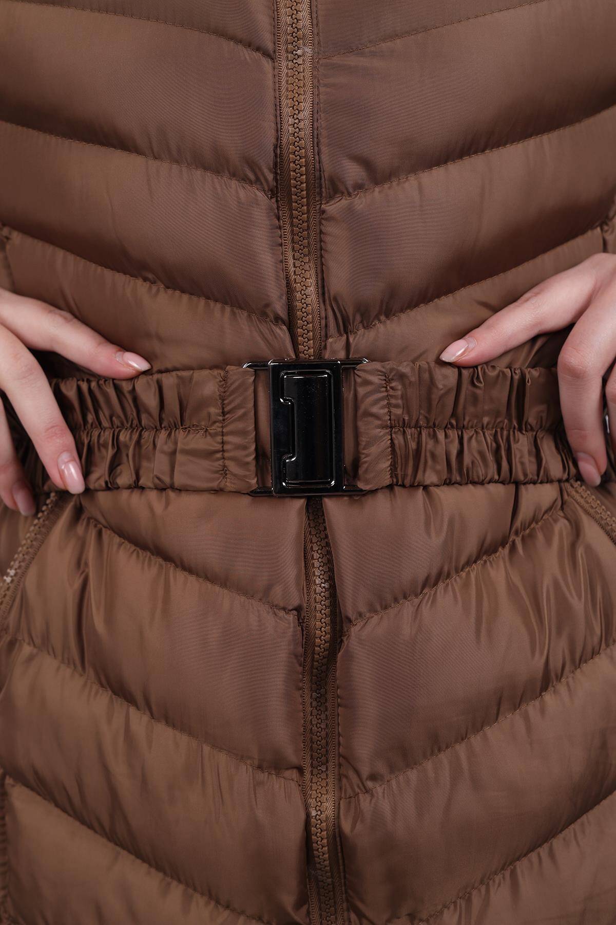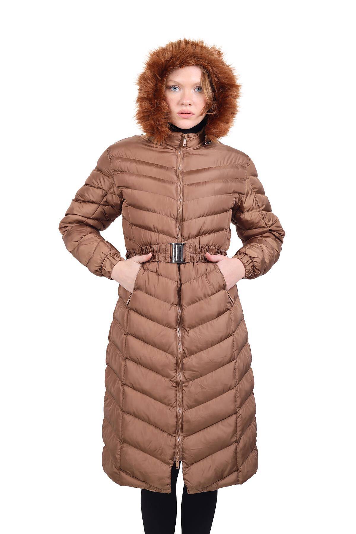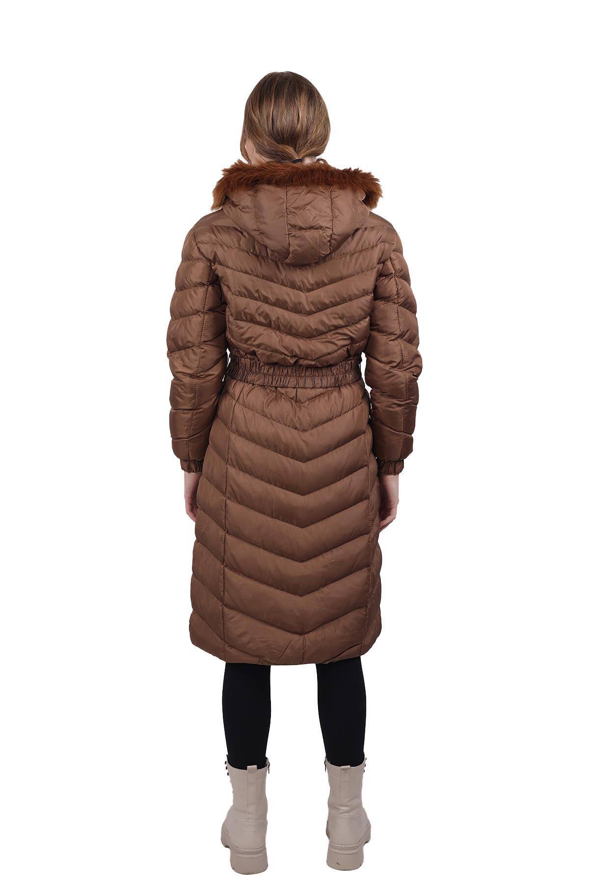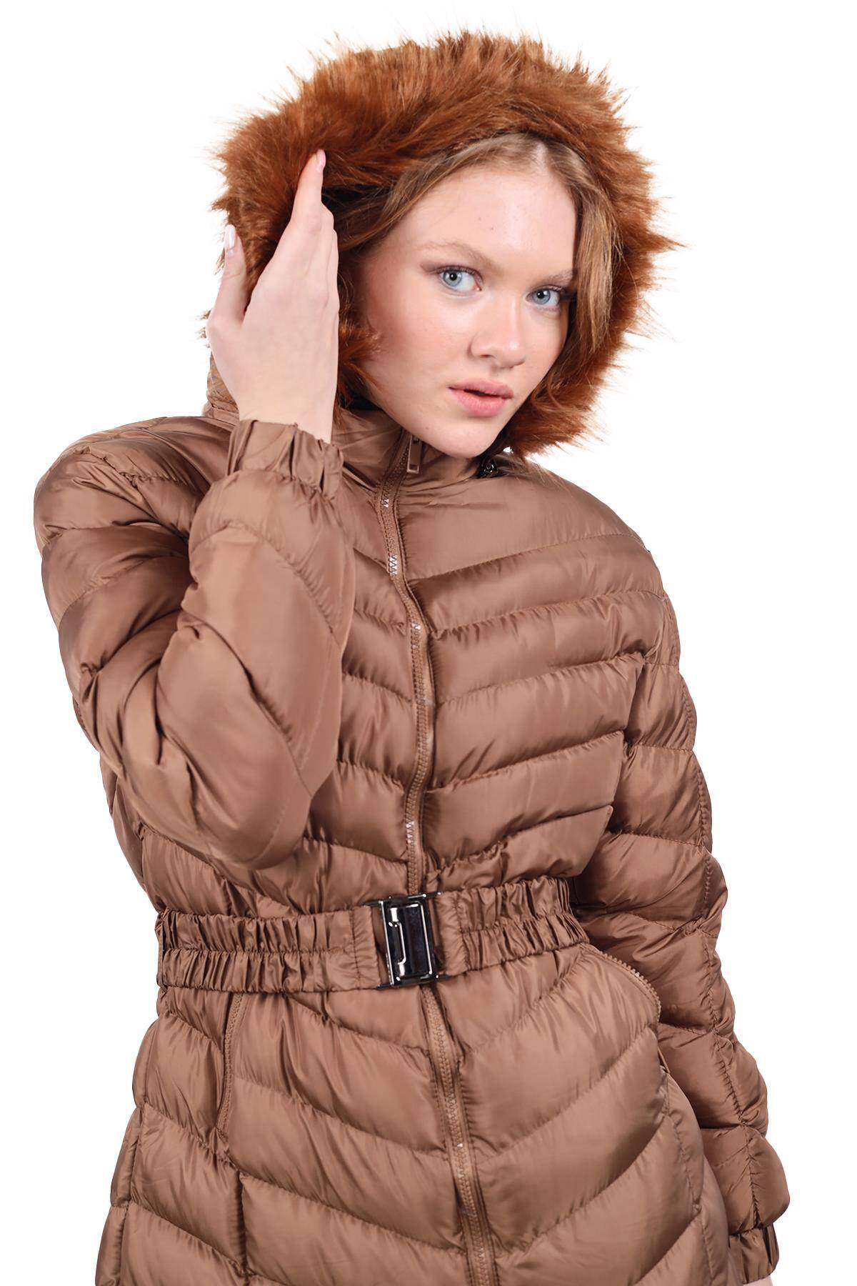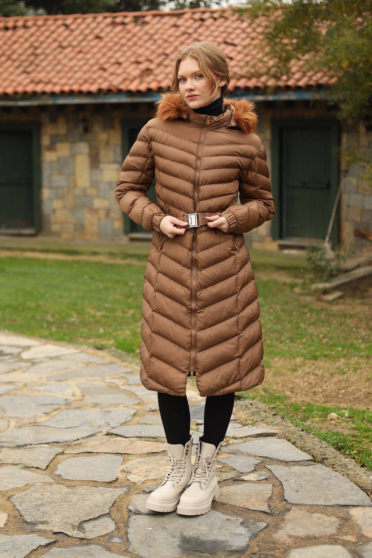 3409 Kapüşonlu Uzun Şişme Mont Taba