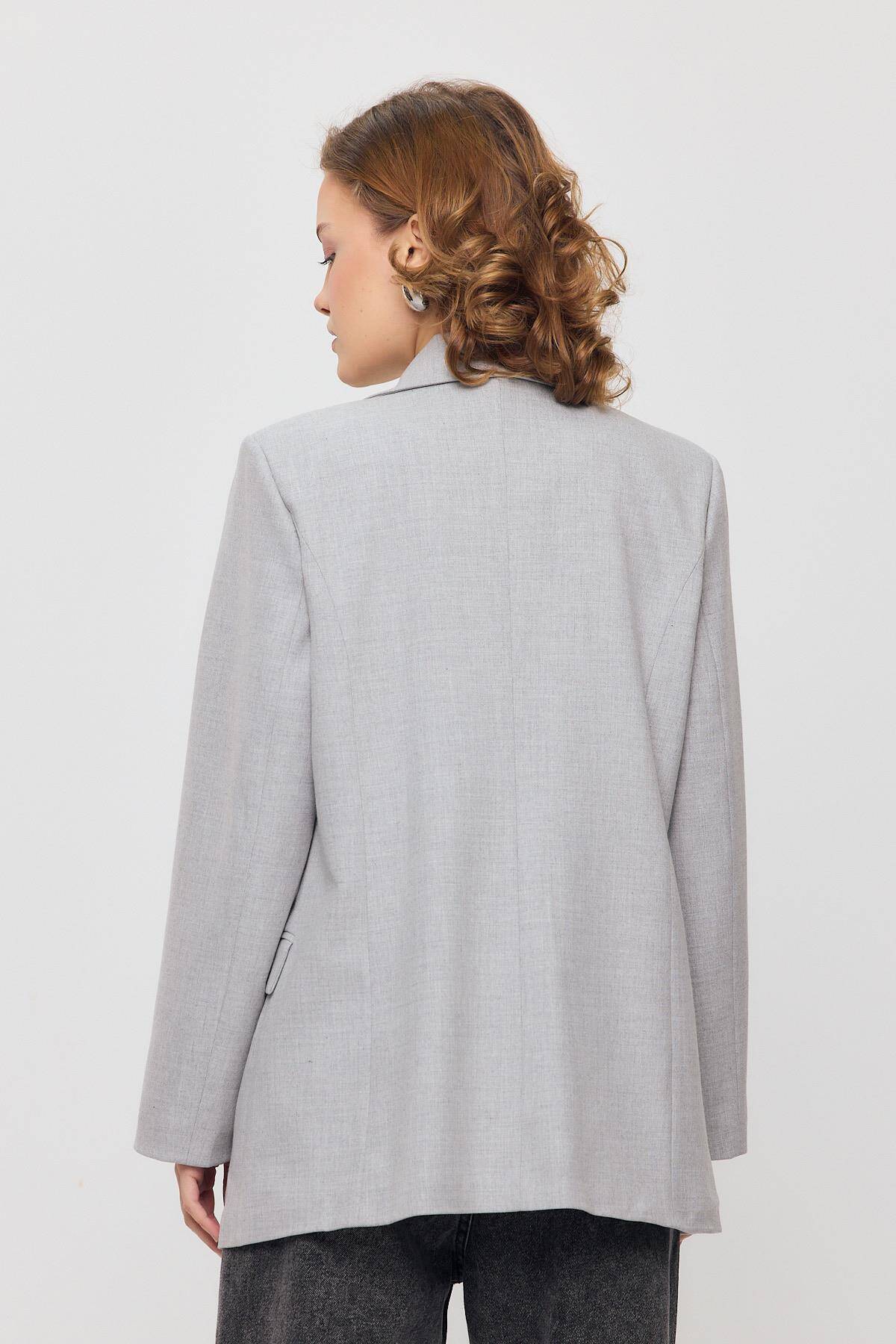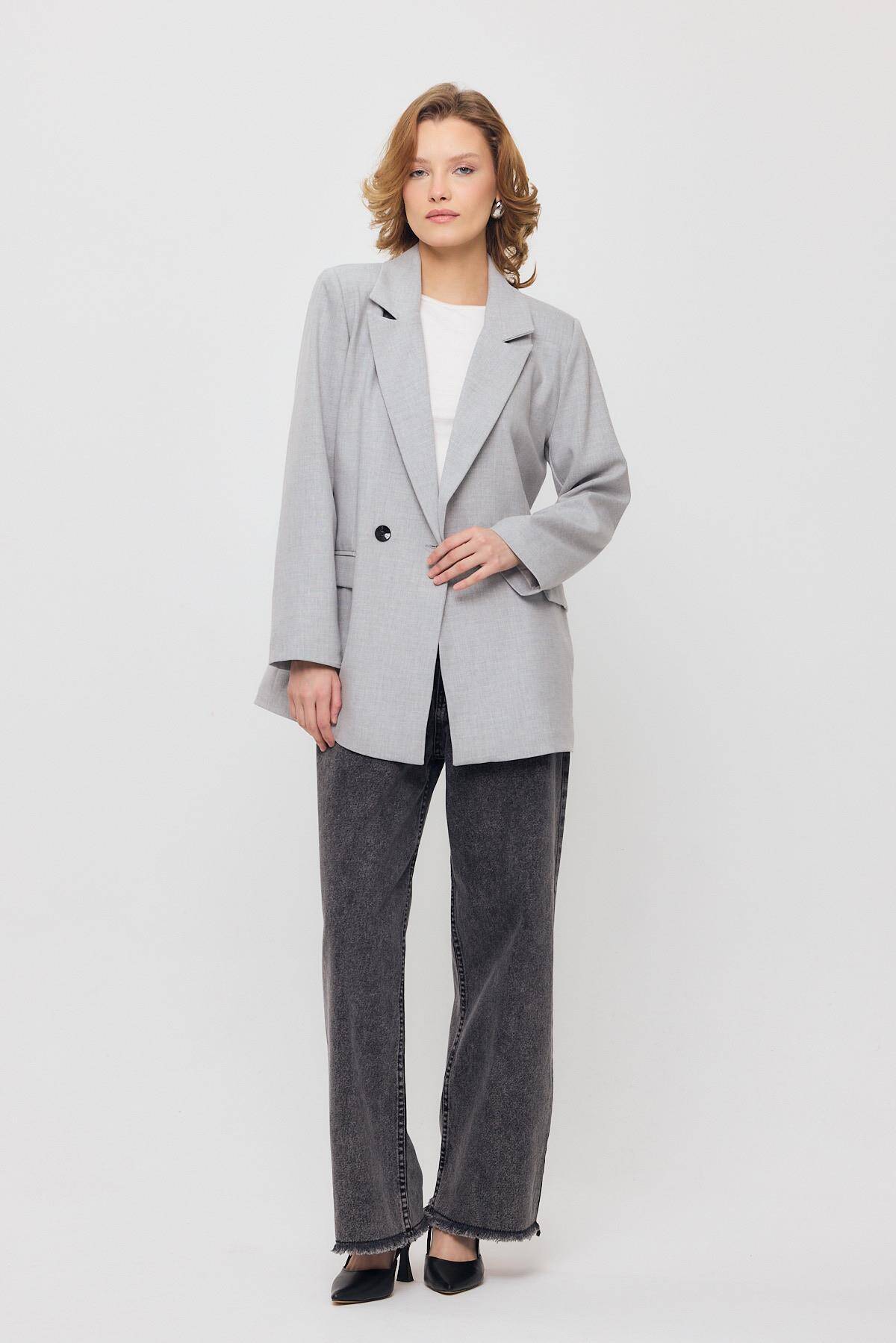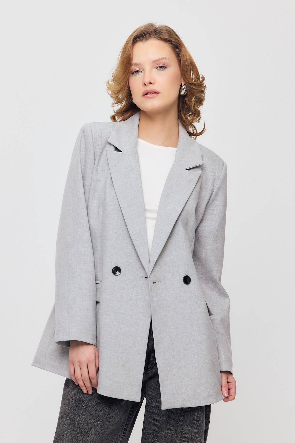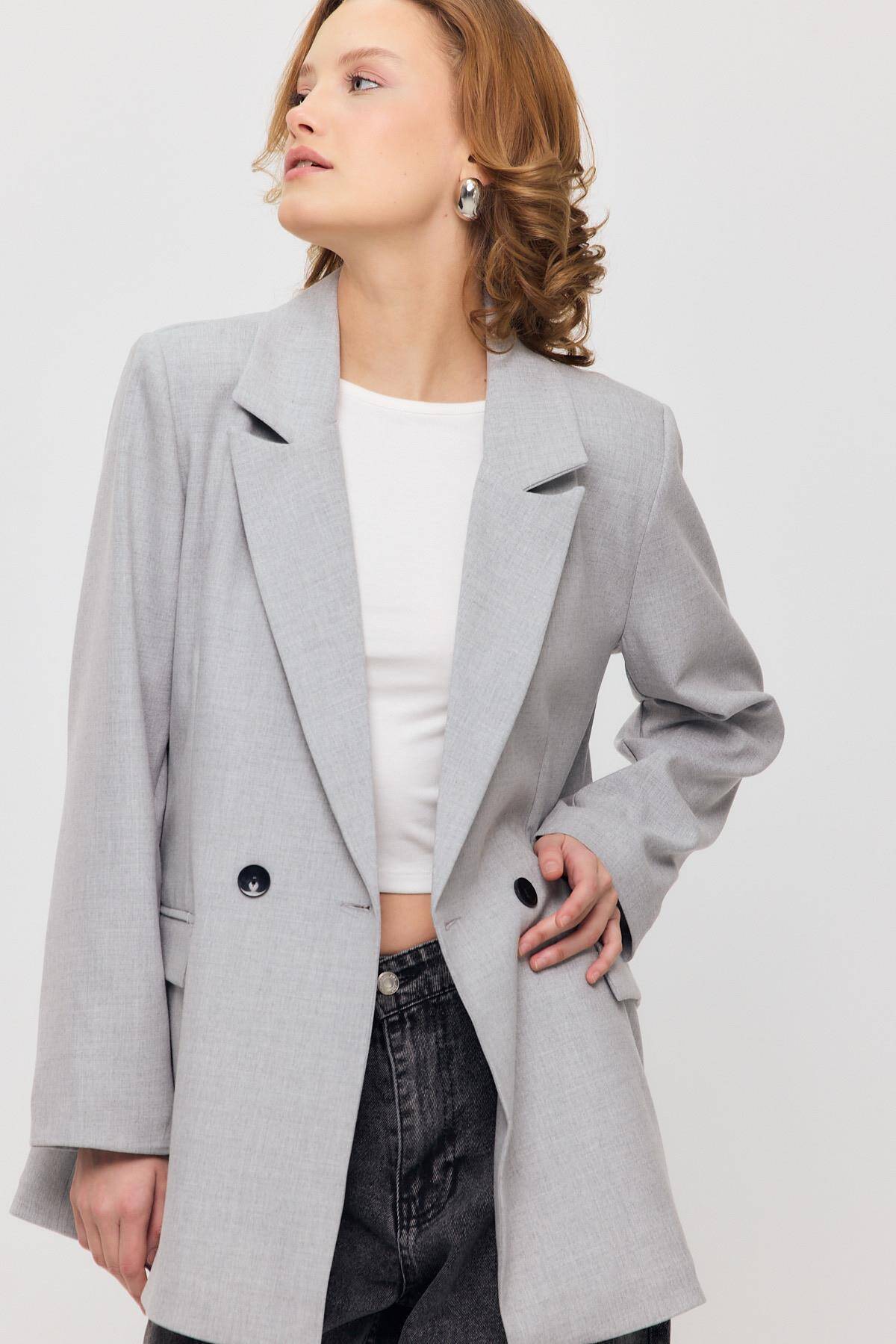 3882 Çift Düğme Cep Kapaklı Ceket Açık Gri