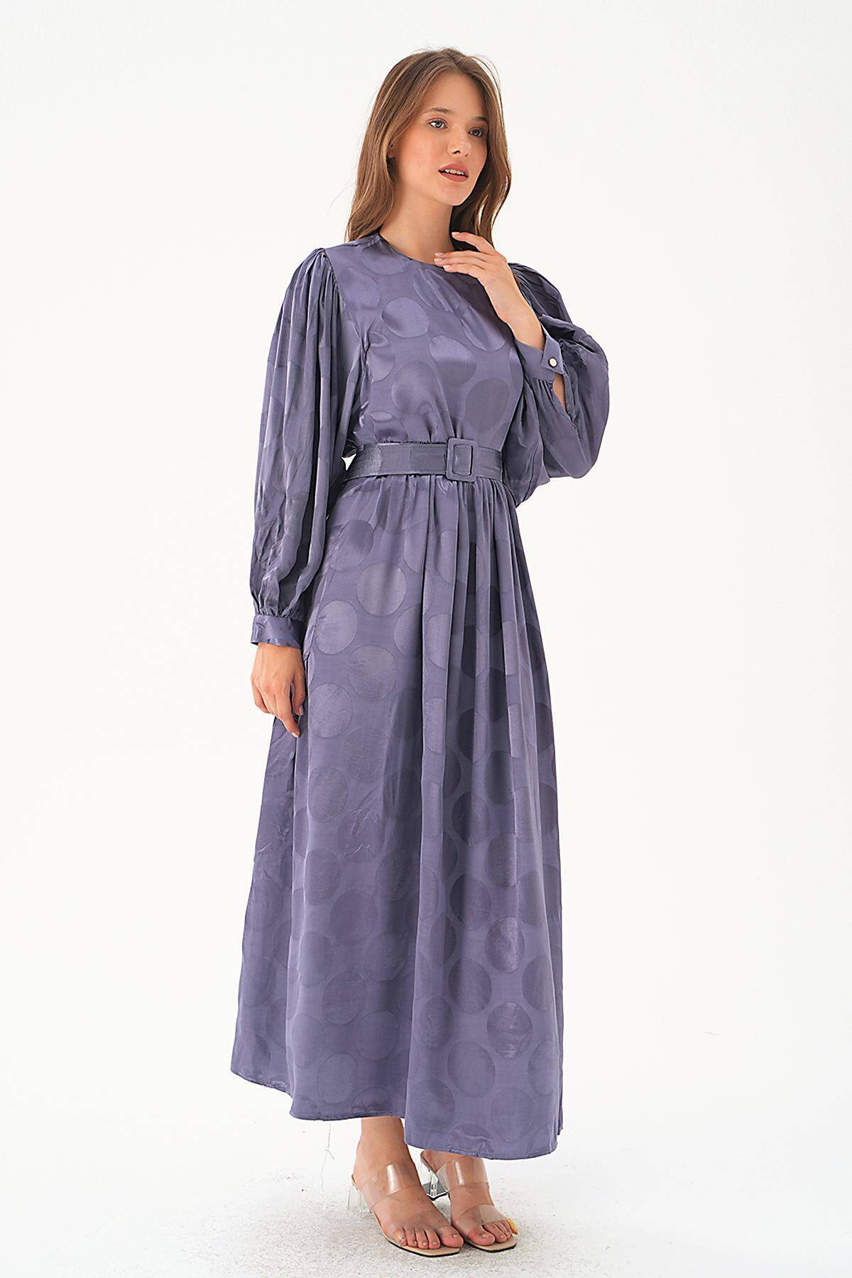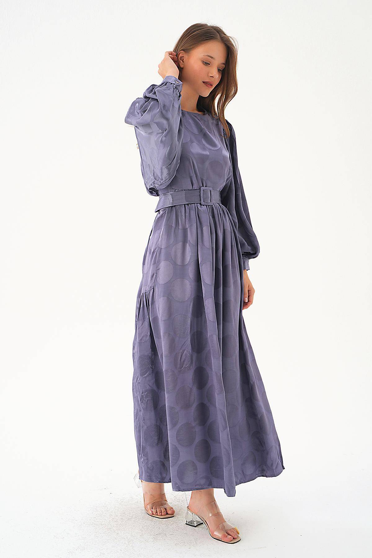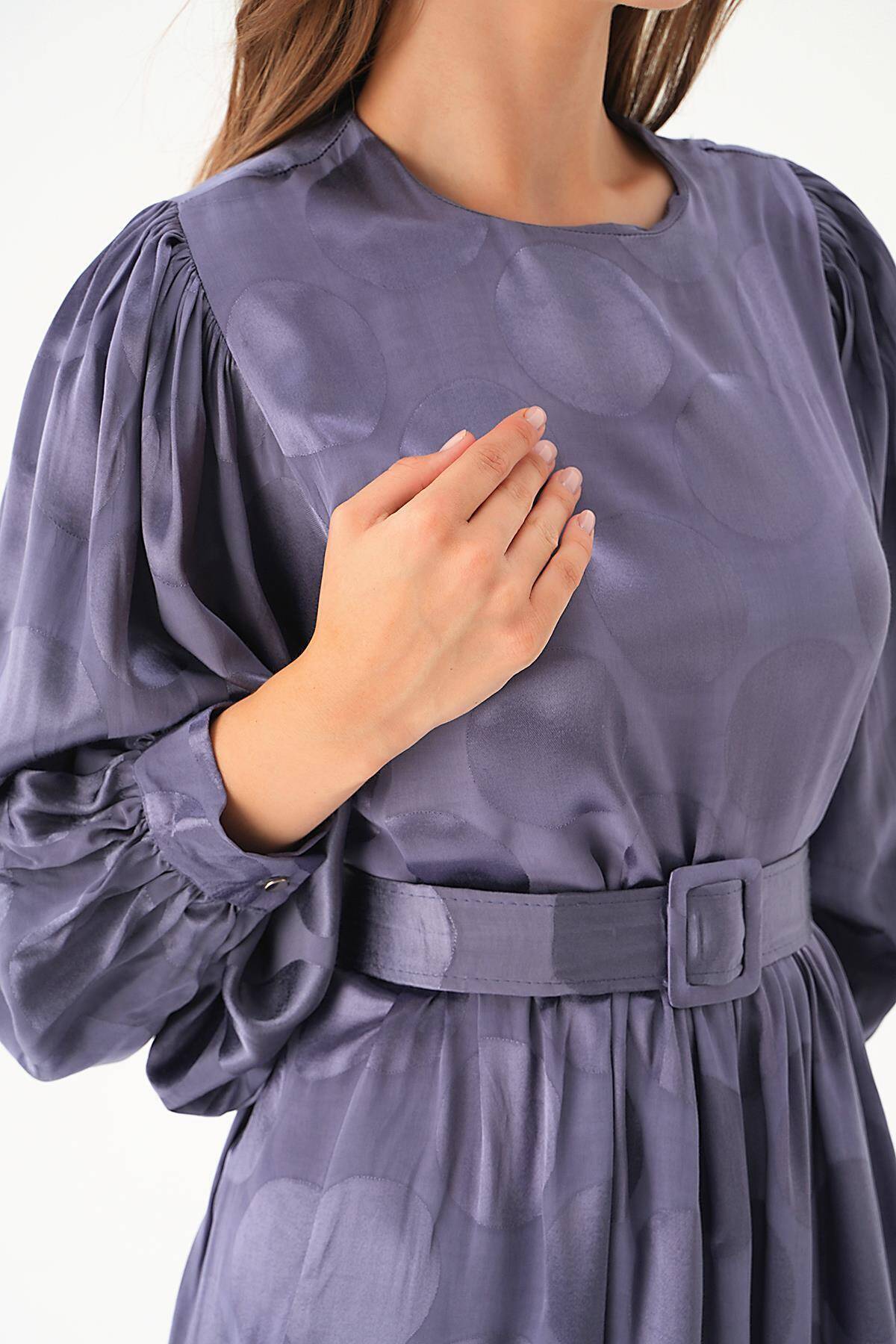 4215A Puantiye Desen Kemerli Elbise Leylak