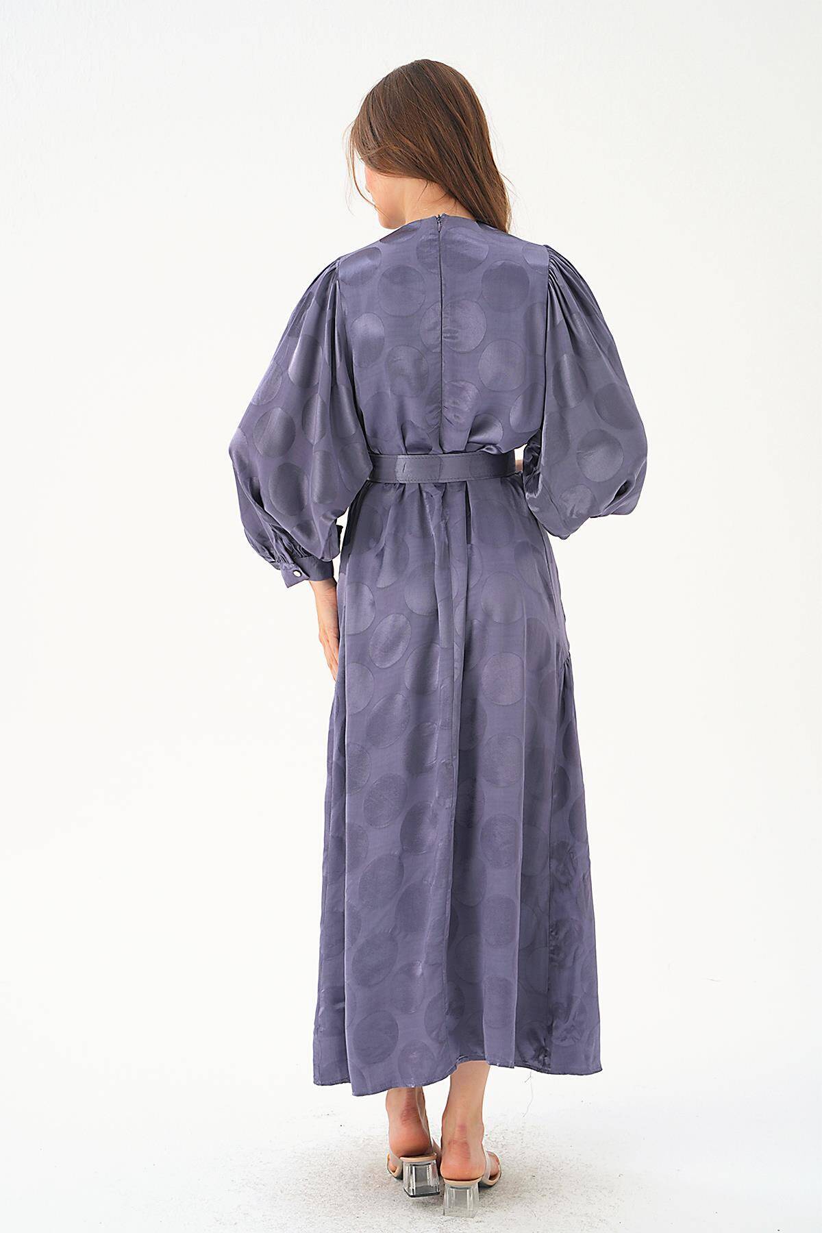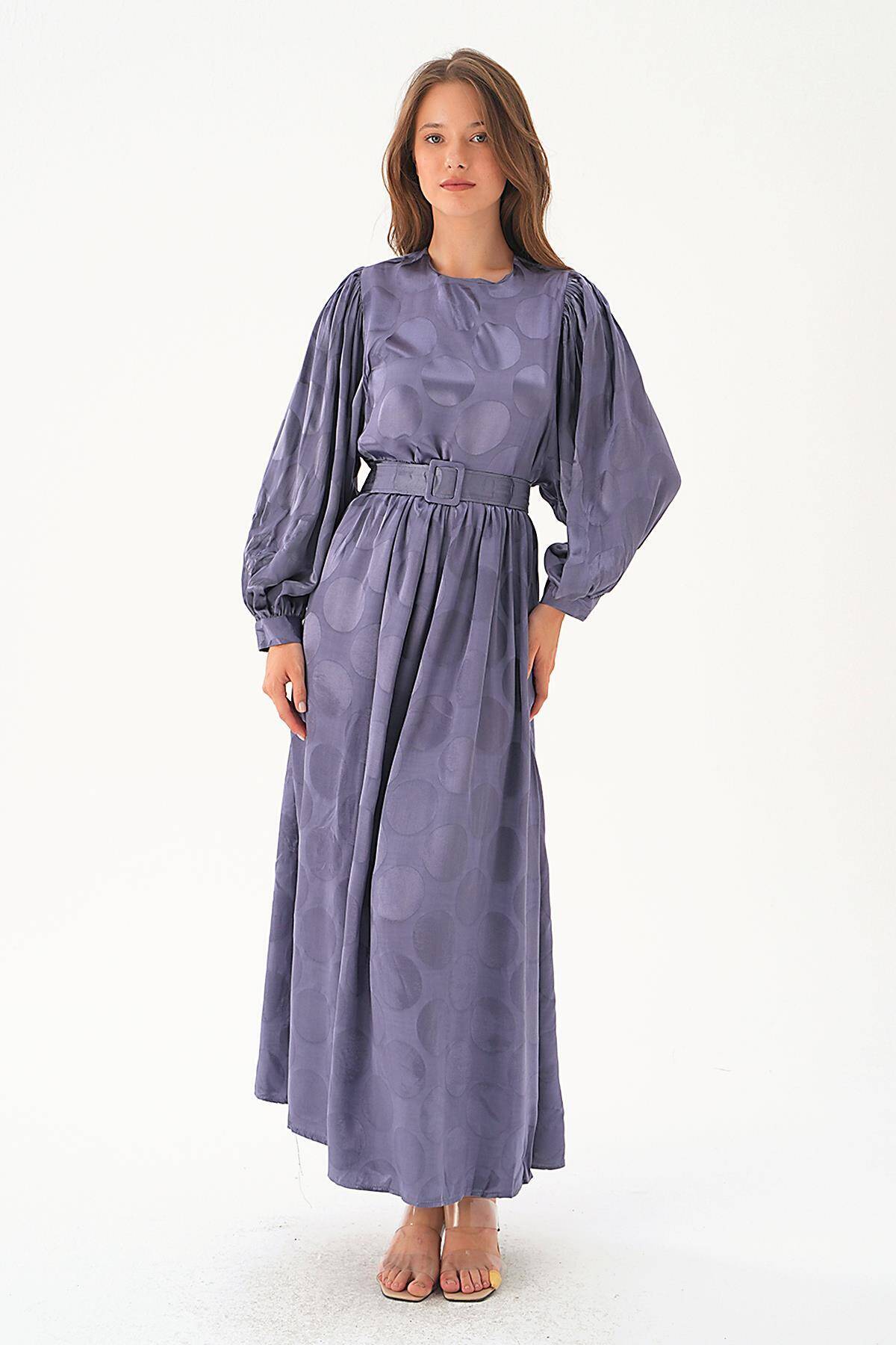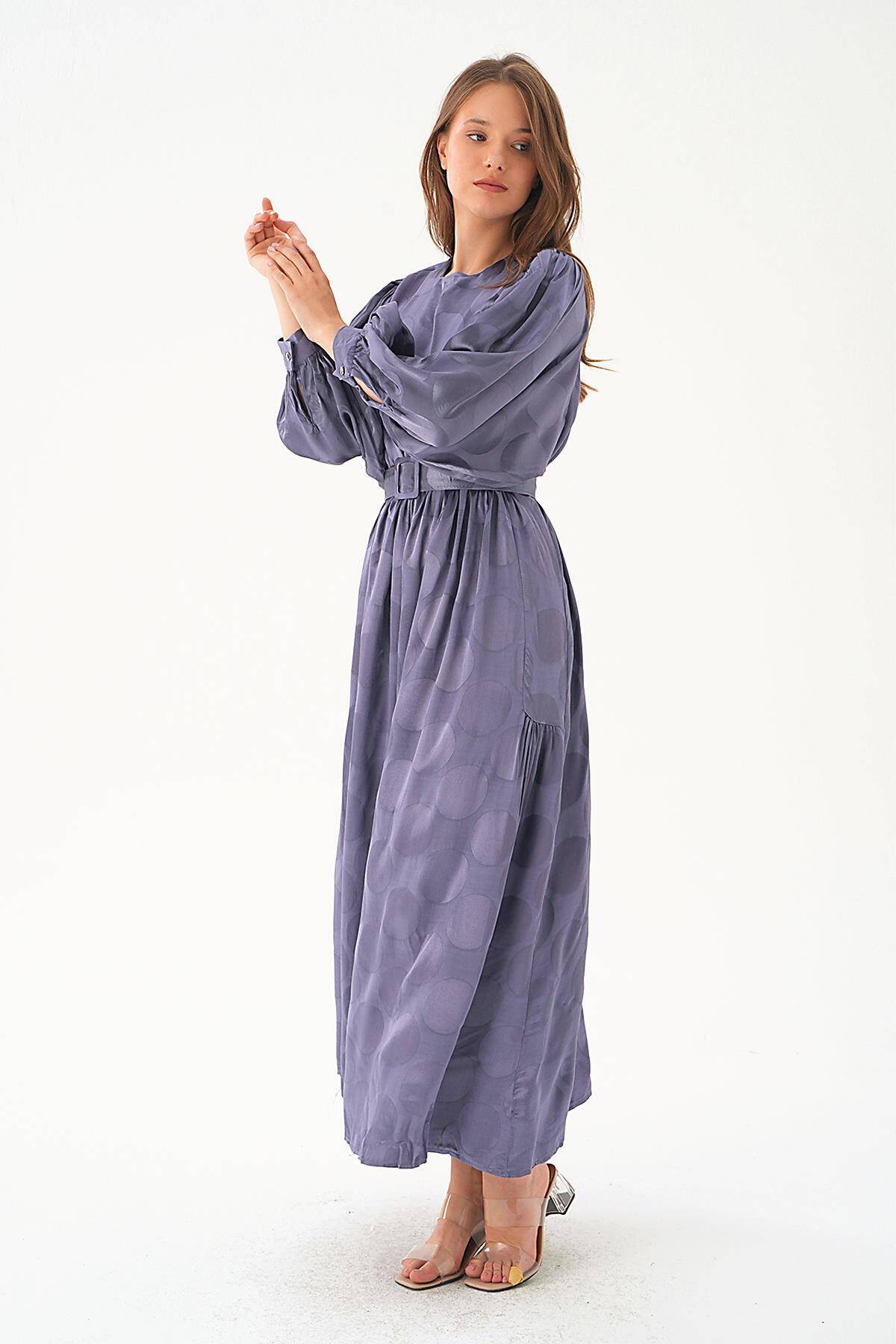 4215A Puantiye Desen Kemerli Elbise Leylak