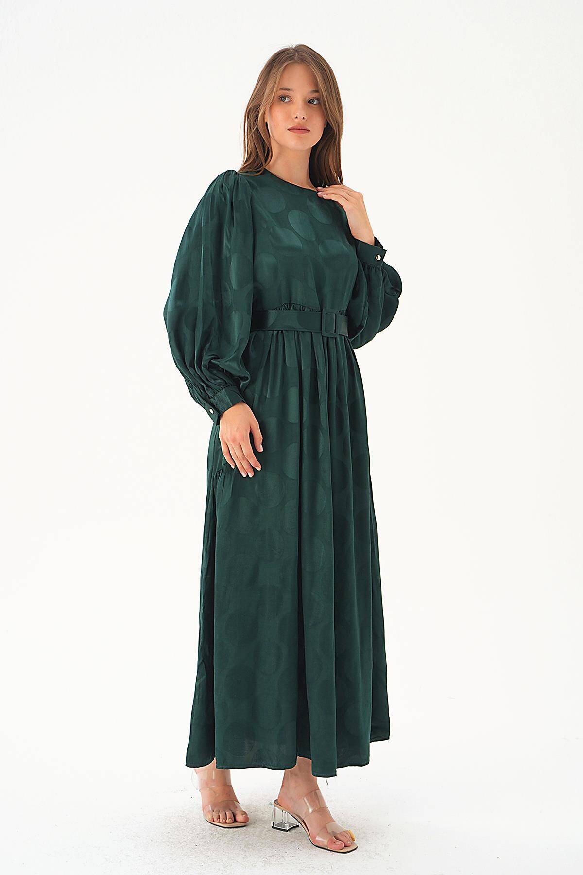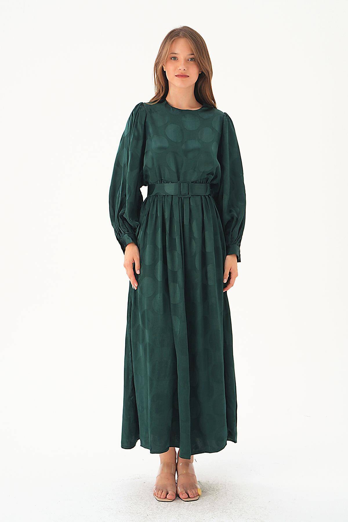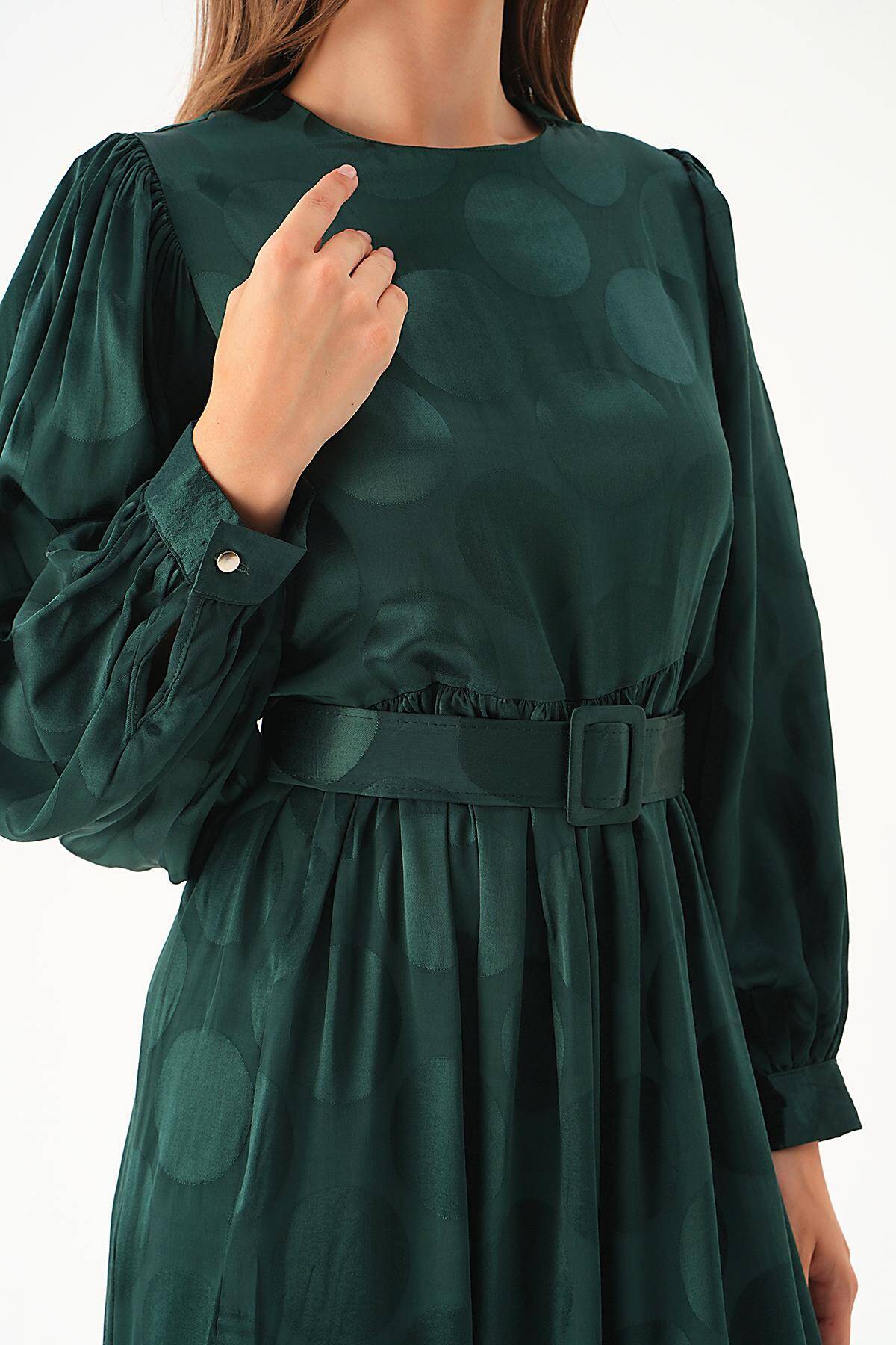 4215A Puantiye Desen Kemerli Elbise Zümrüt