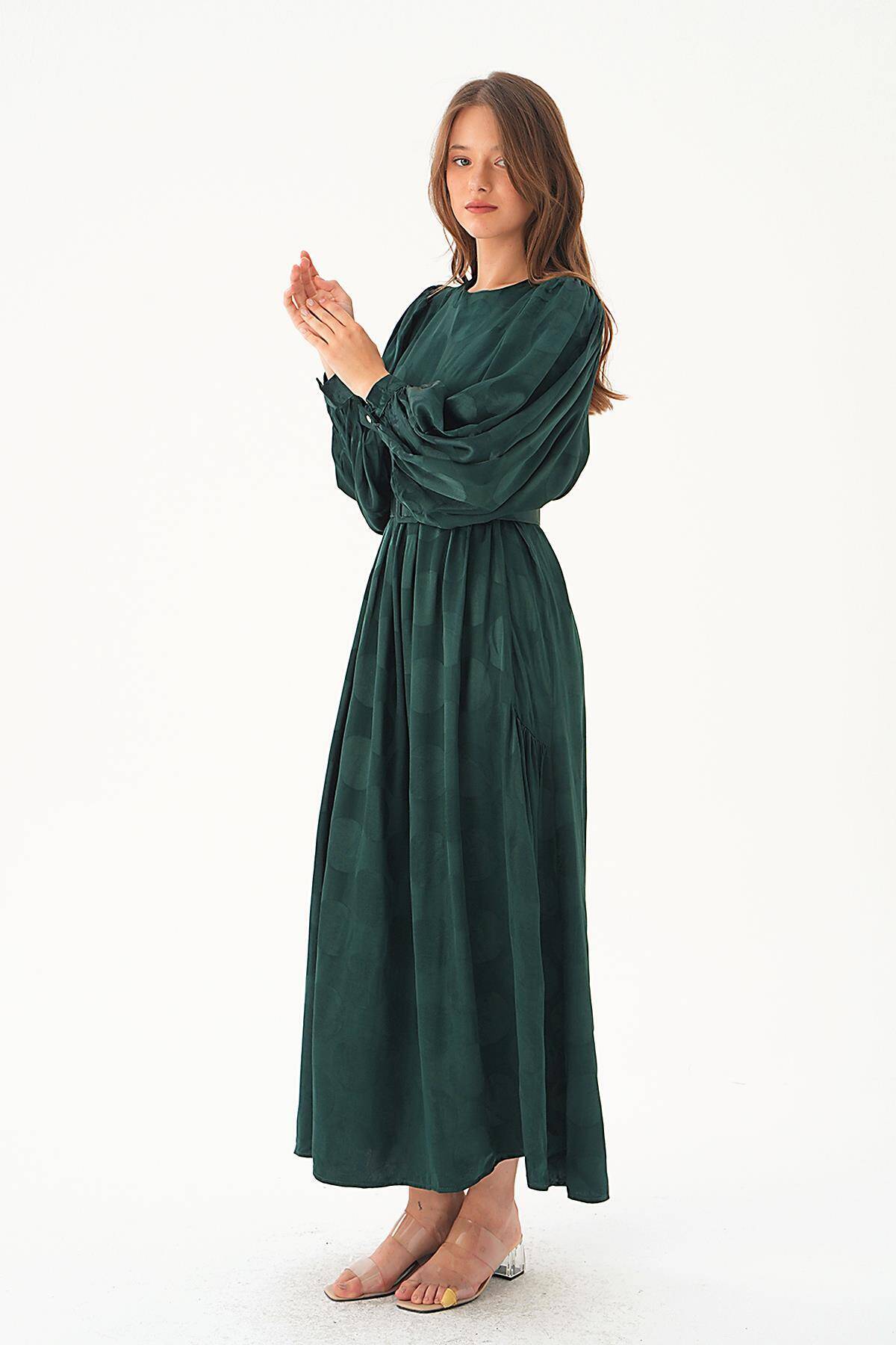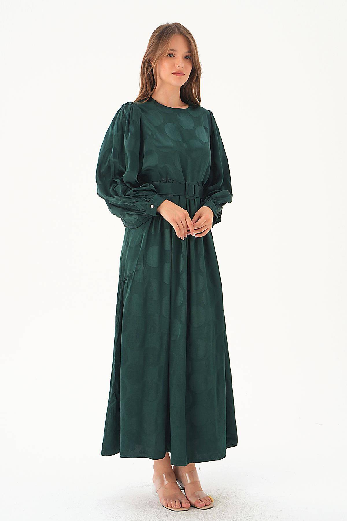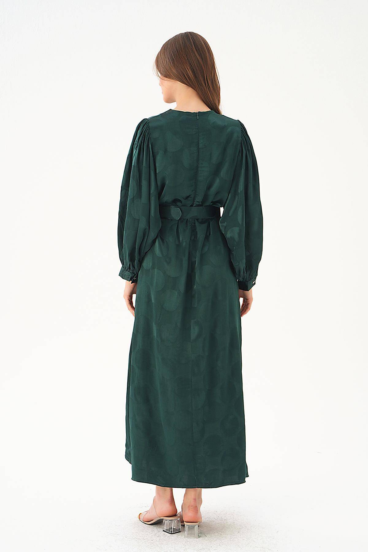 4215A Puantiye Desen Kemerli Elbise Zümrüt