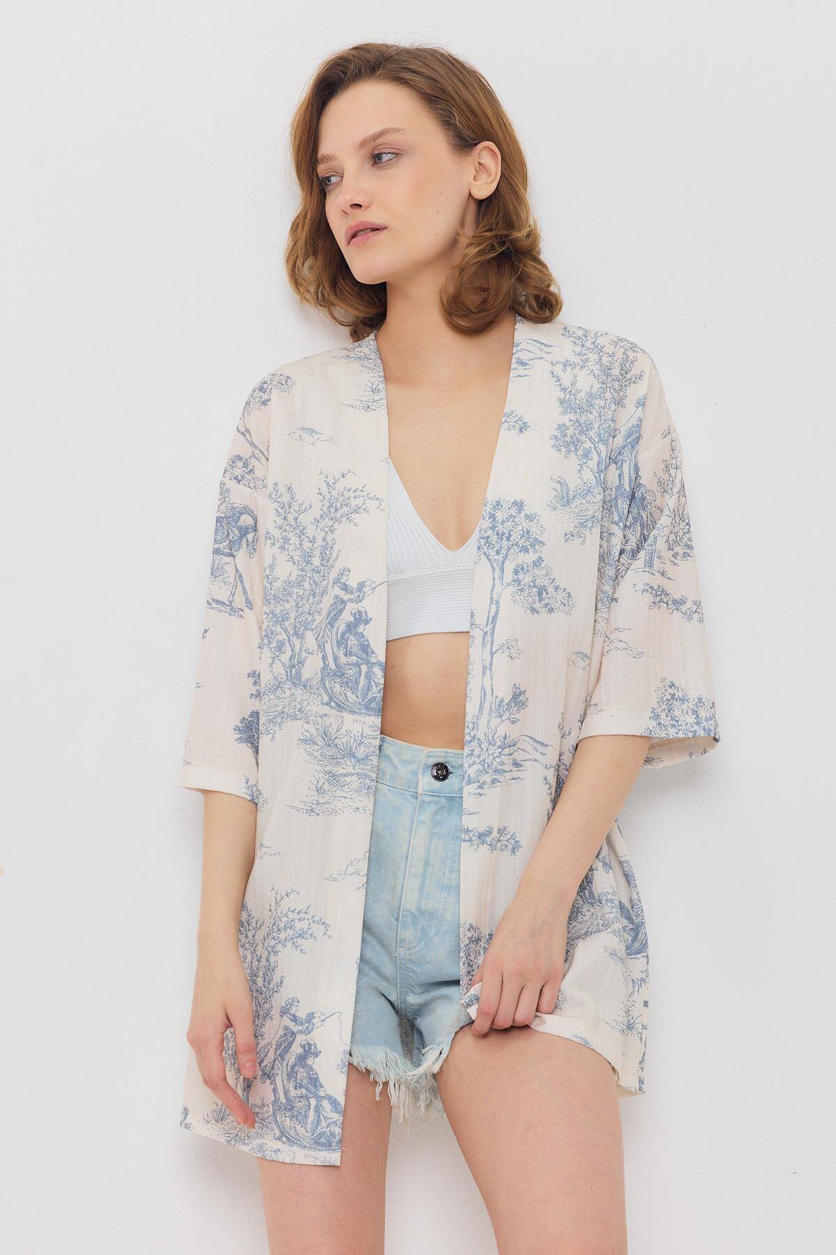 4441A Çiçekli Kısa Kol Kimono Mavi