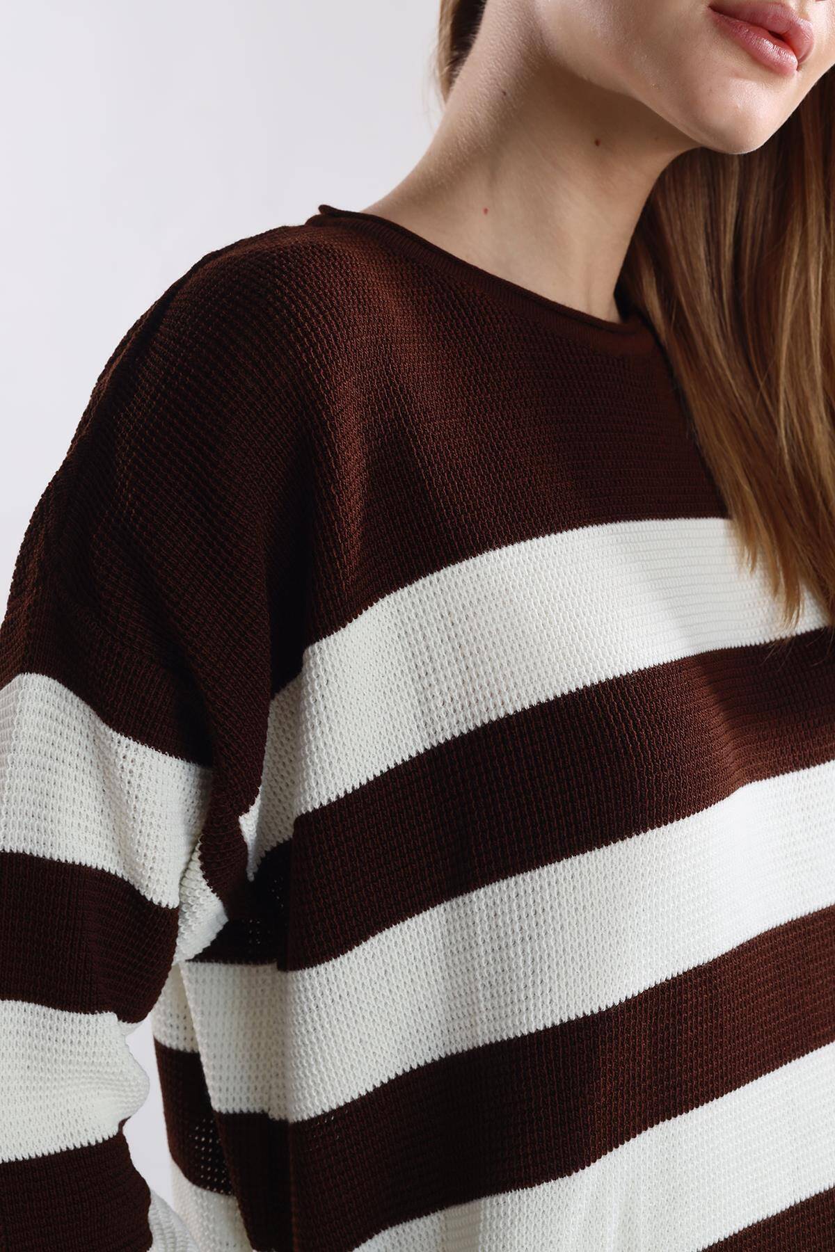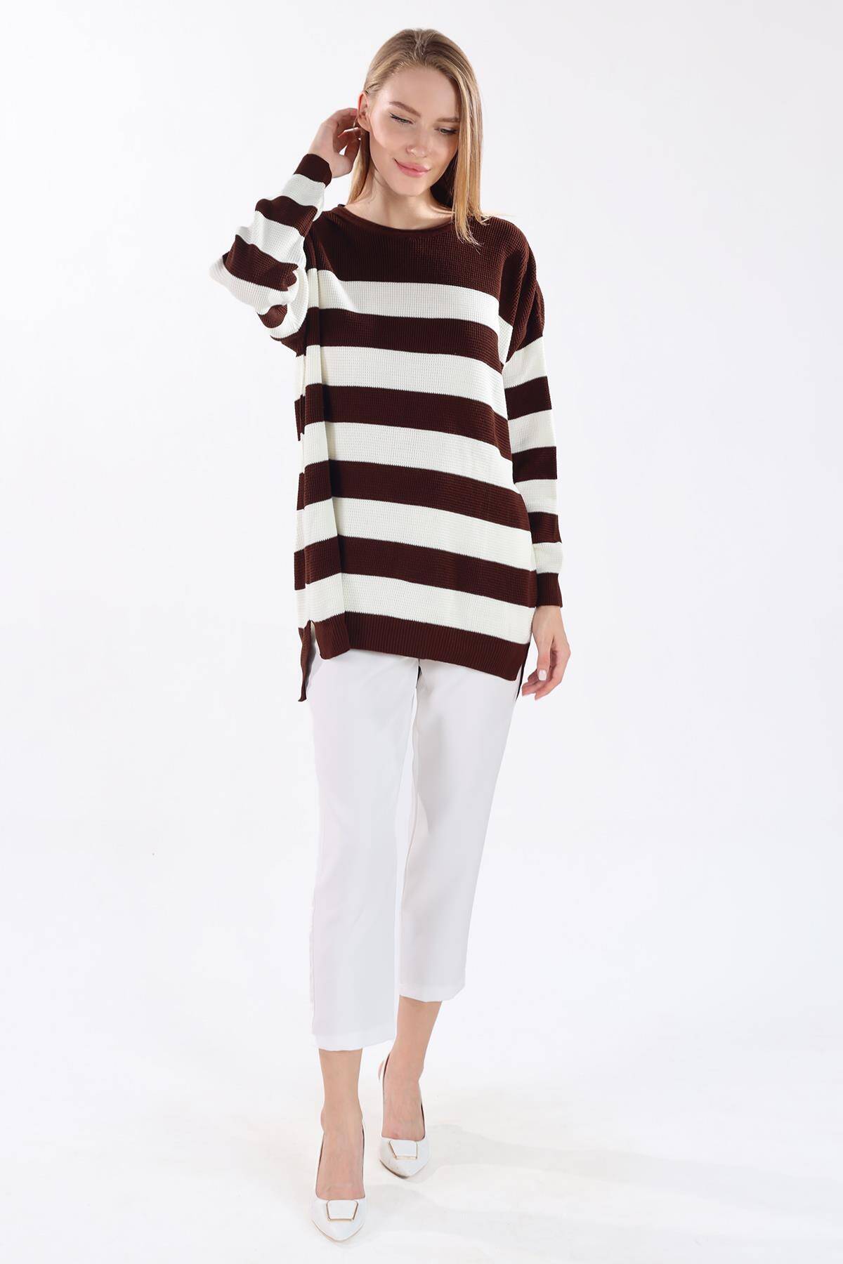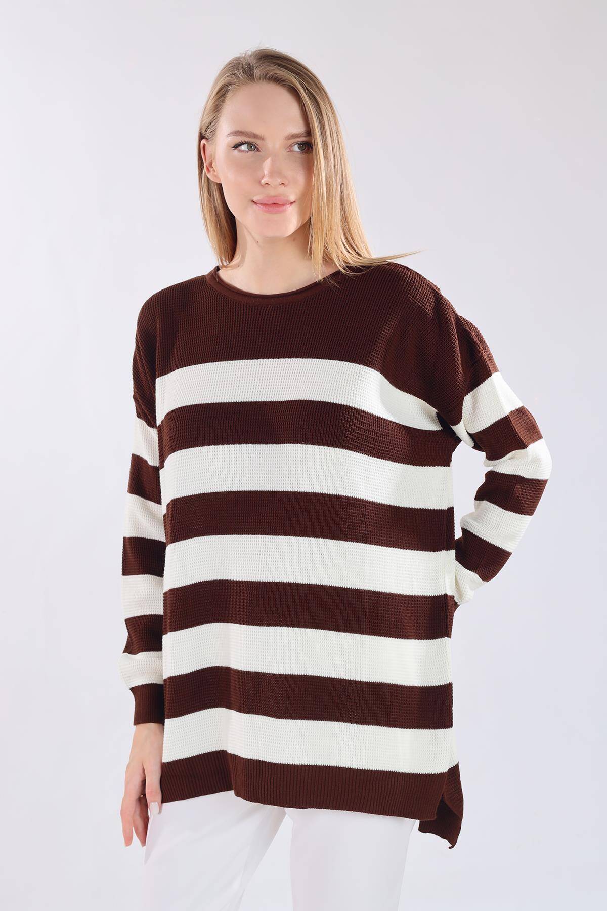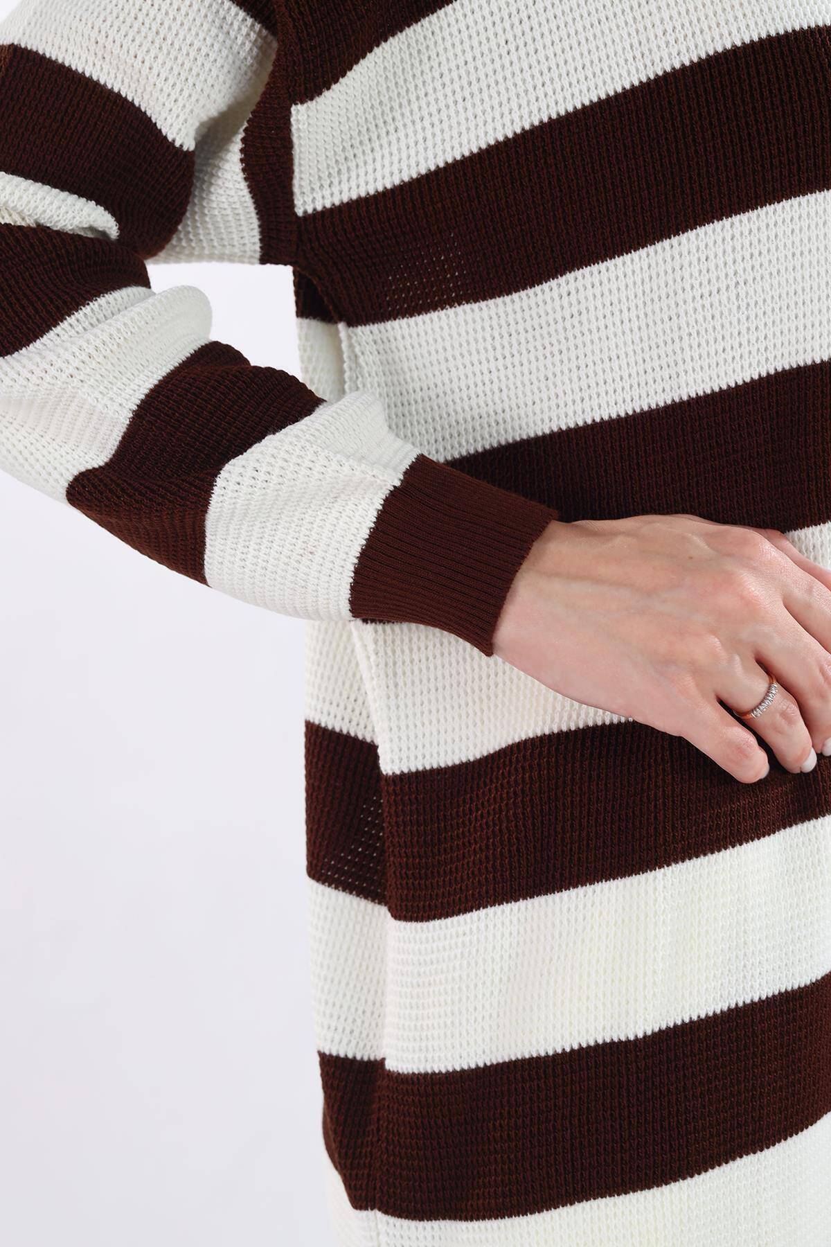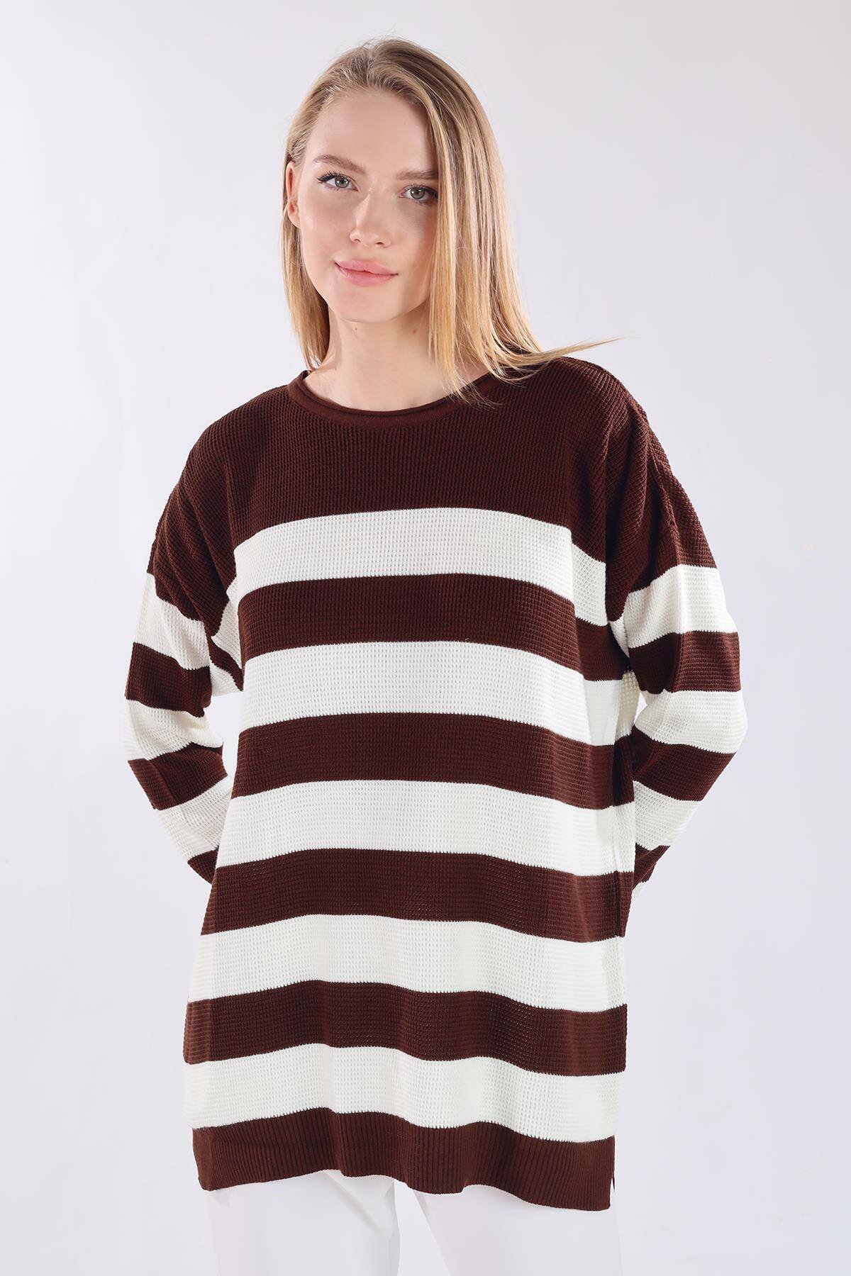 5380 Bisiklet Yaka Çizgili Tunik Acı Kahve