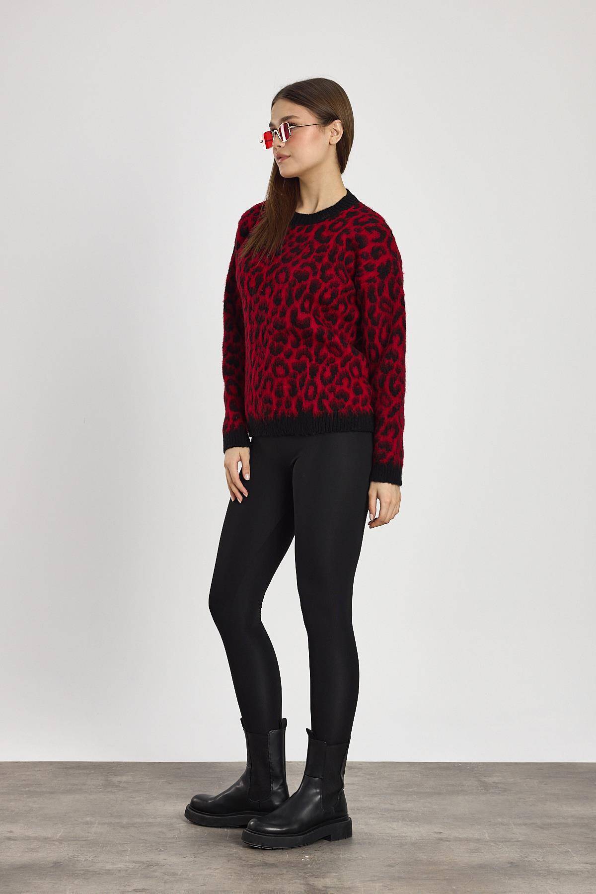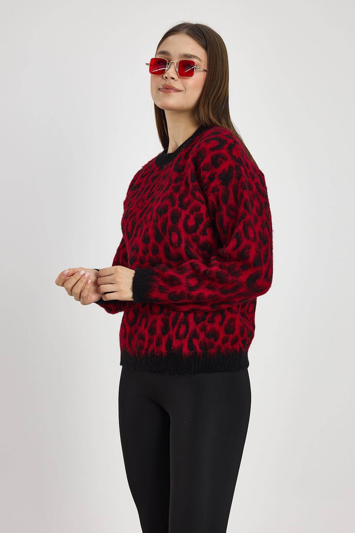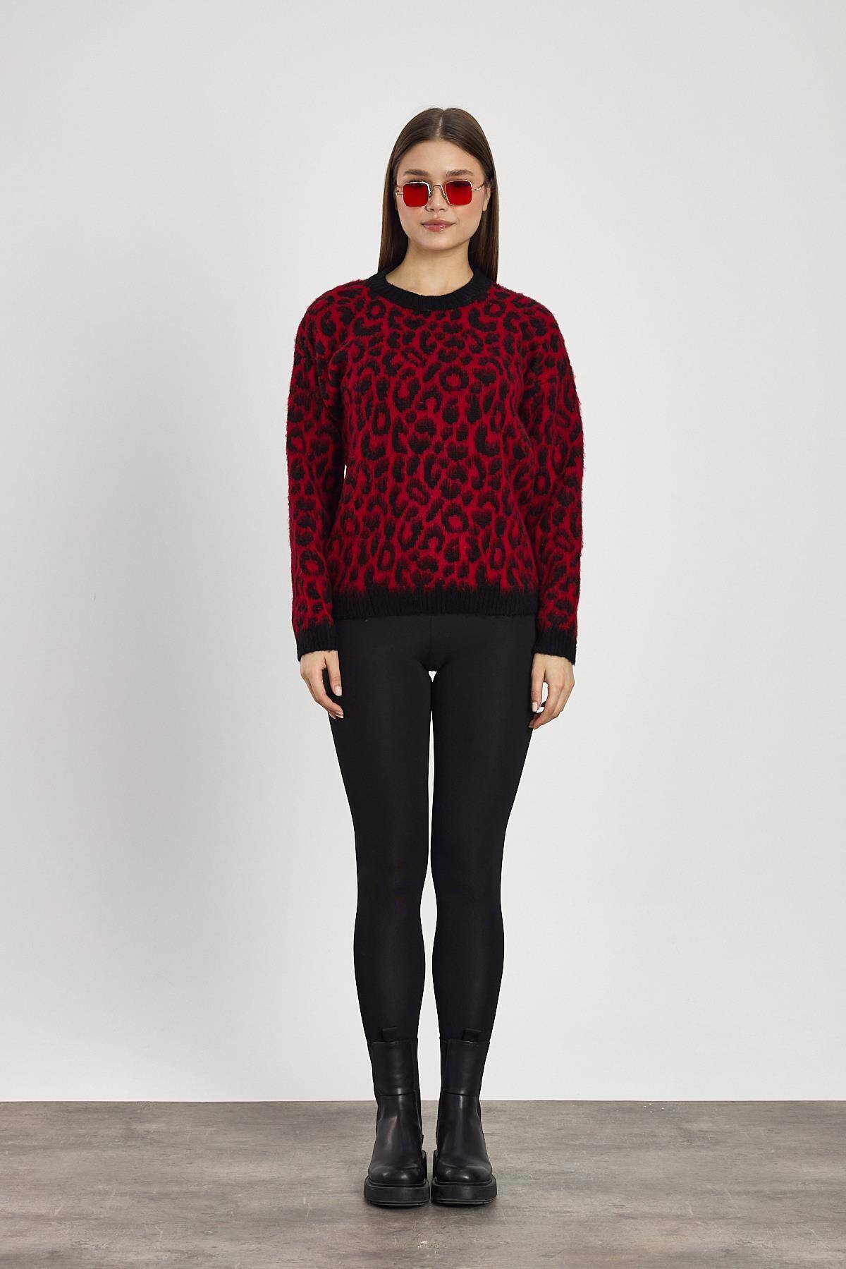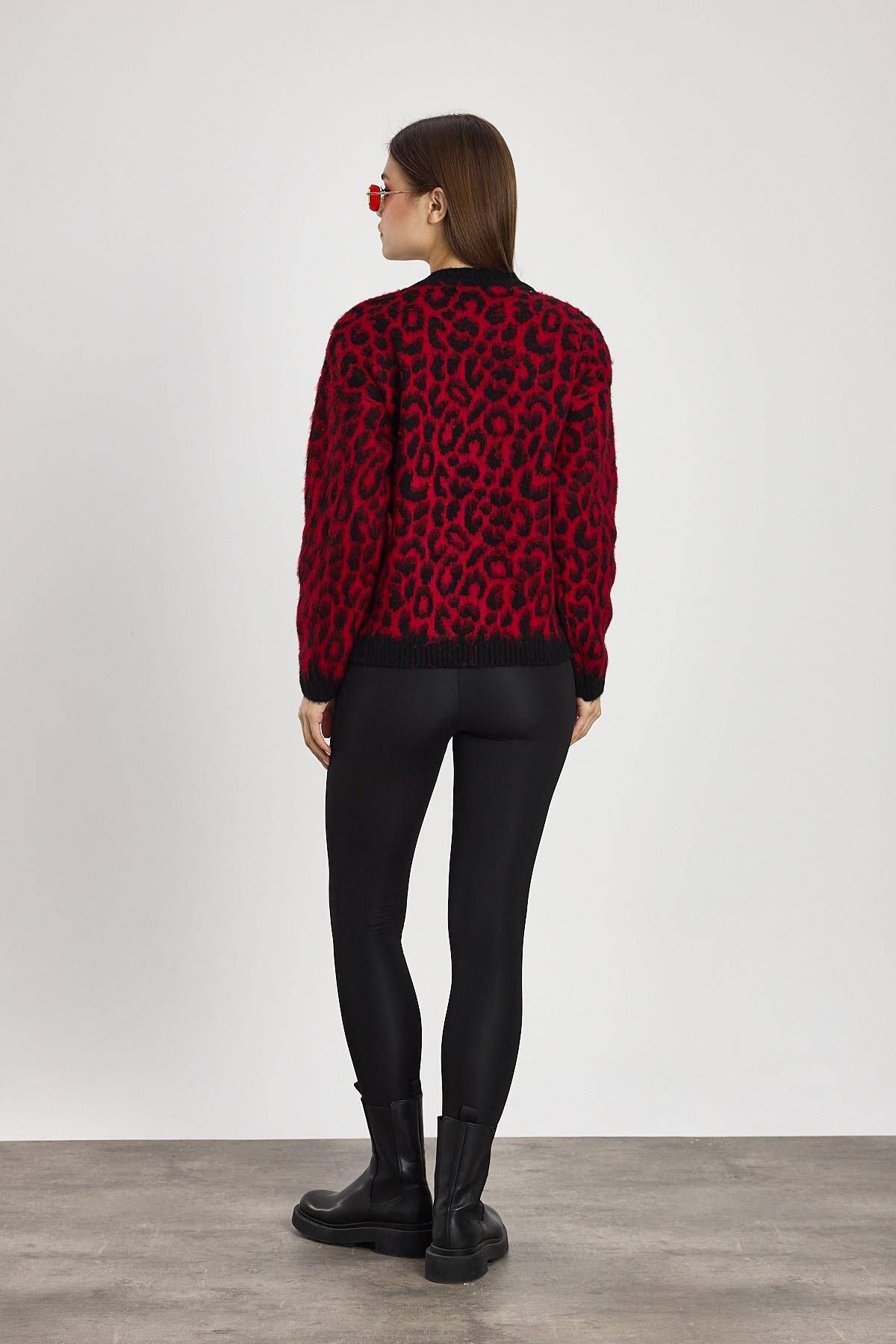 6702 Leopar Desen Kazak Kırmızı