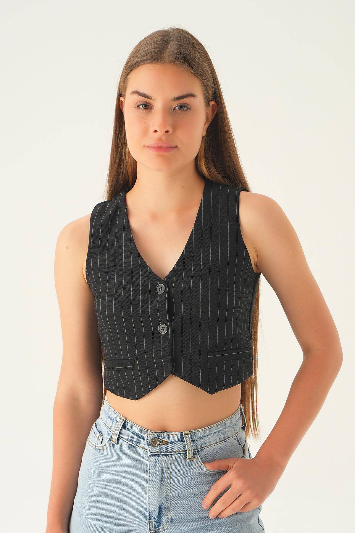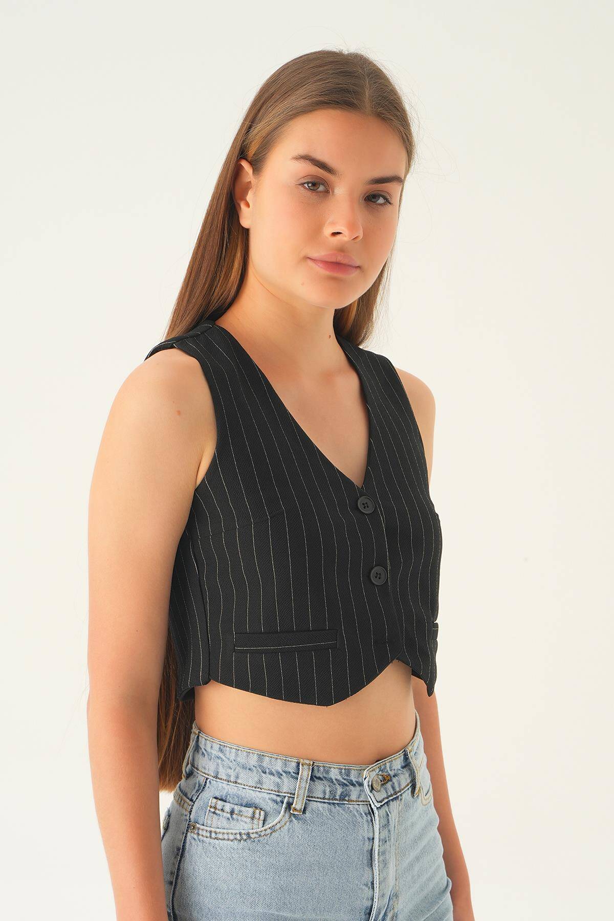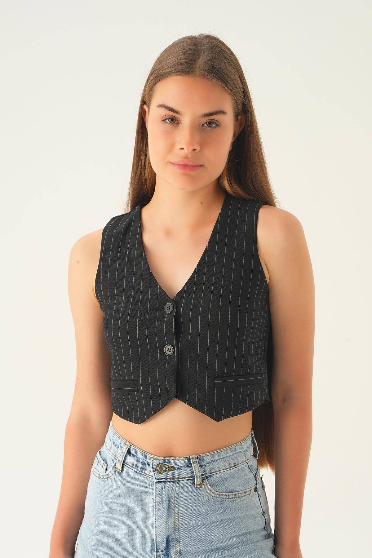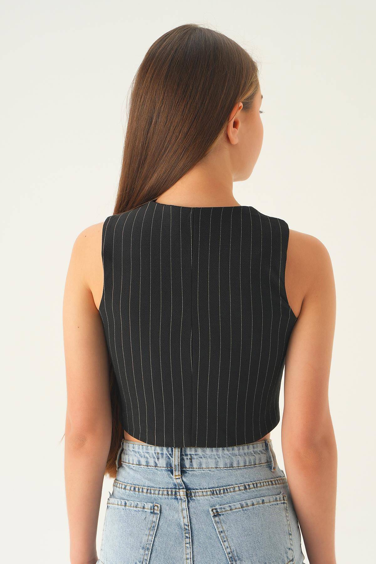 6879A Düğme Detay Çizgili Yelek Siyah