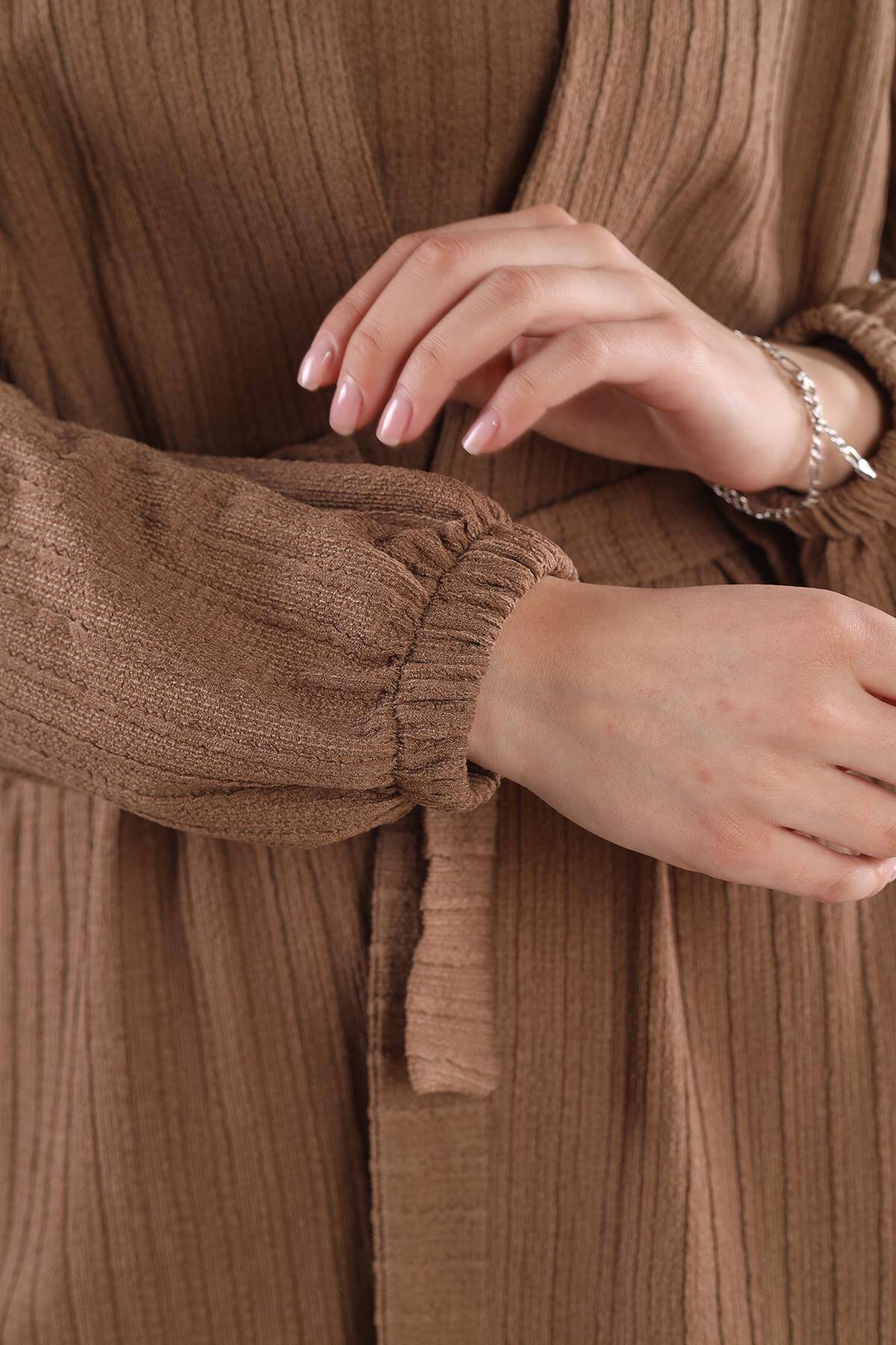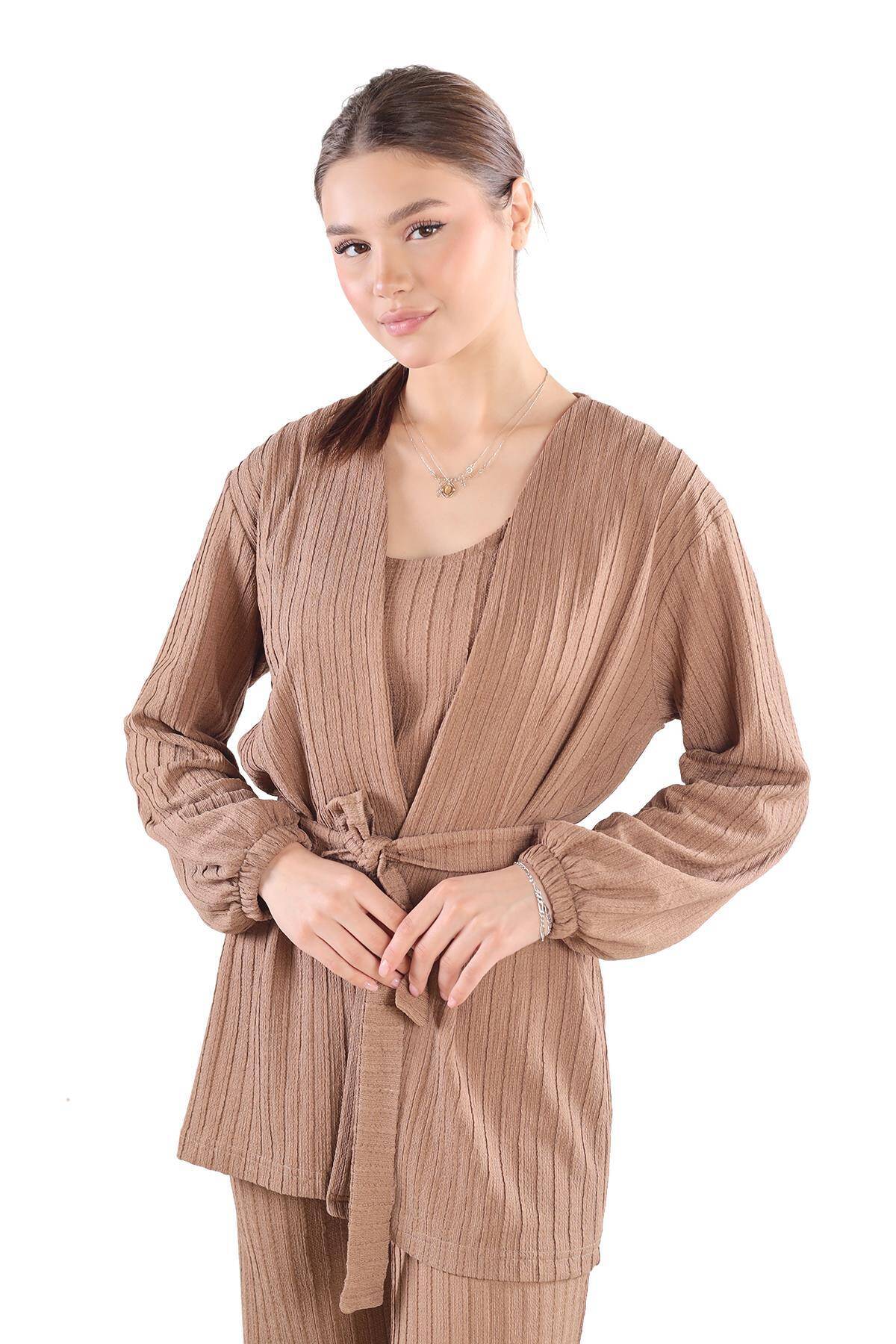 7002 3'lü Kimono Bluz Pantolon Takım Vizon