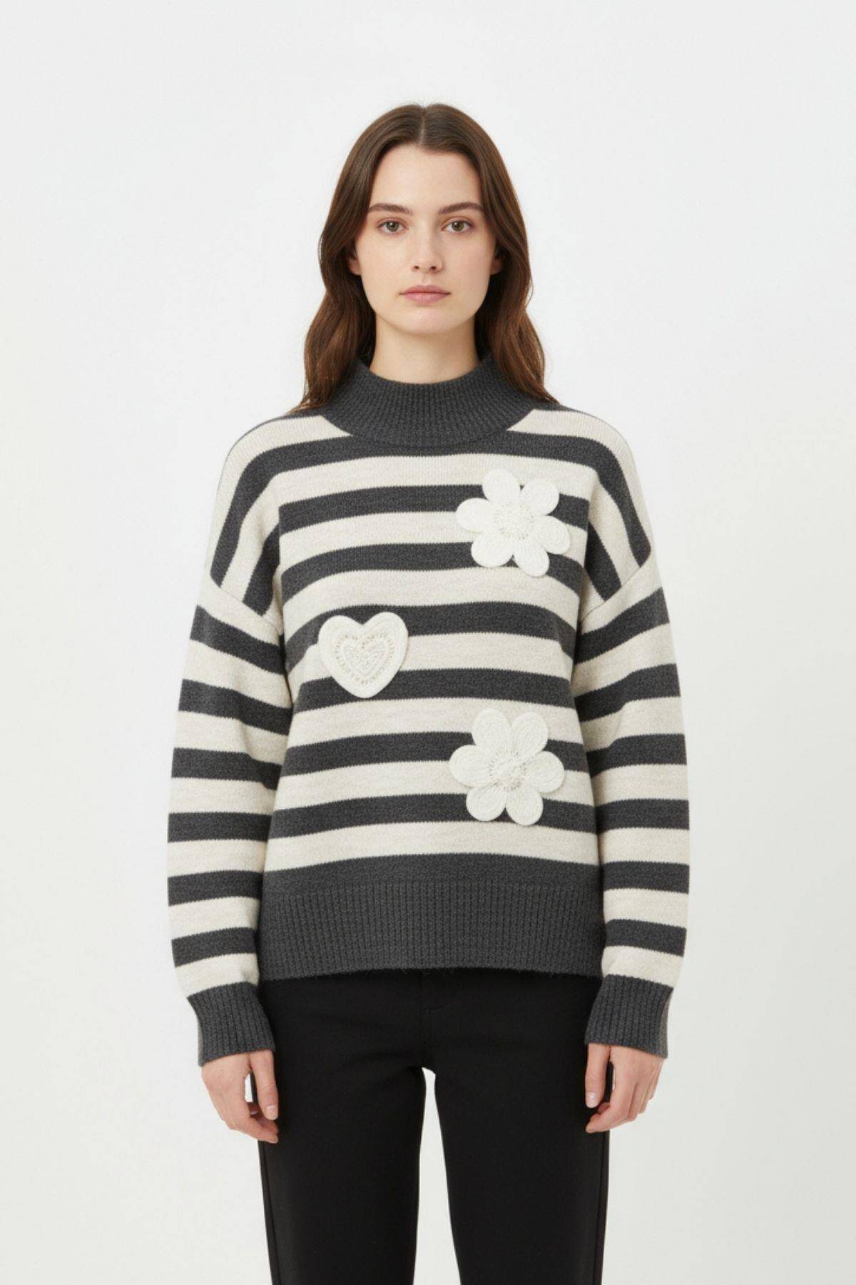 7090 Çizgili Süs Detay Kazak