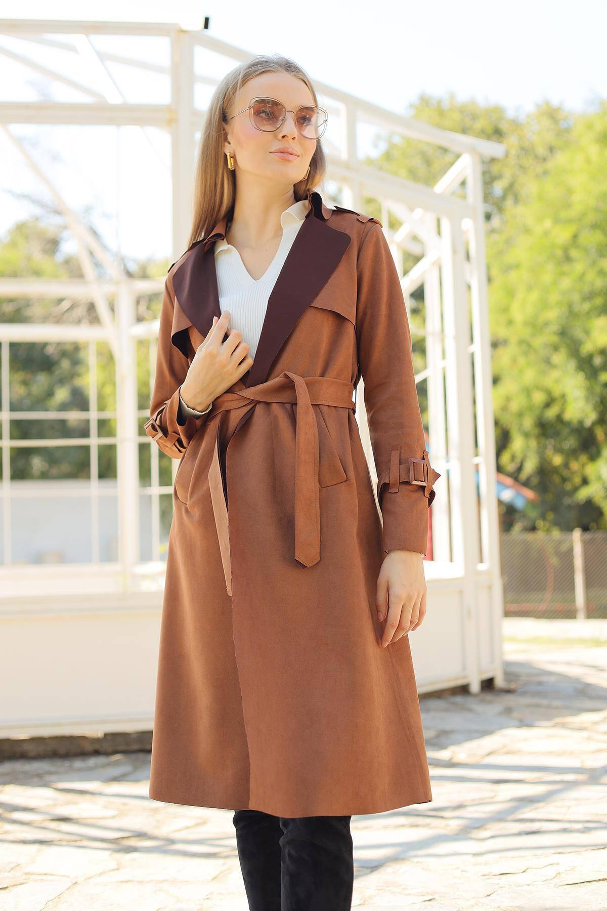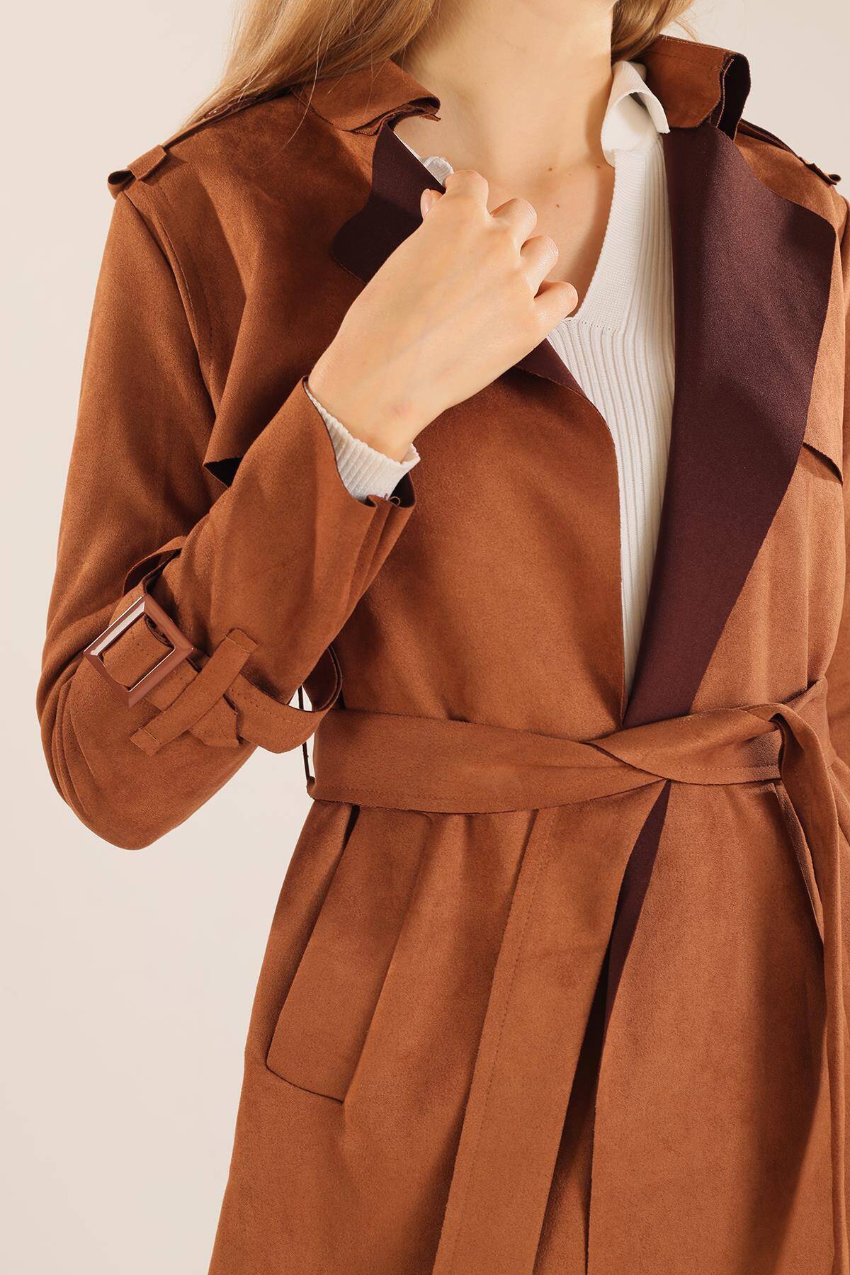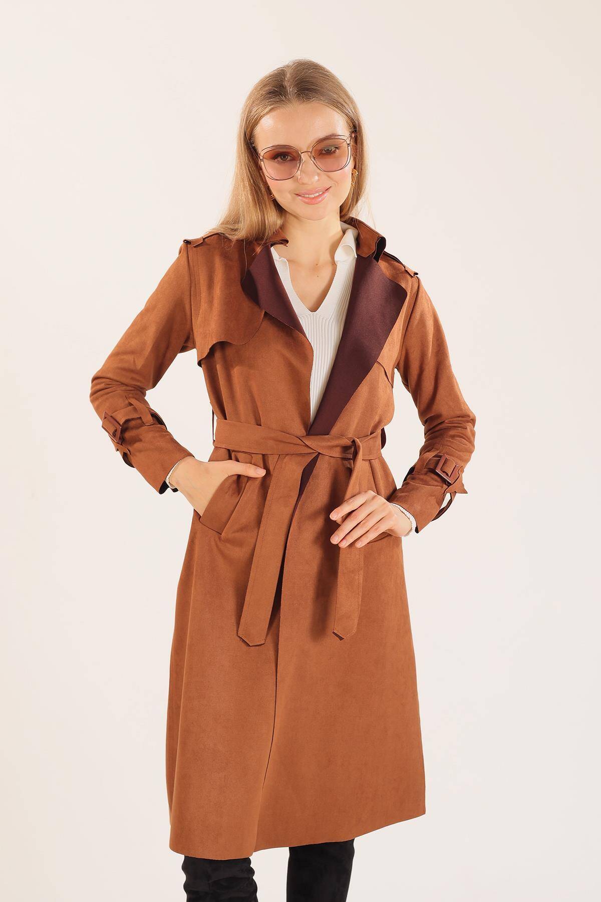 7275A Bel Bağlamalı Süet Trençkot Taba