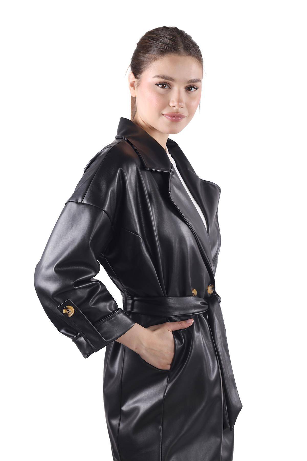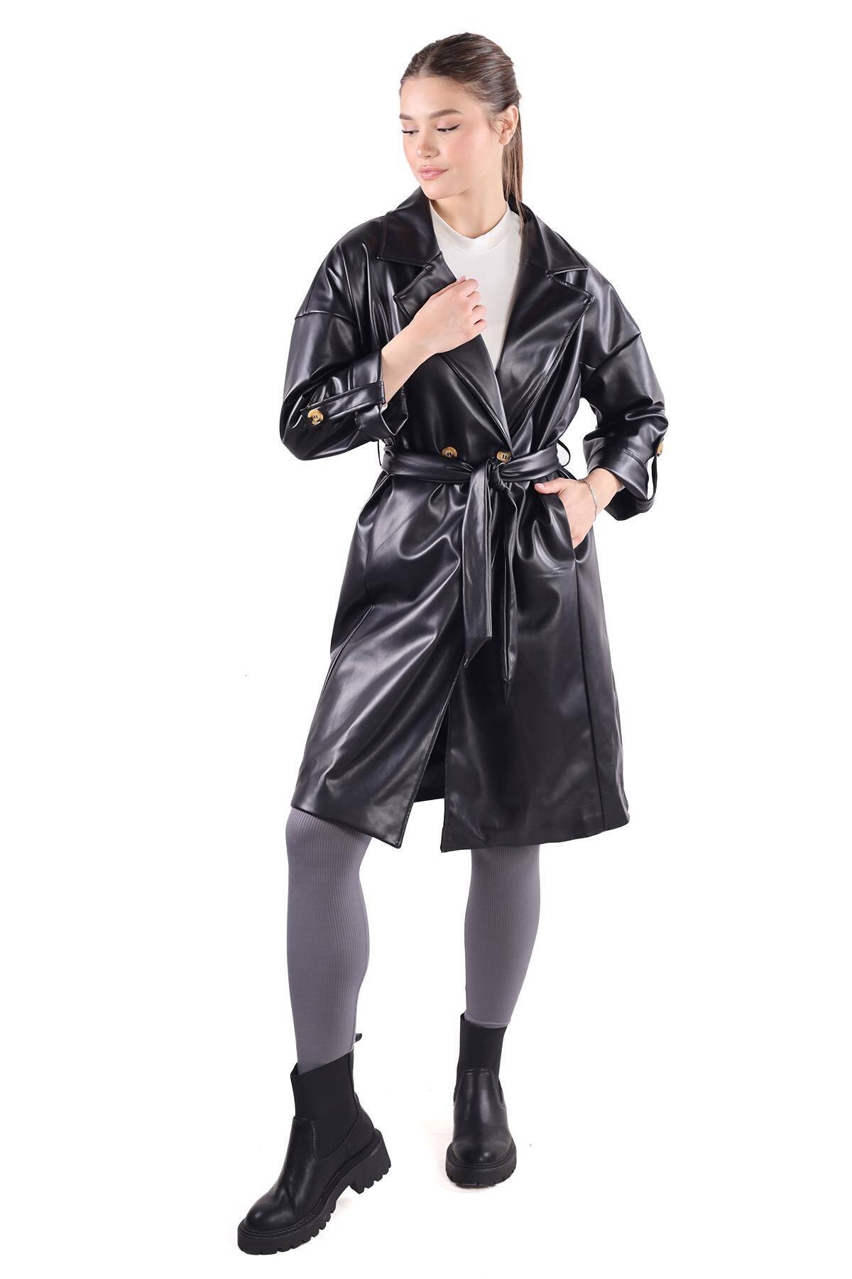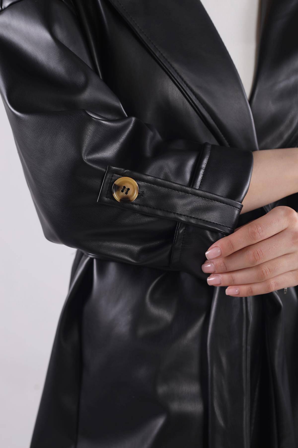 7327A Düğme Detay Kemerli Suni Deri Trençkot Siyah