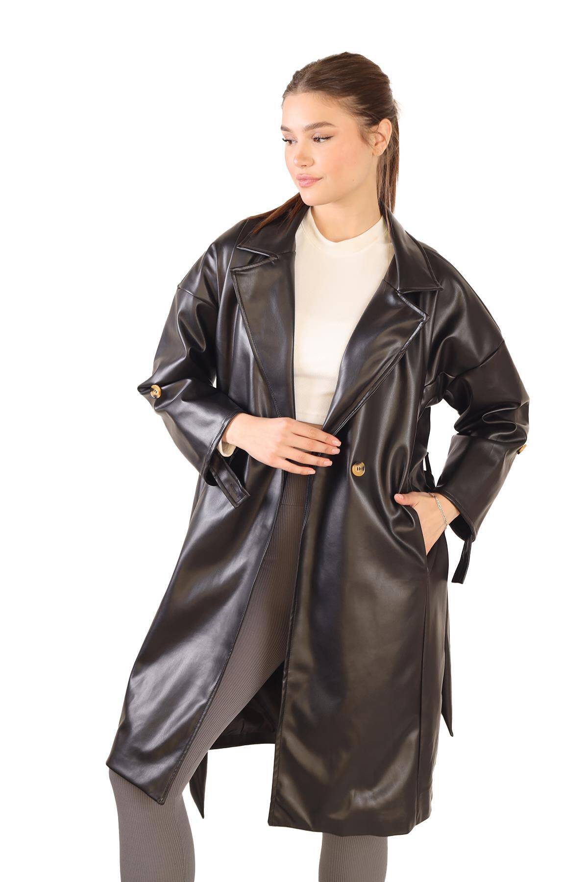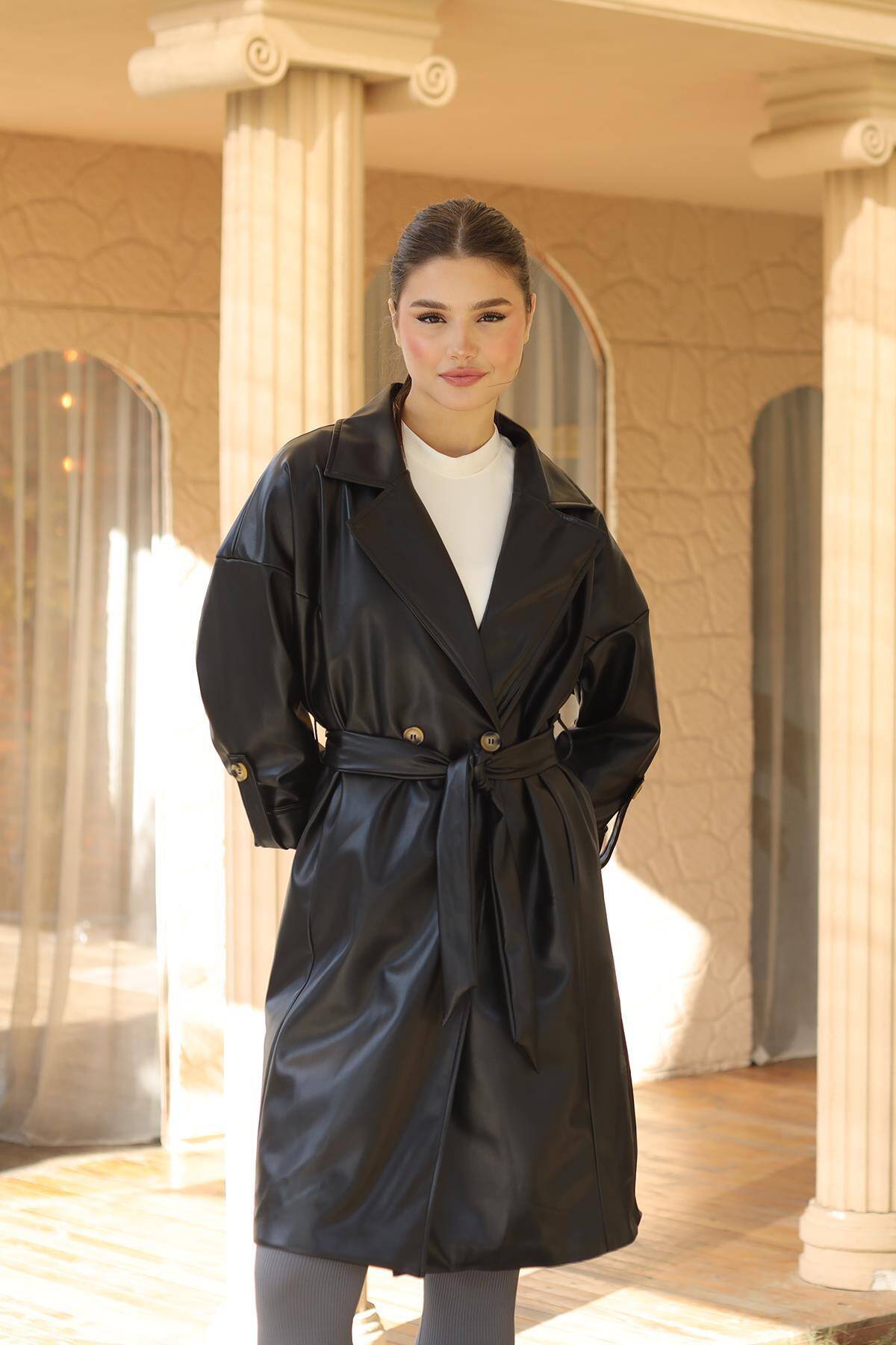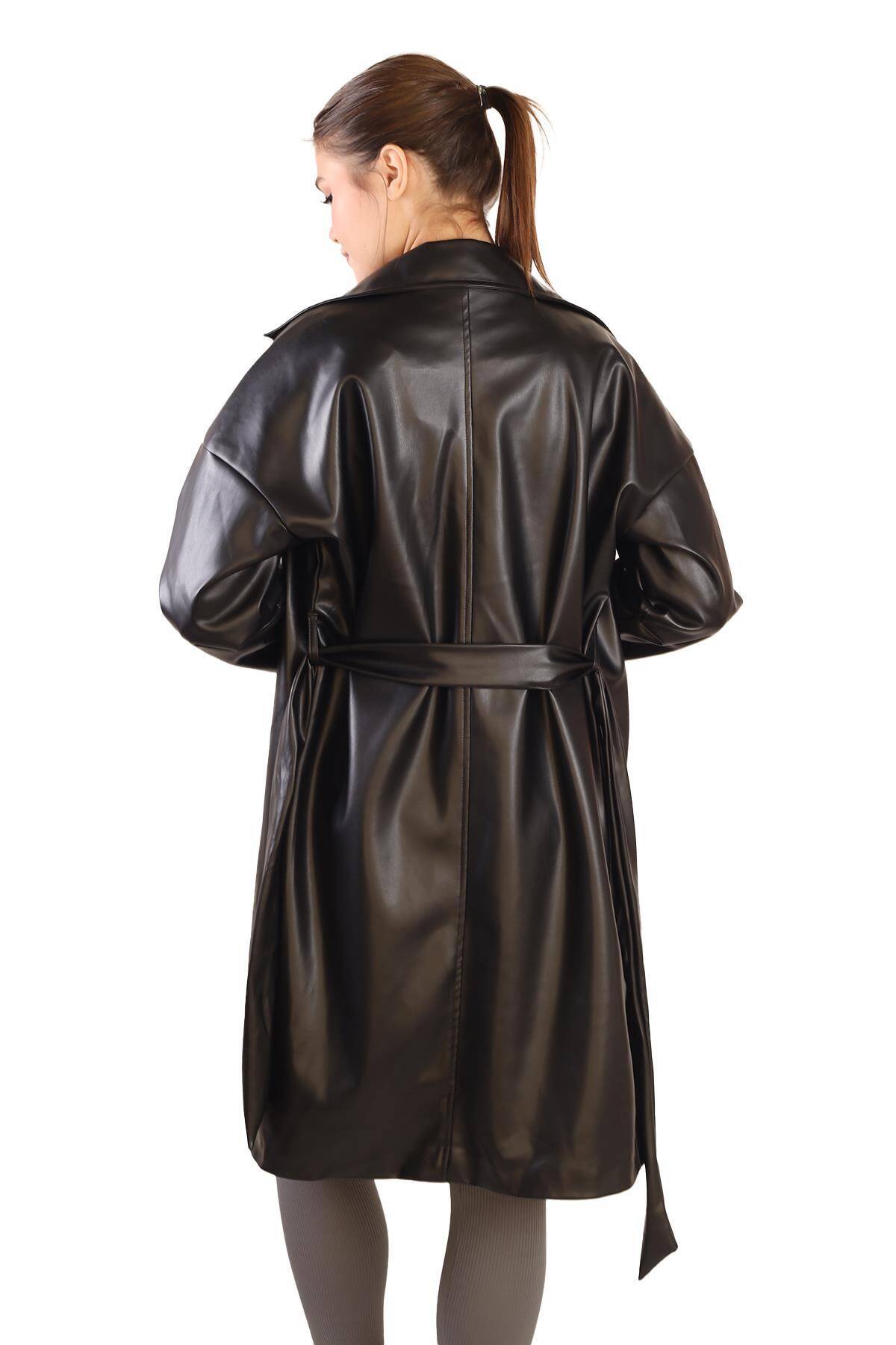 7327A Düğme Detay Kemerli Suni Deri Trençkot Siyah