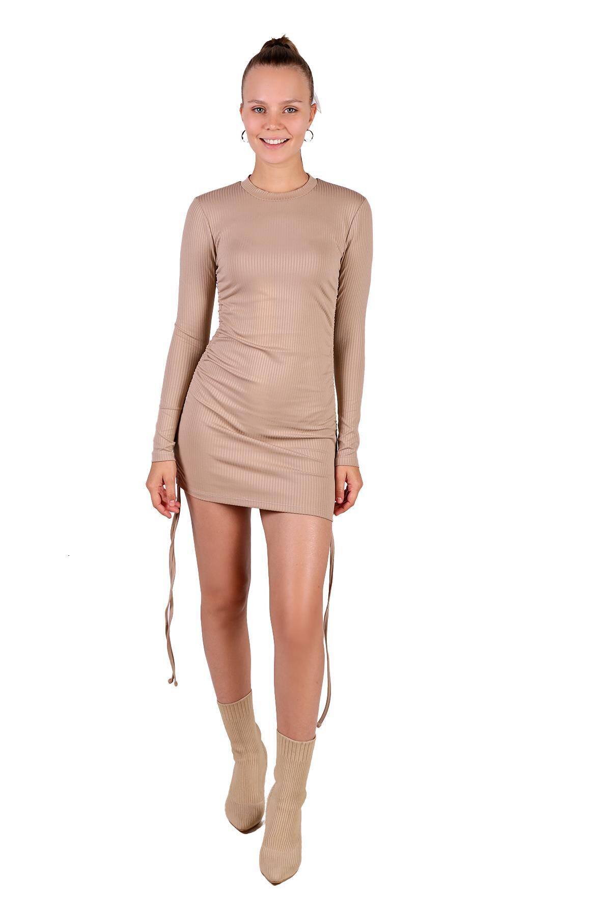 9164M Yan Büzgülü Fitilli Elbise Taş