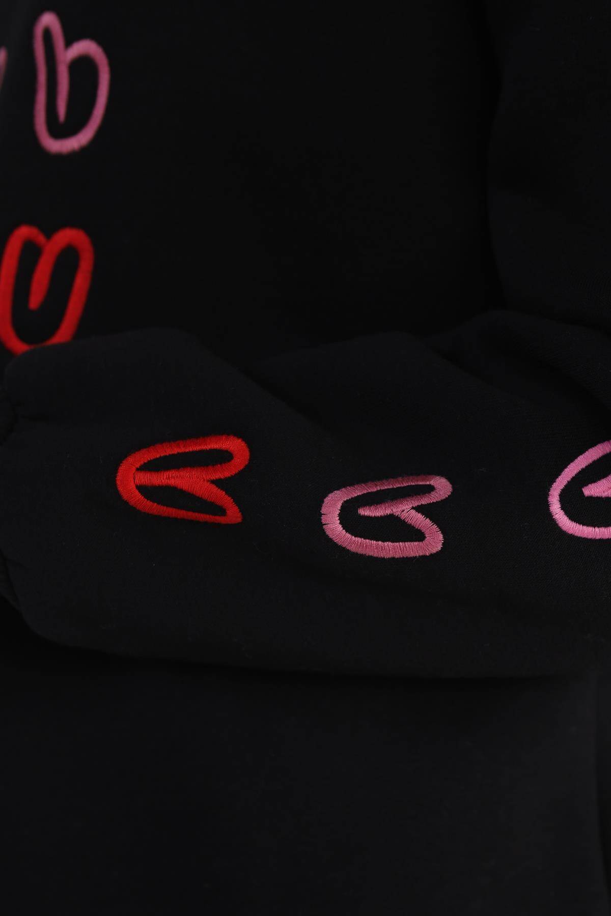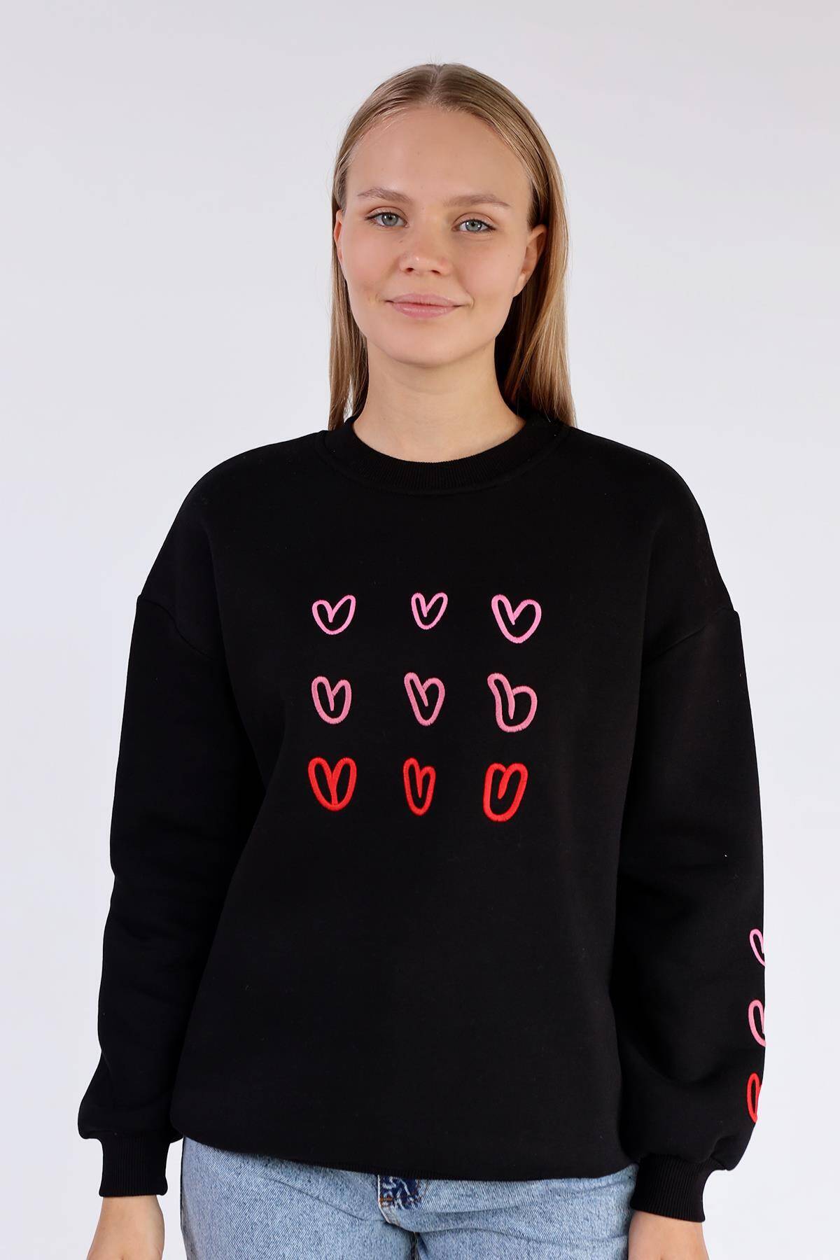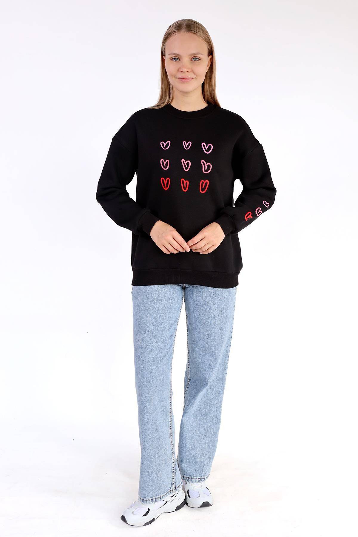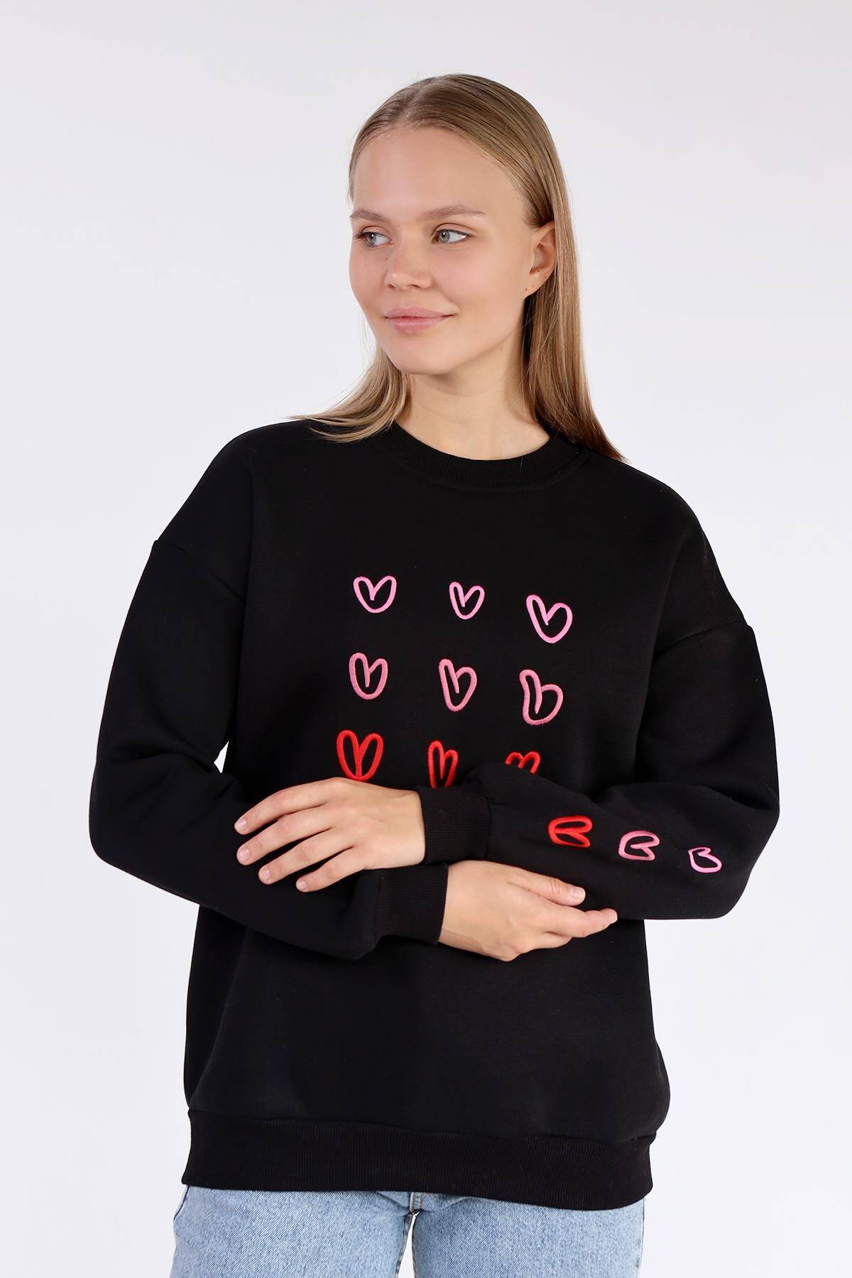 9175M Bisiklet Yaka Kalp Nakışlı Sweat Siyah