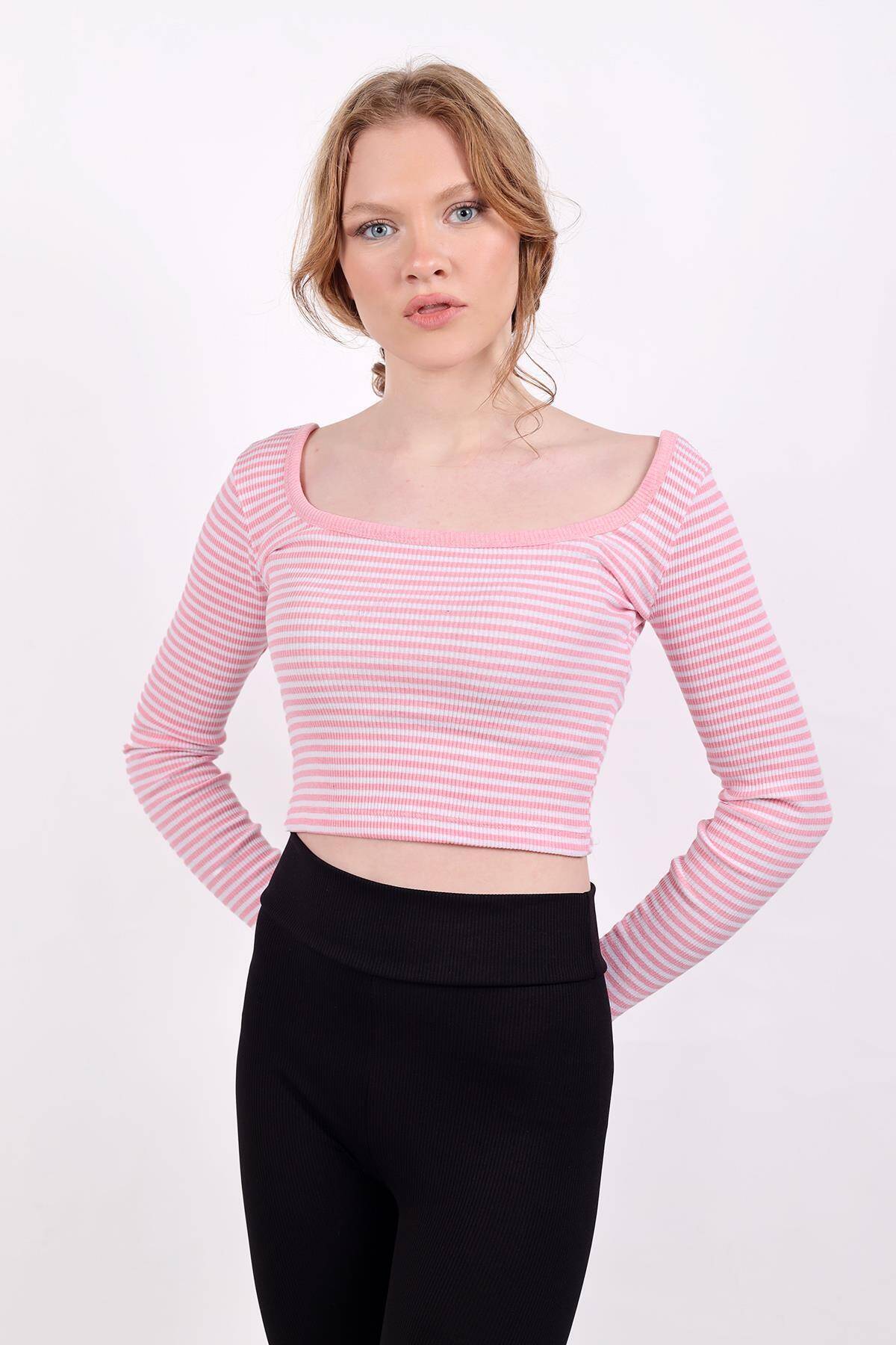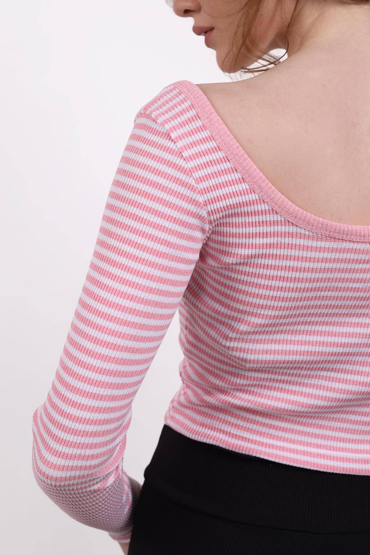 9904 Kare Yaka Çizgili Crop Bluz Pembe