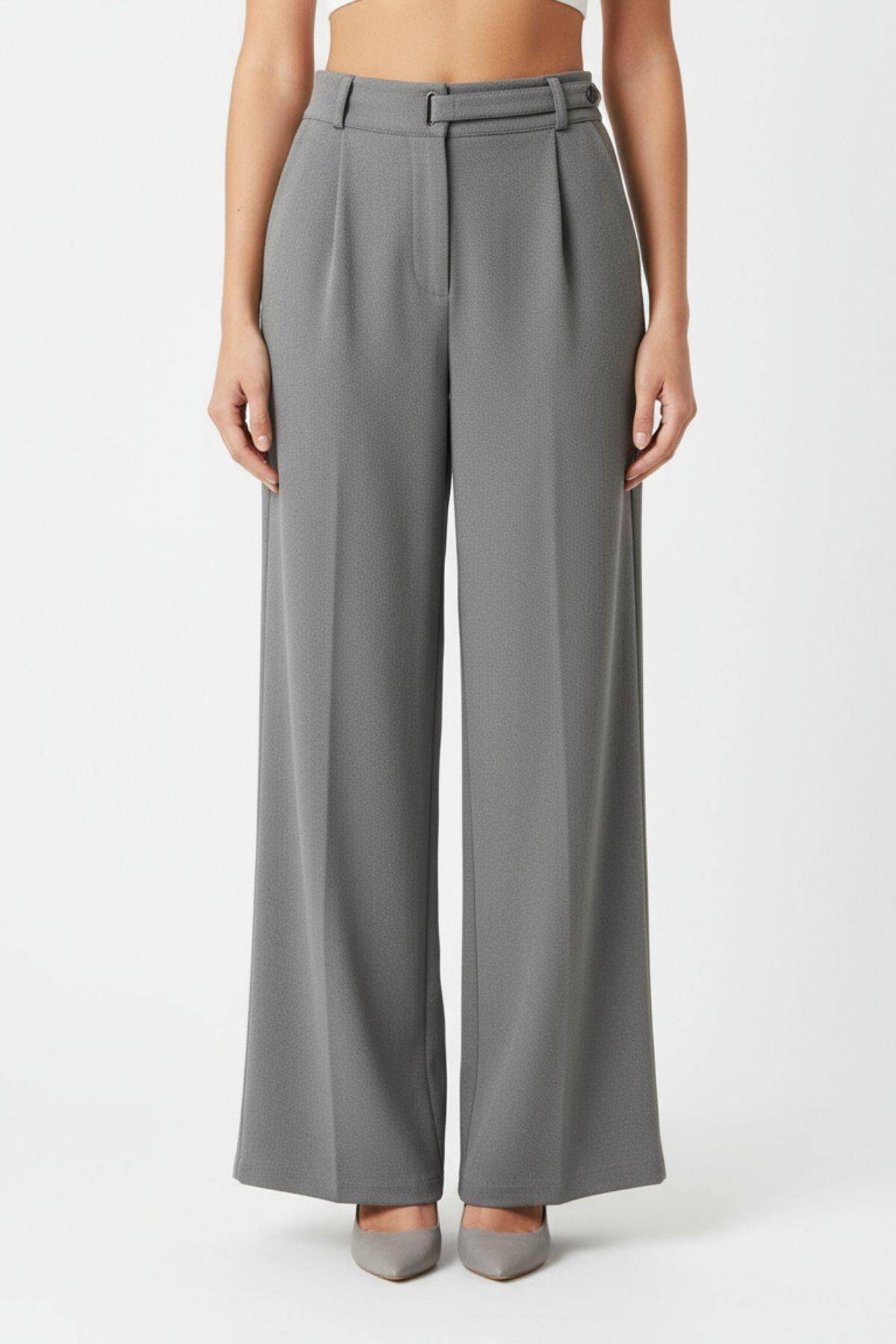 Antrasit Kemerli Yüksek Bel Bol Paça Kadın Pantolon 8147A
